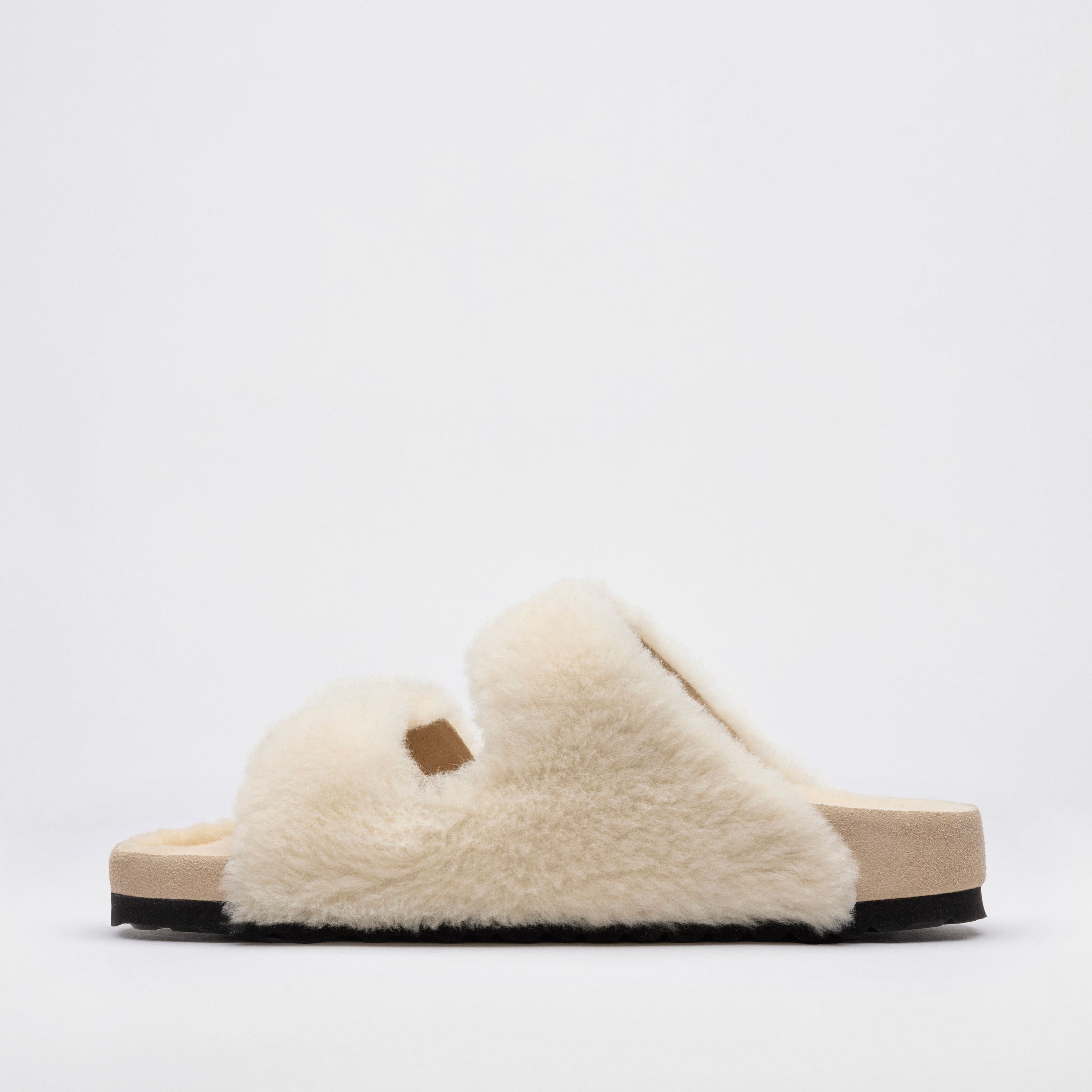 Diese Neuinterpretation des Arizona ist innen und außen mit Shearling überzogen, wodurch seine klassische Silhouette in Szene gesetzt wird. Erhältlich in den Farben Karamell und Creme, verfügt jedes Paar über eine exklusive silberne 1774-Schnalle. Das Modell verfügt außerdem über das legendäre BIRKENSTOCK Fußbett, das mit Shearling überzogen ist. Die Ränder des Fußbetts sind passend zum Obermaterial mit Veloursleder bezogen. Diese Ausführung vereint eine luxuriöse Textur mit einem zeitlosen Design.