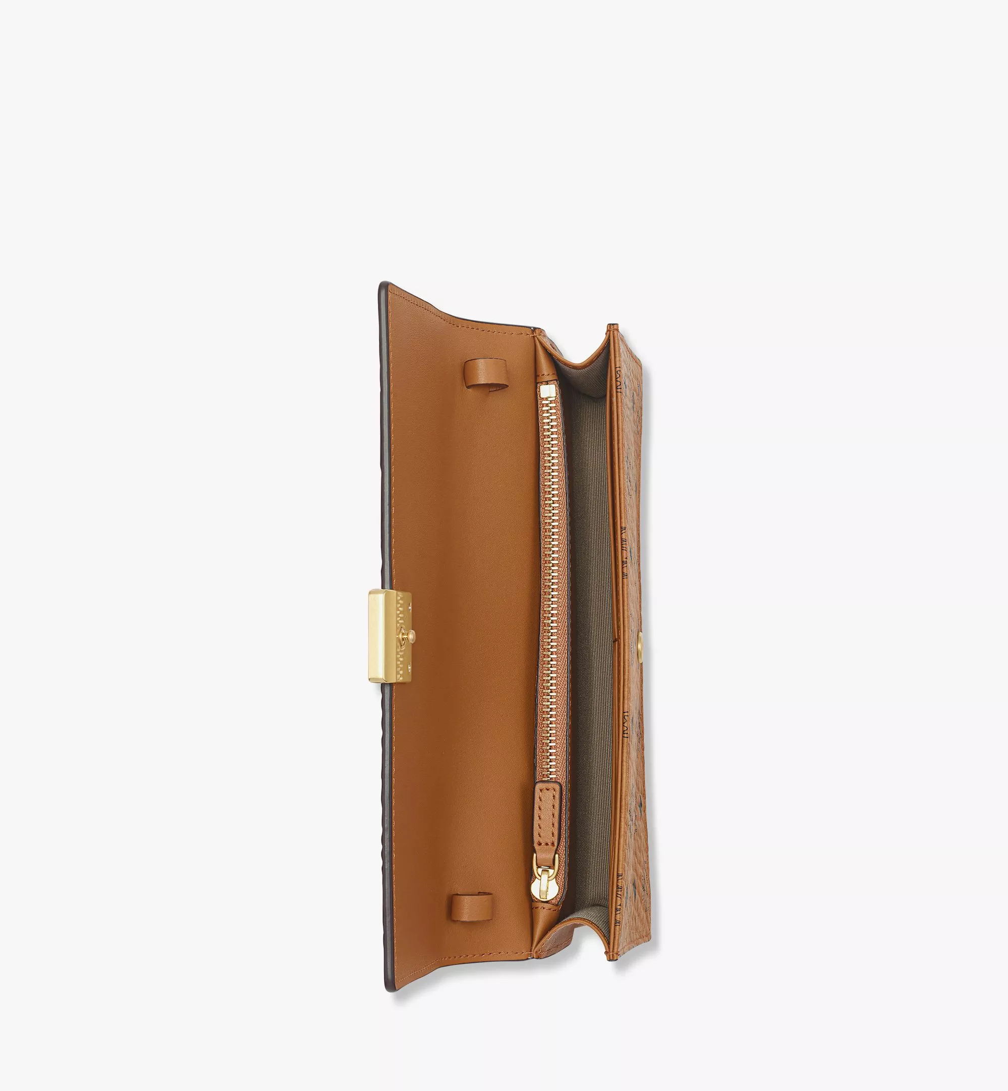 Klassische Eleganz, verbunden mit einem traditionellen Erkennungszeichen des Hauses. Nach dem Bauhaus-Prinzip des funktionalen Designs dient die ikonische Logo-Messingplatte des Münchner Hauses als Druckknopfverschluss, der den wertvollen Inhalt dieser grossen Monogramm-Geldbörse sichert.