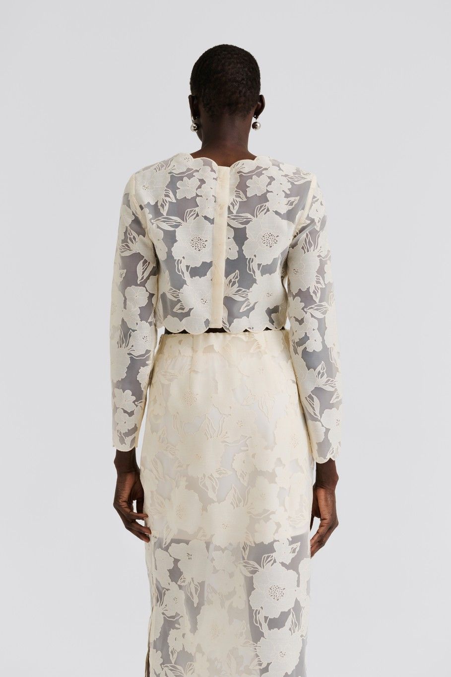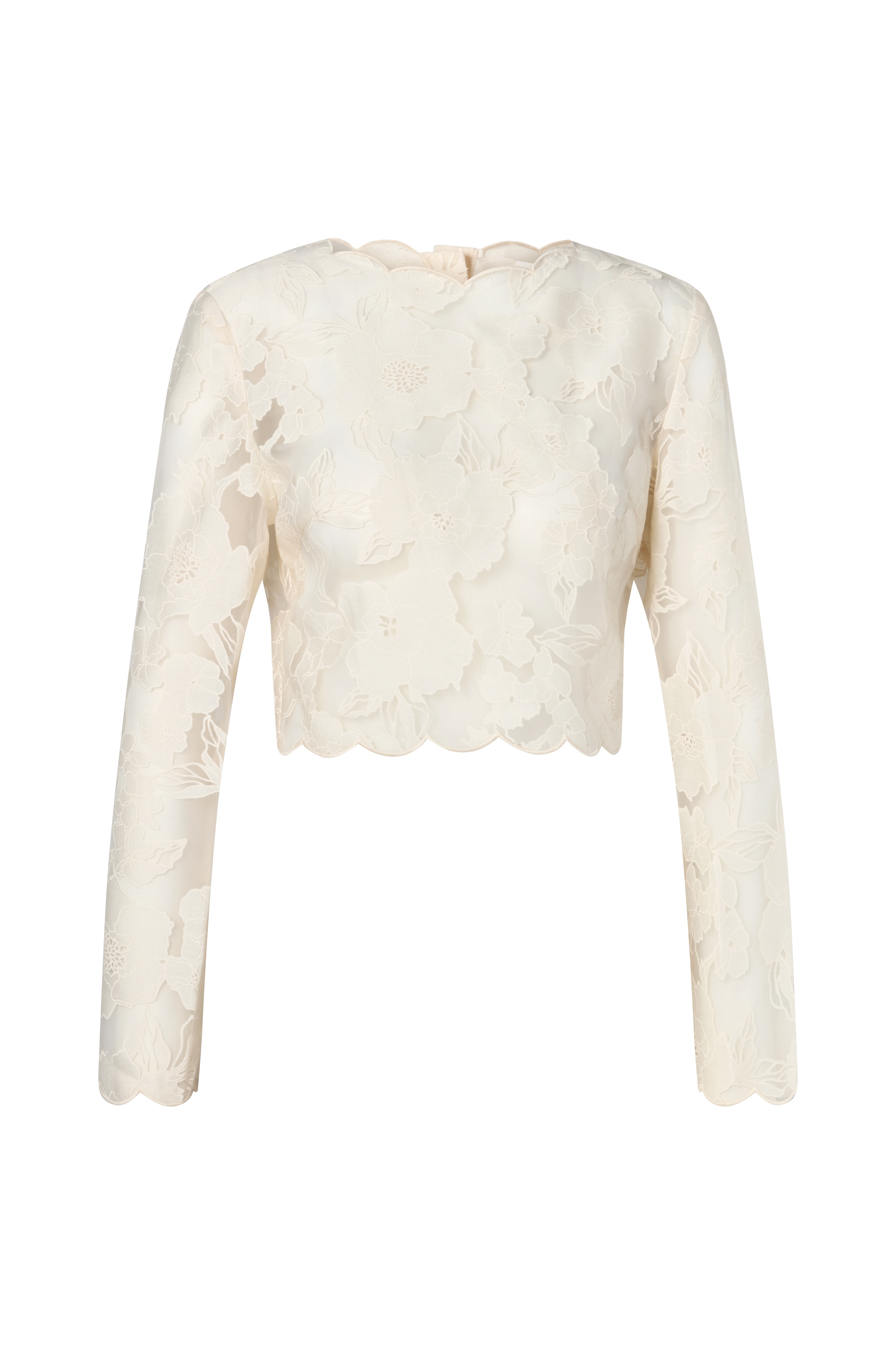 Langärmliges, transparentes Spitzentop mit Blumenmuster.