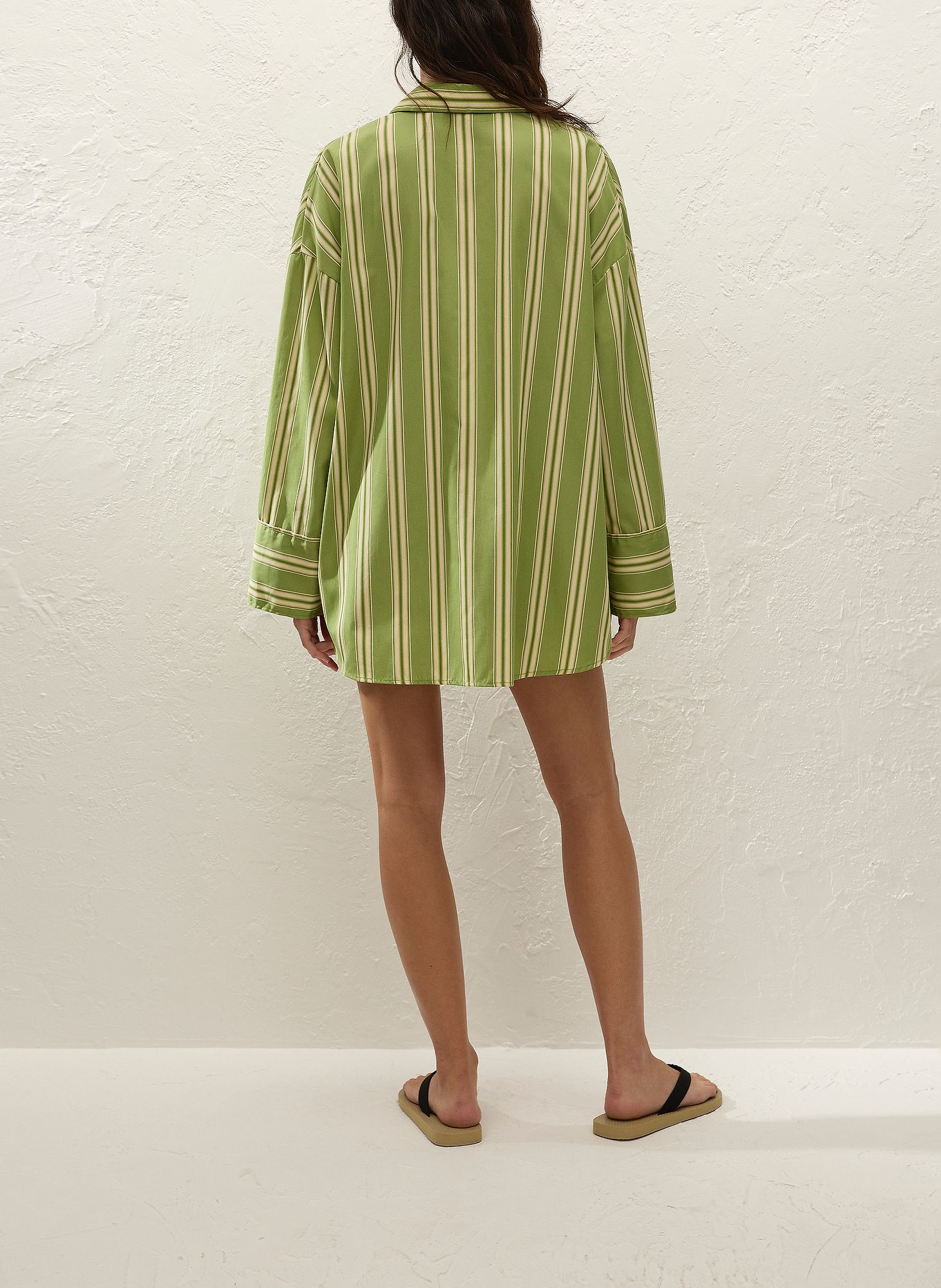 Dieses Oversize-Hemd im Boyfriend-Stil ist aus 100 % Baumwolle gefertigt und mit einem leuchtend grünen Streifenmuster versehen. Es besticht durch einen klassischen Kragen, eine Knopfleiste, eine Brusttasche und weite Ärmelbündchen. Der lässige Schnitt sorgt für unkomplizierten Tragekomfort. Kombinieren Sie es mit den passenden Lonia Shorts oder tragen Sie es über Ihrer Badehose für lange Tage am Meer.