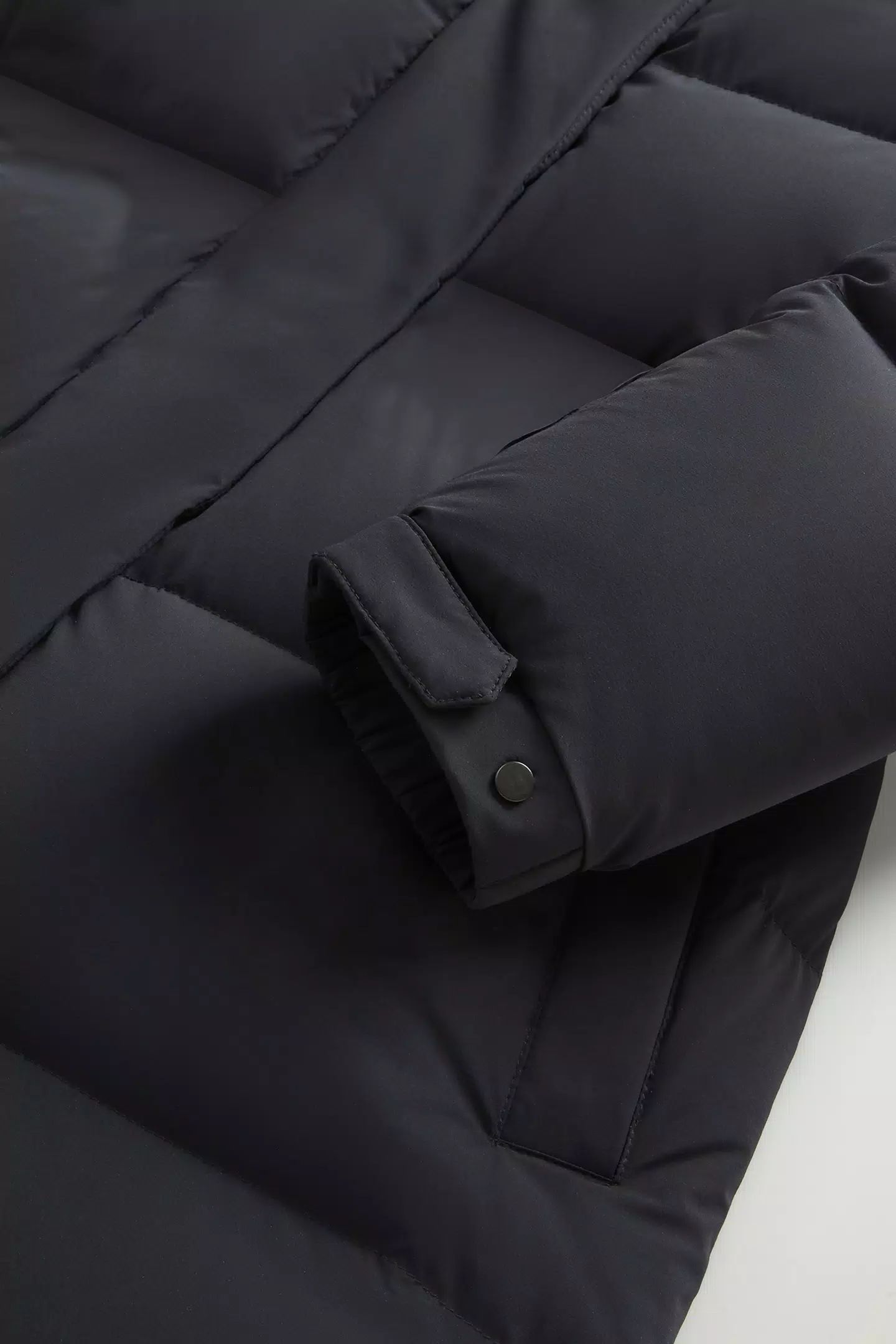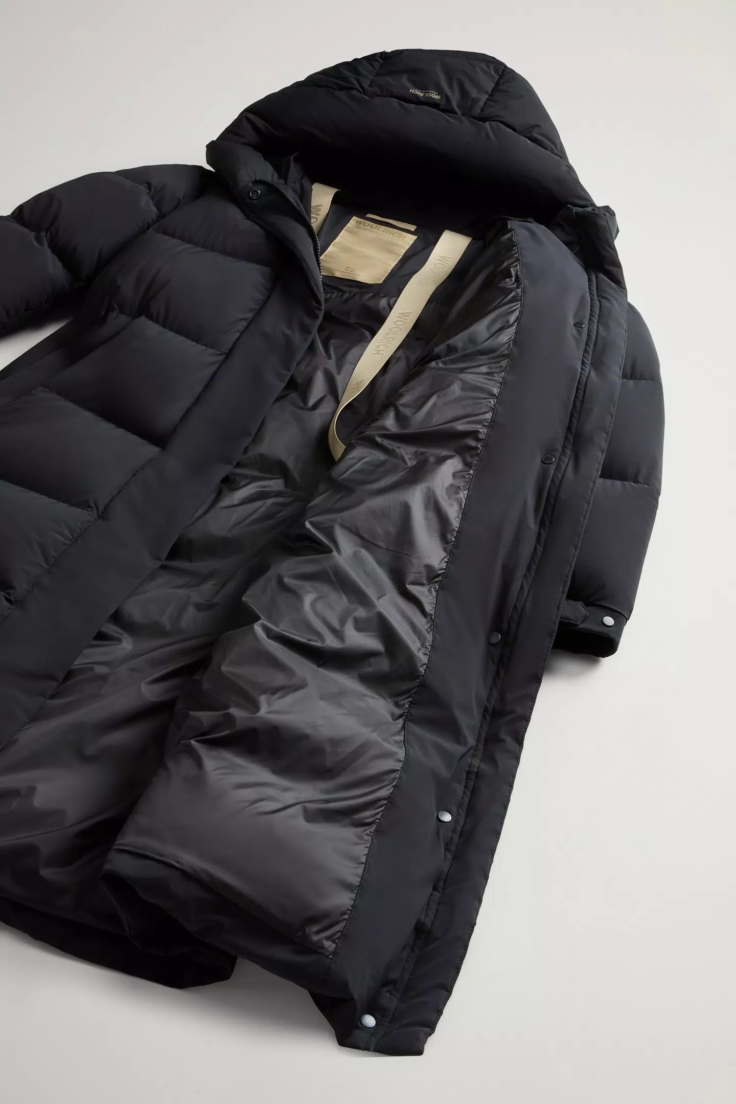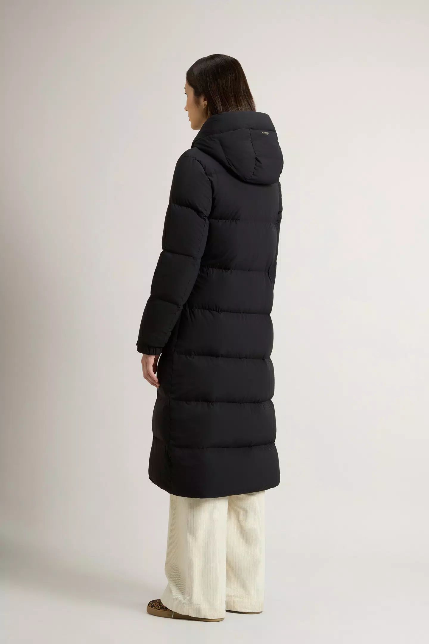Diese lange Daunenjacke der Cloud Series, unserer Capsule Collection mit warmer und zugleich federleichter Oberbekleidung, vereint Komfort und Funktionalität in einem klassischen Design und bietet optimalen Schutz an kalten Wintertagen. Das wasserabweisende und windbeständige Modell aus Stretchnylon zeichnet sich durch ein elegantes mattes Finish aus. Es ist mit Entendaunen gefüttert und mit einer Quersteppung versehen, für angenehme Wärme, ohne zu beschweren. Die Kapuze bietet zusätzlichen Schutz, während der verdeckte Frontverschluss mit Reissverschluss und Knöpfen in einem klaren und schlichten Design gehalten ist. Durch die funktionalen Innenträger lässt sich die Jacke beim Betreten geschlossener Räume bequem über der Schulter tragen. Die Paspeltaschen sind ein praktisches Detail, während die verstellbaren Ärmelabschlüsse mit Riegel und Druckknopf für eine bequeme Passform sorgen. Das Logo auf der Kapuze und entlang der Seite vervollständigen das Modell.