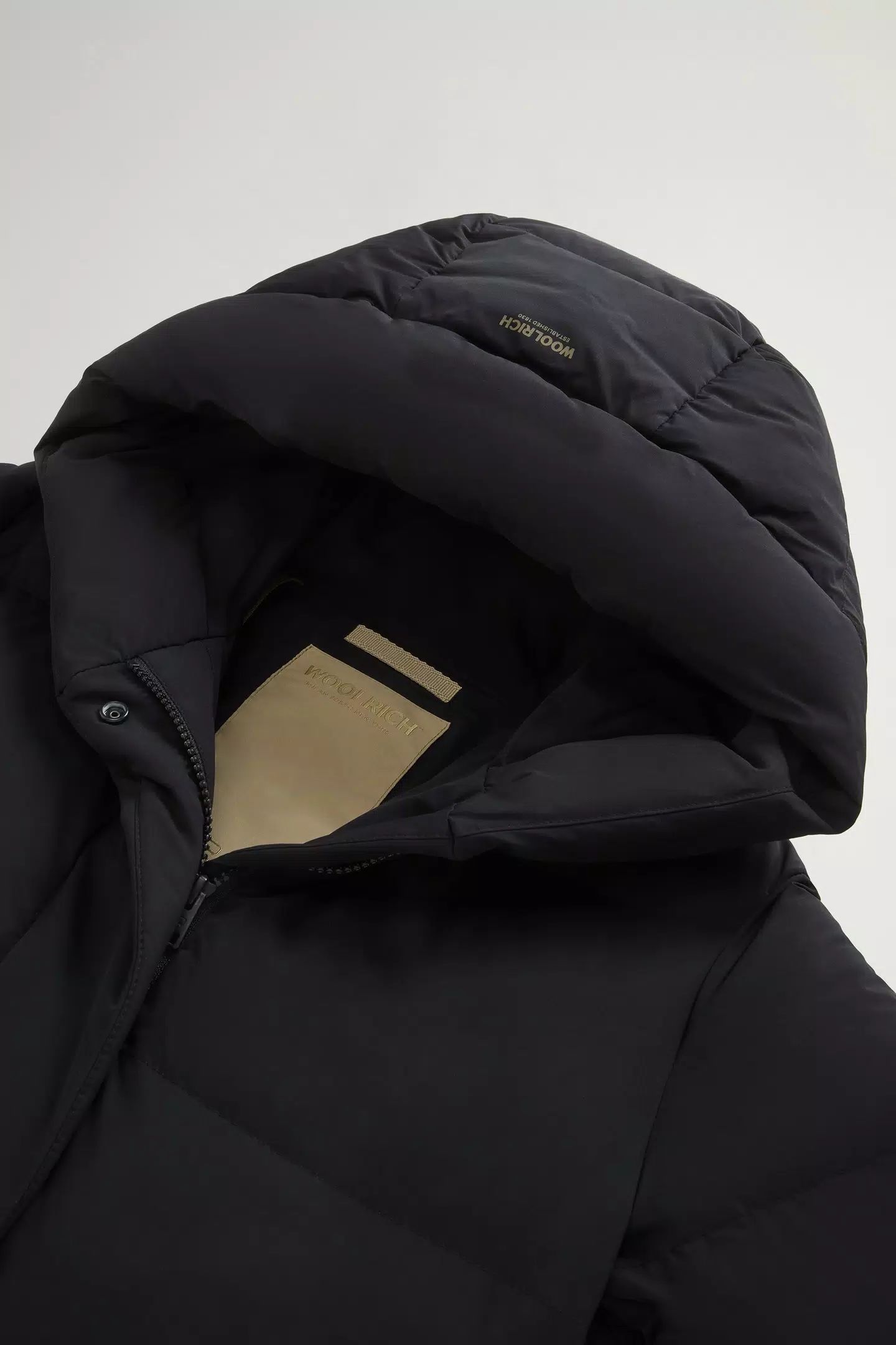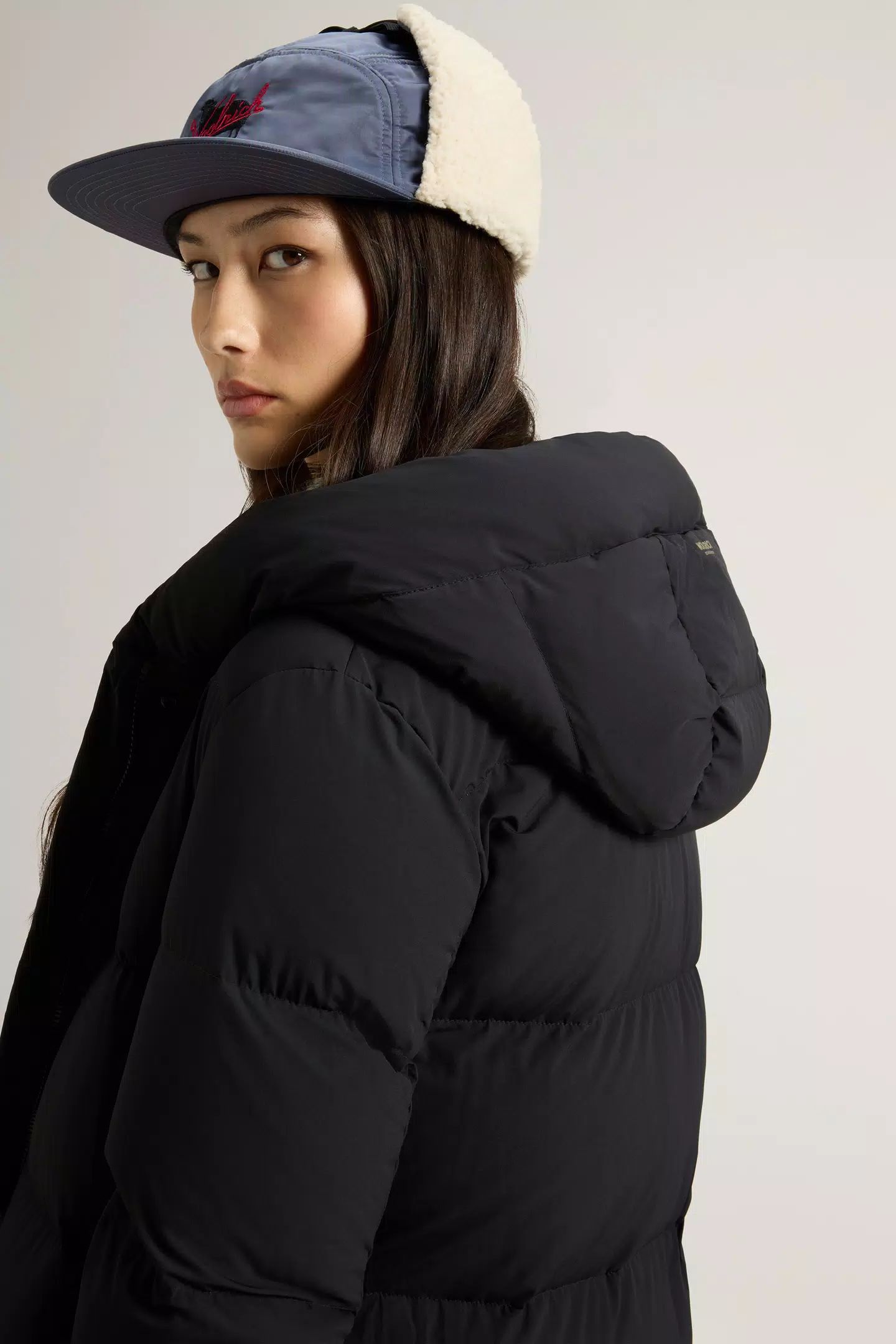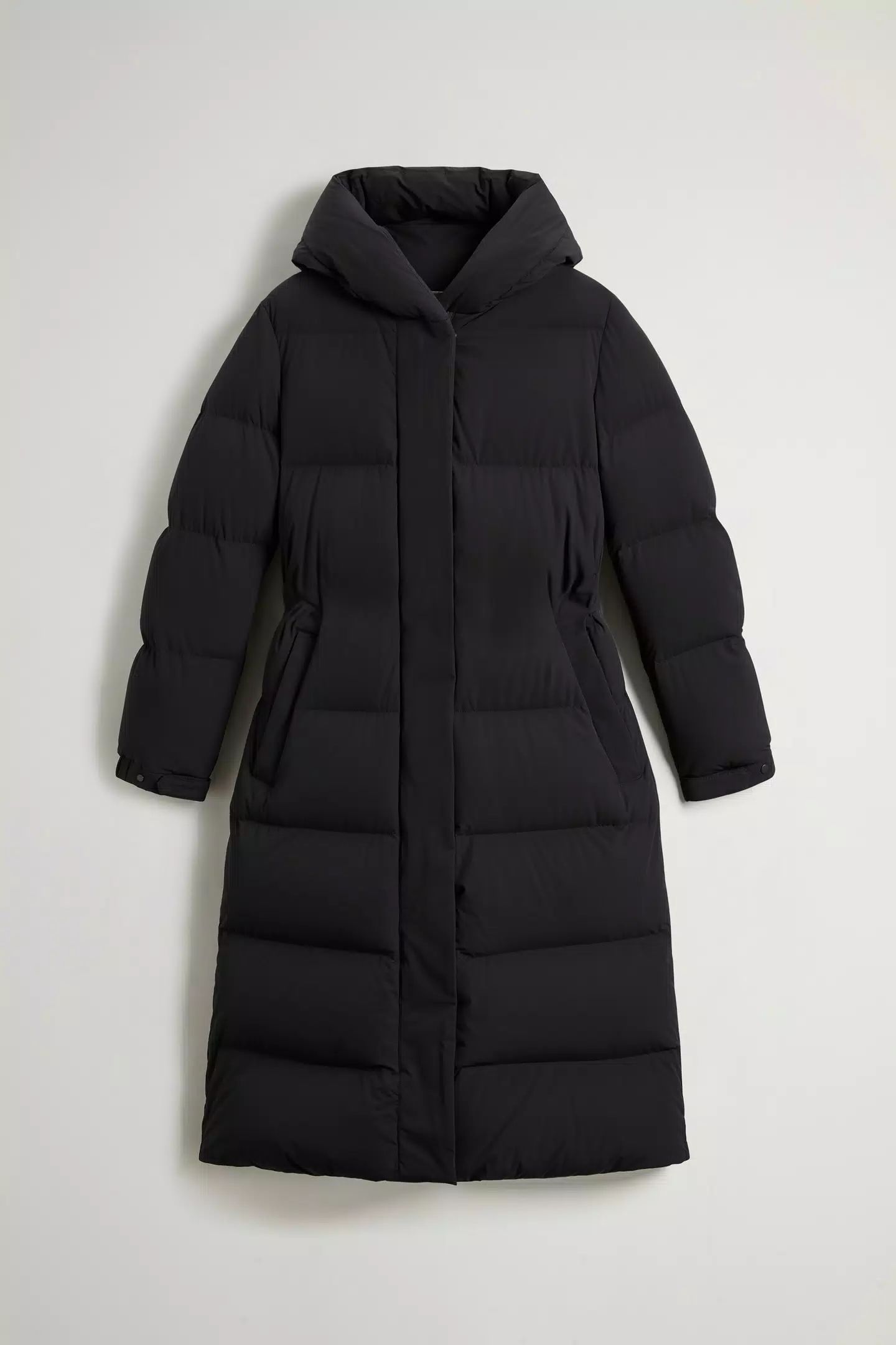 Diese lange Daunenjacke der Cloud Series, unserer Capsule Collection mit warmer und zugleich federleichter Oberbekleidung, vereint Komfort und Funktionalität in einem klassischen Design und bietet optimalen Schutz an kalten Wintertagen. Das wasserabweisende und windbeständige Modell aus Stretchnylon zeichnet sich durch ein elegantes mattes Finish aus. Es ist mit Entendaunen gefüttert und mit einer Quersteppung versehen, für angenehme Wärme, ohne zu beschweren. Die Kapuze bietet zusätzlichen Schutz, während der verdeckte Frontverschluss mit Reissverschluss und Knöpfen in einem klaren und schlichten Design gehalten ist. Durch die funktionalen Innenträger lässt sich die Jacke beim Betreten geschlossener Räume bequem über der Schulter tragen. Die Paspeltaschen sind ein praktisches Detail, während die verstellbaren Ärmelabschlüsse mit Riegel und Druckknopf für eine bequeme Passform sorgen. Das Logo auf der Kapuze und entlang der Seite vervollständigen das Modell.