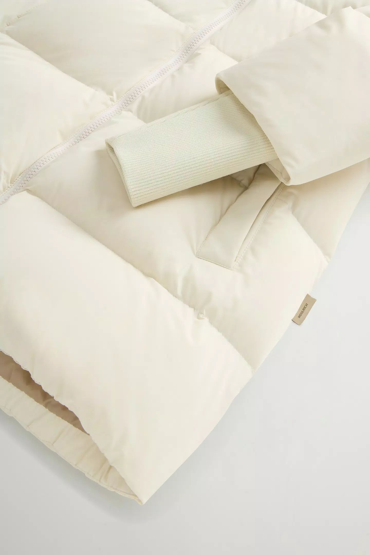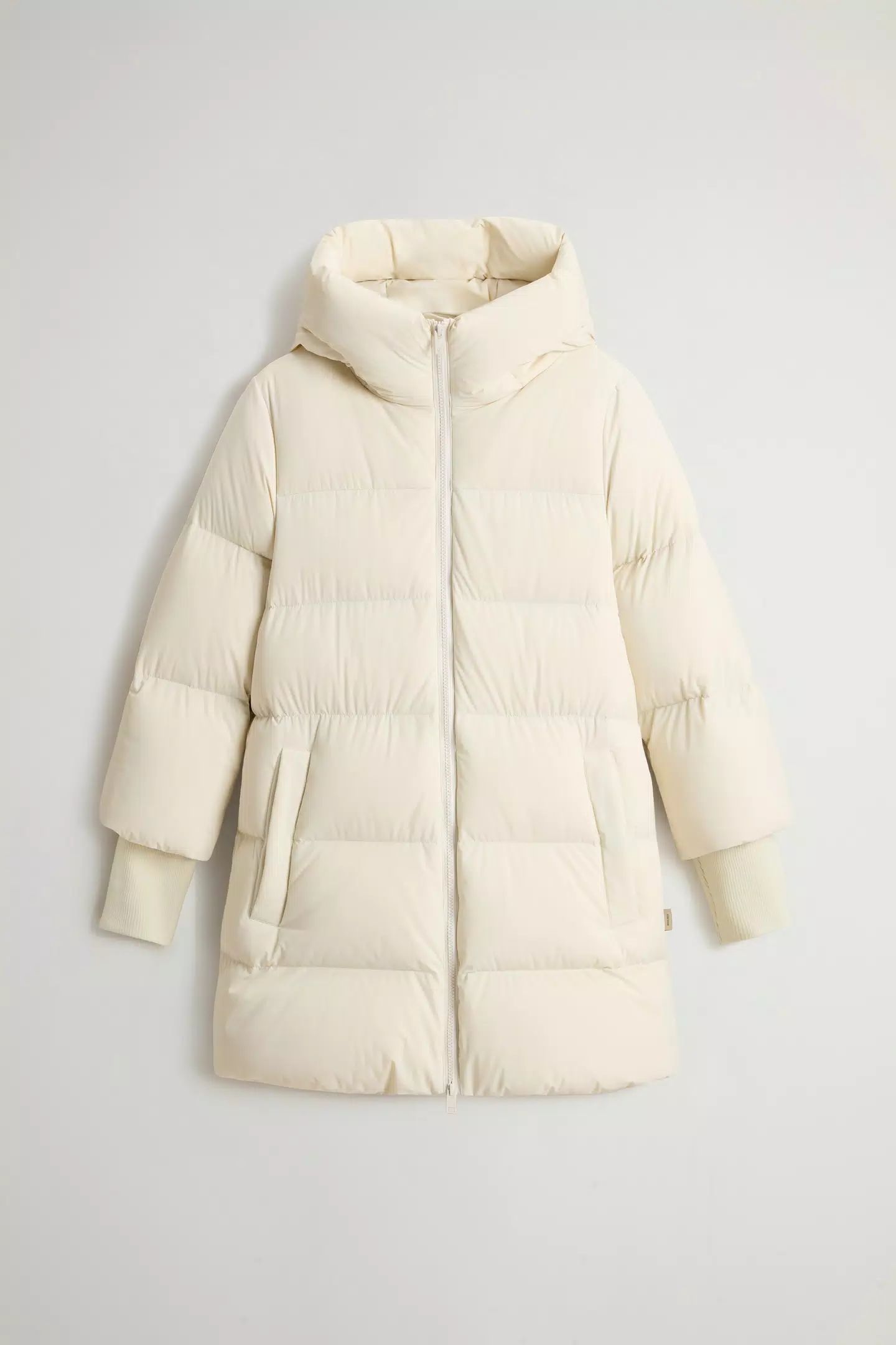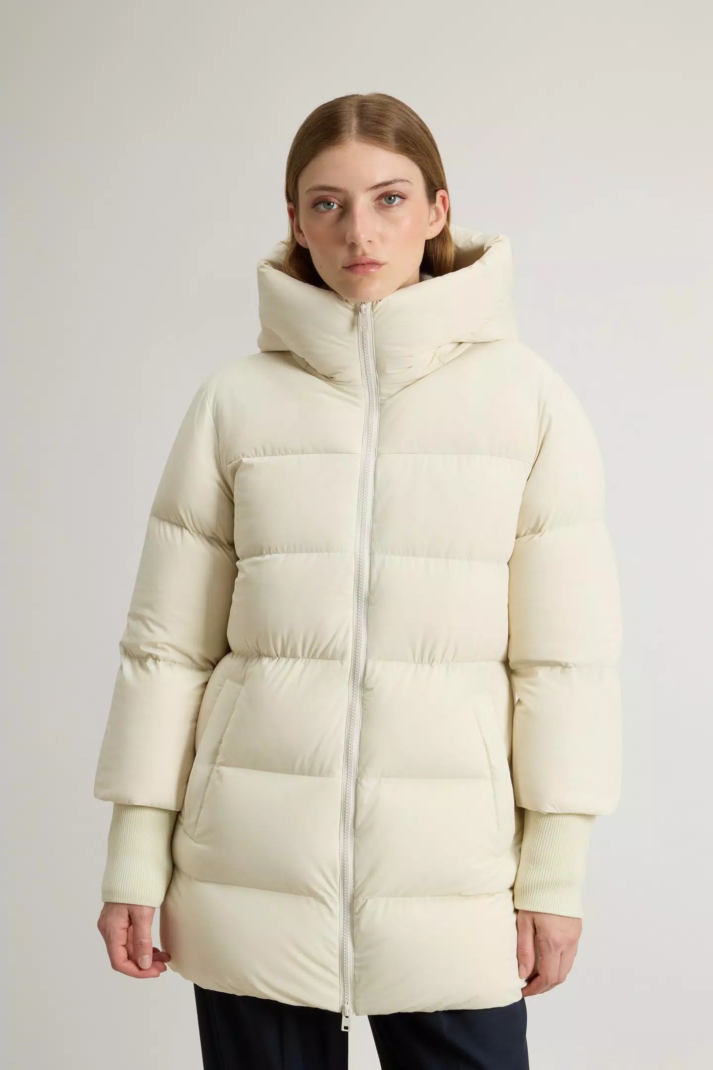 Diese Daunenjacke unserer Cloud Series, der Capsule Collection mit warmer und zugleich federleichter Oberbekleidung, ist perfekt für kalte Wintertage. Die Jacke aus Stretchnylon mit mattem Finish ist wasser- und windbeständig und mit weichen Entendaunen gefüttert, die bei Ihren Outdoor-Aktivitäten für Wärme sorgen. Das Modell mit Kapuze für zusätzlichen Schutz verfügt über einen Zwei-Wege-Reissverschluss, einen Innenkordelzug an der Taille und Innenträger, durch die es sich beim Betreten geschlossener Räume bequem über der Schulter tragen lässt. Die seitlichen Paspeltaschen sind ein praktisches Detail, während die Rippbündchen und das seitliche Etikett das Design abrunden.