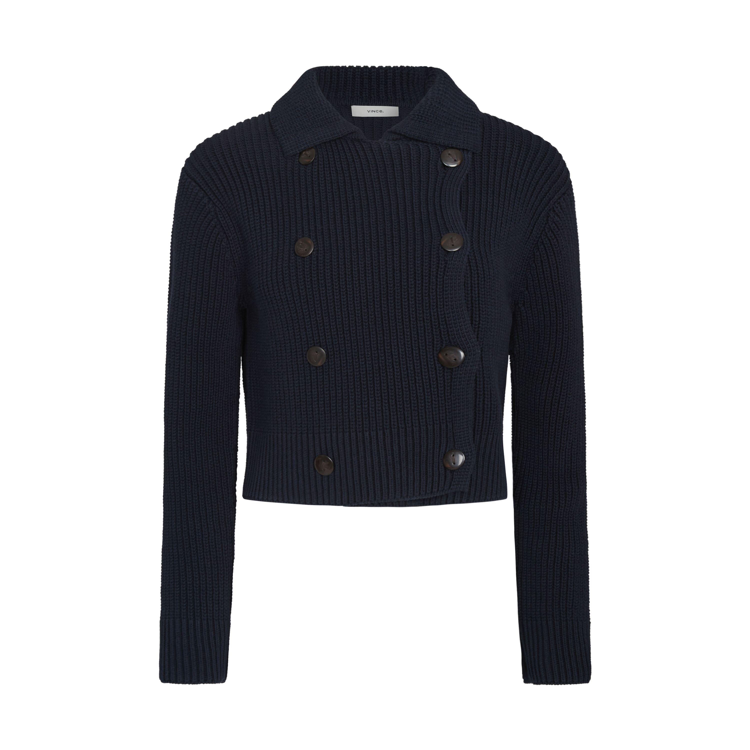 Dieser von einem Peacoat inspirierte Pullover ist aus einer robusten, aber weichen Shaker-Stich-Baumwollmischung gefertigt und verfügt über einen echten doppelreihigen Knopfverschluss.