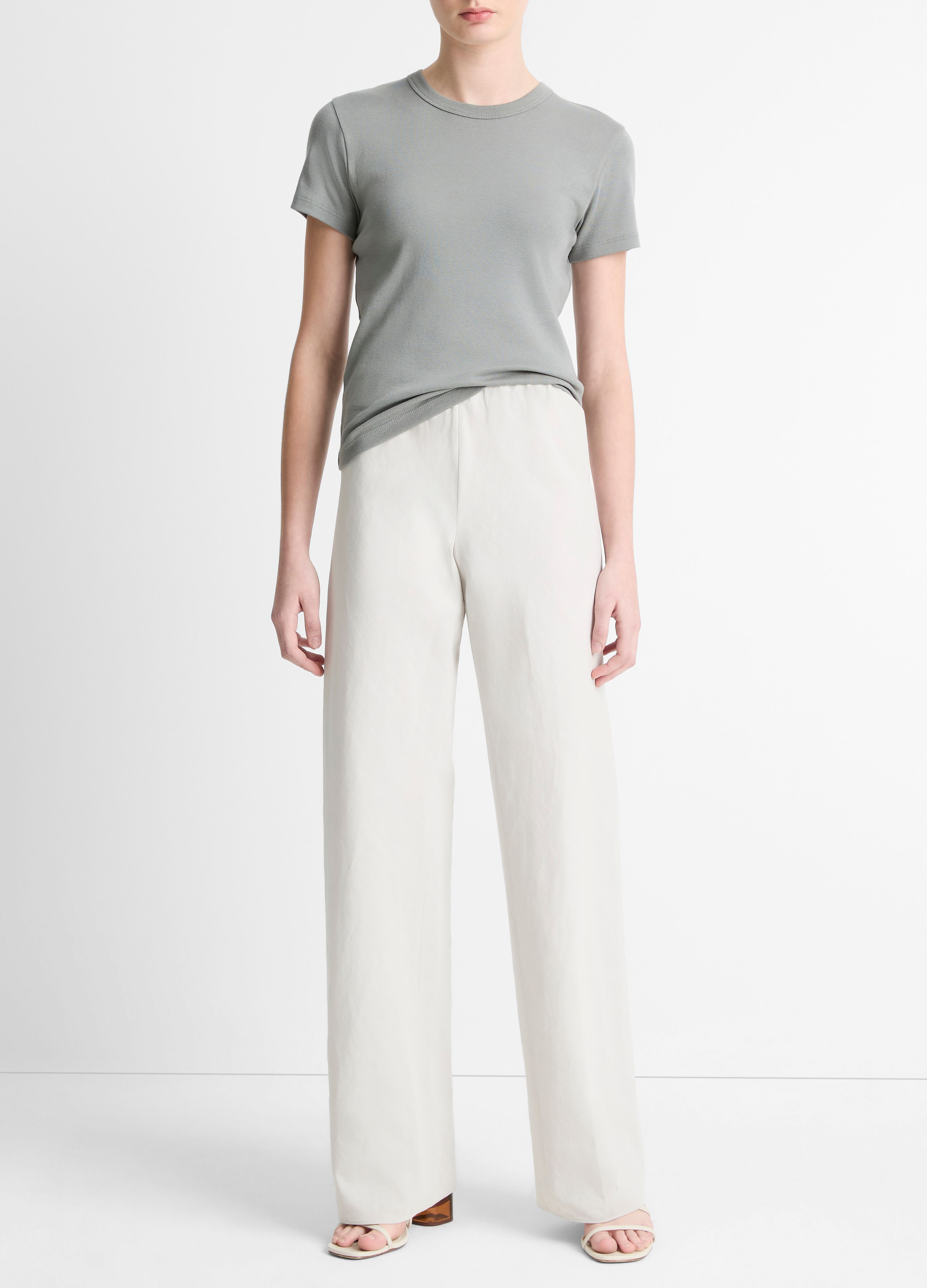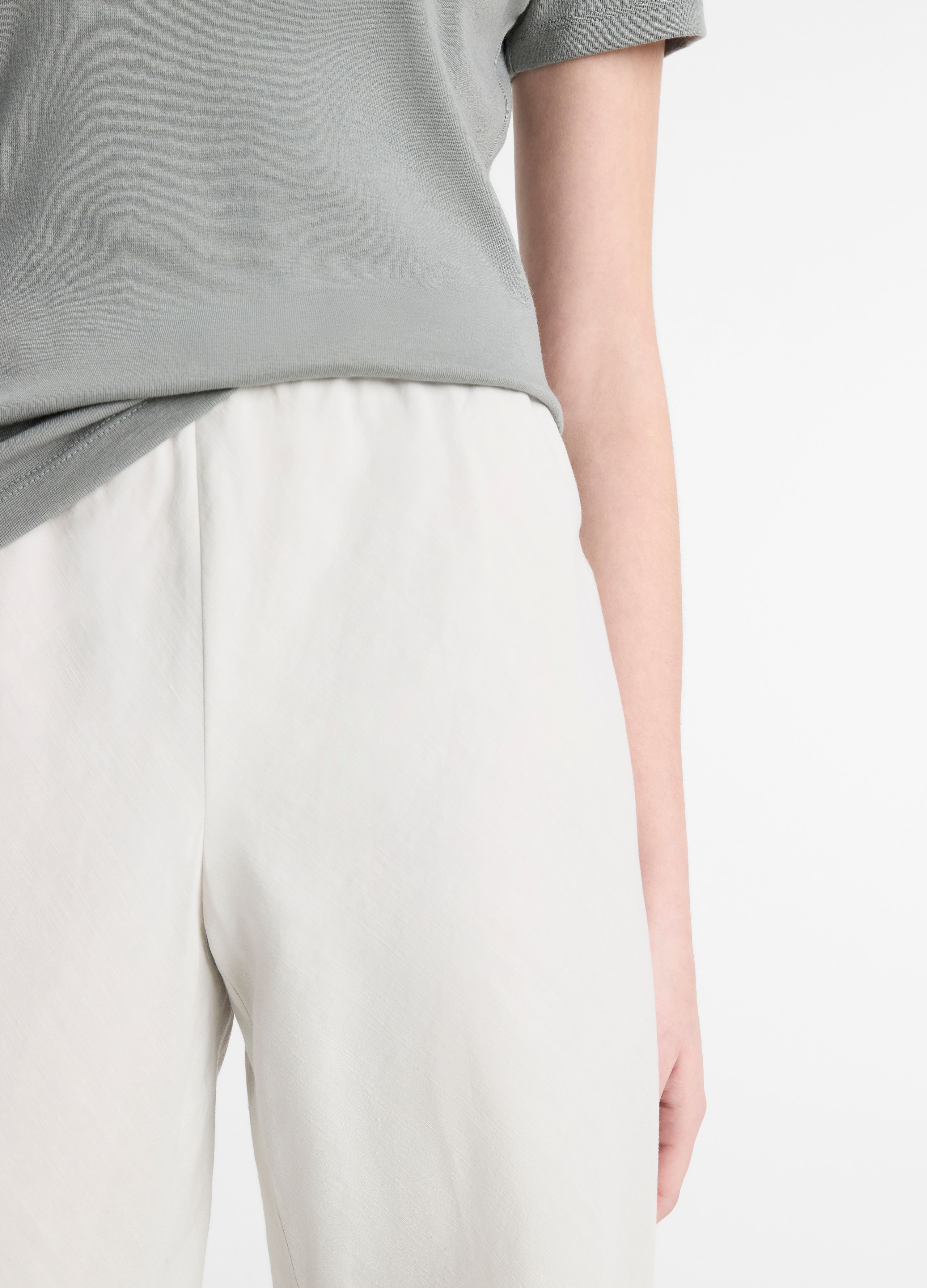 Die meistverkaufte, charakteristische Schräghose wurde neu interpretiert und sitzt oberhalb der Taille. Sie ist aus einer weichen und leichten Mischung aus Baumwolle und Leinen gefertigt.