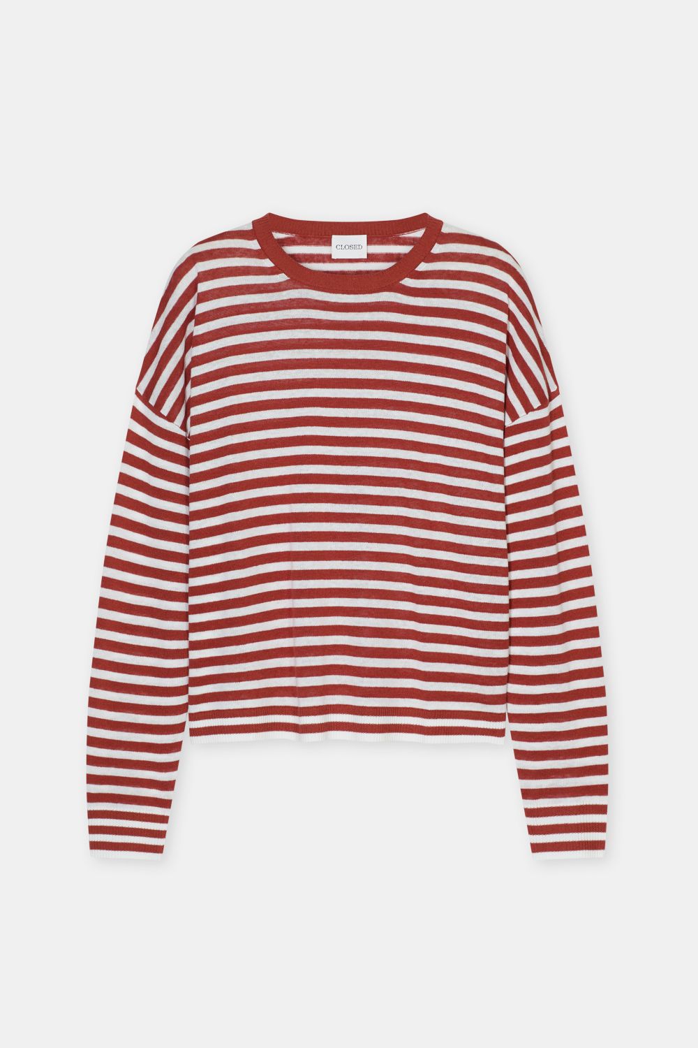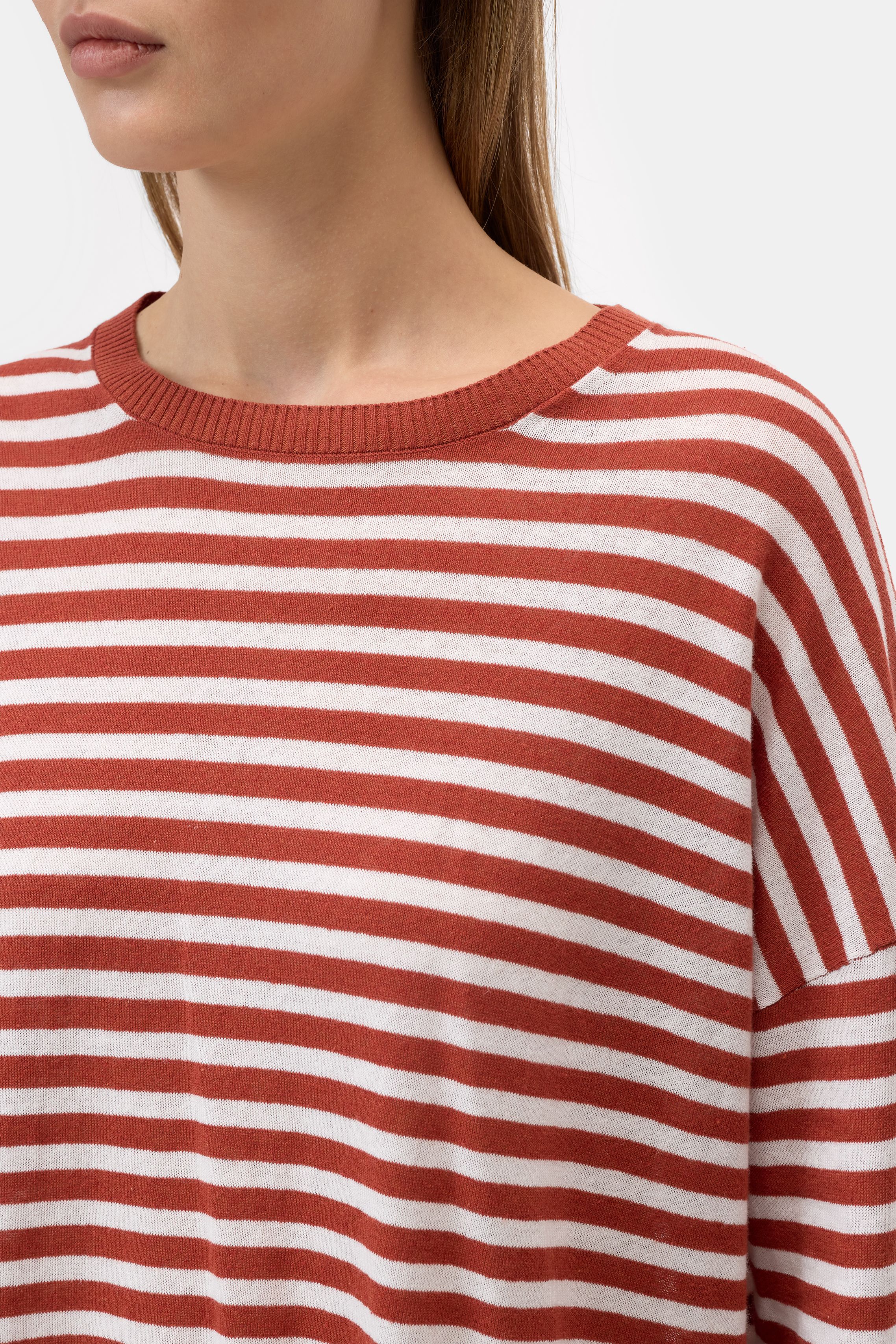 Dieser Strickpullover aus hochwertigem Leinen-Baumwoll Mix besticht durch sein gestreiftes Muster und die moderne, boxy Silhouette. Das Modell mit Rundhalsausschnitt und langen Ärmeln kommt in regulärer Passform und klassischer Länge.