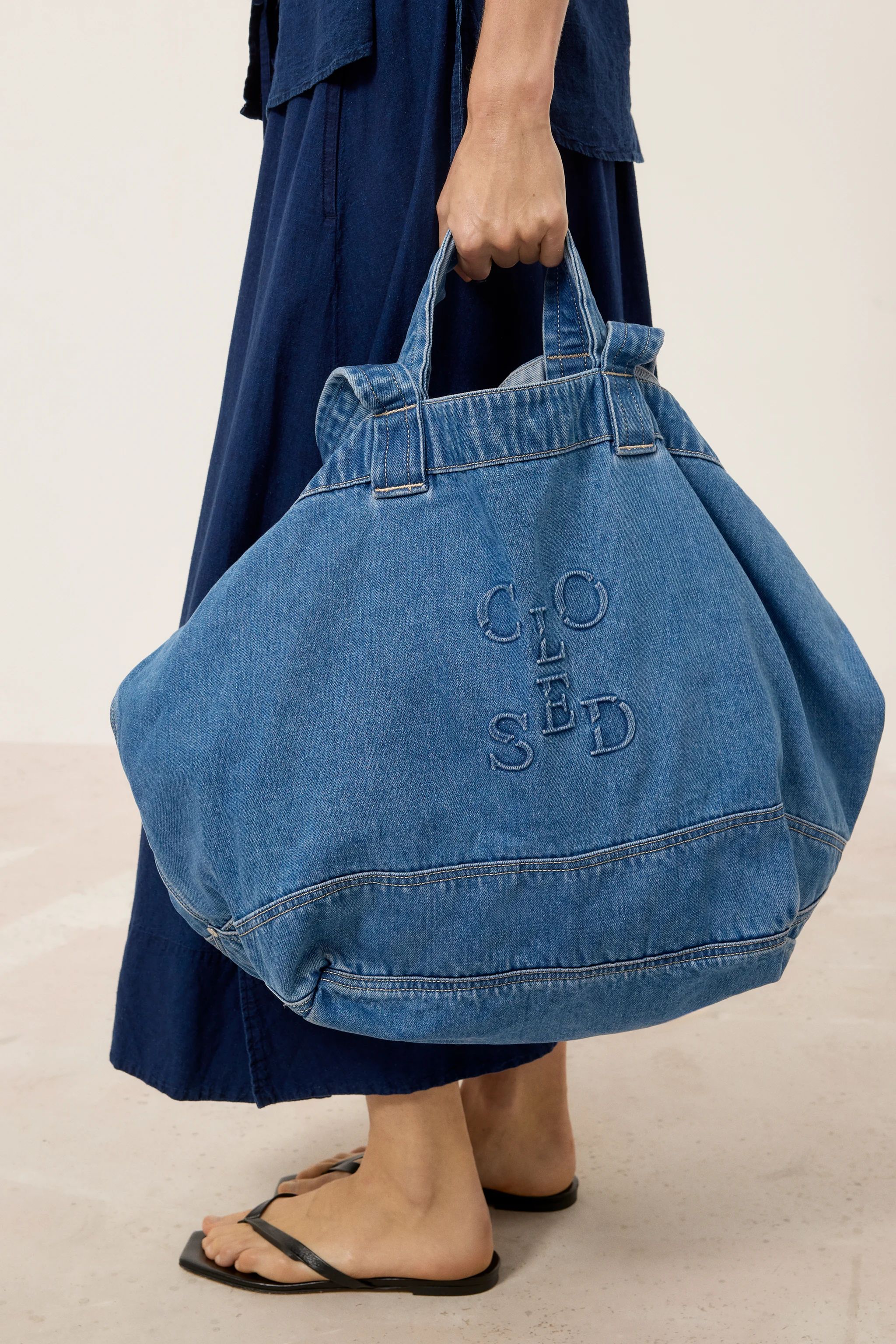 Denim-Tote mit schonender Rinse-Wash-Behandlung für optimale Stoffqualität und angenehme Haptik. Die grossformatige Tasche bietet praktische Trageoptionen durch doppelte Riemen, Kurzgriff und Schulterriemen. Besondere Designelemente sind das geprägte Closed-Monogramm und die sorgfältig ausgeführte Waschung.