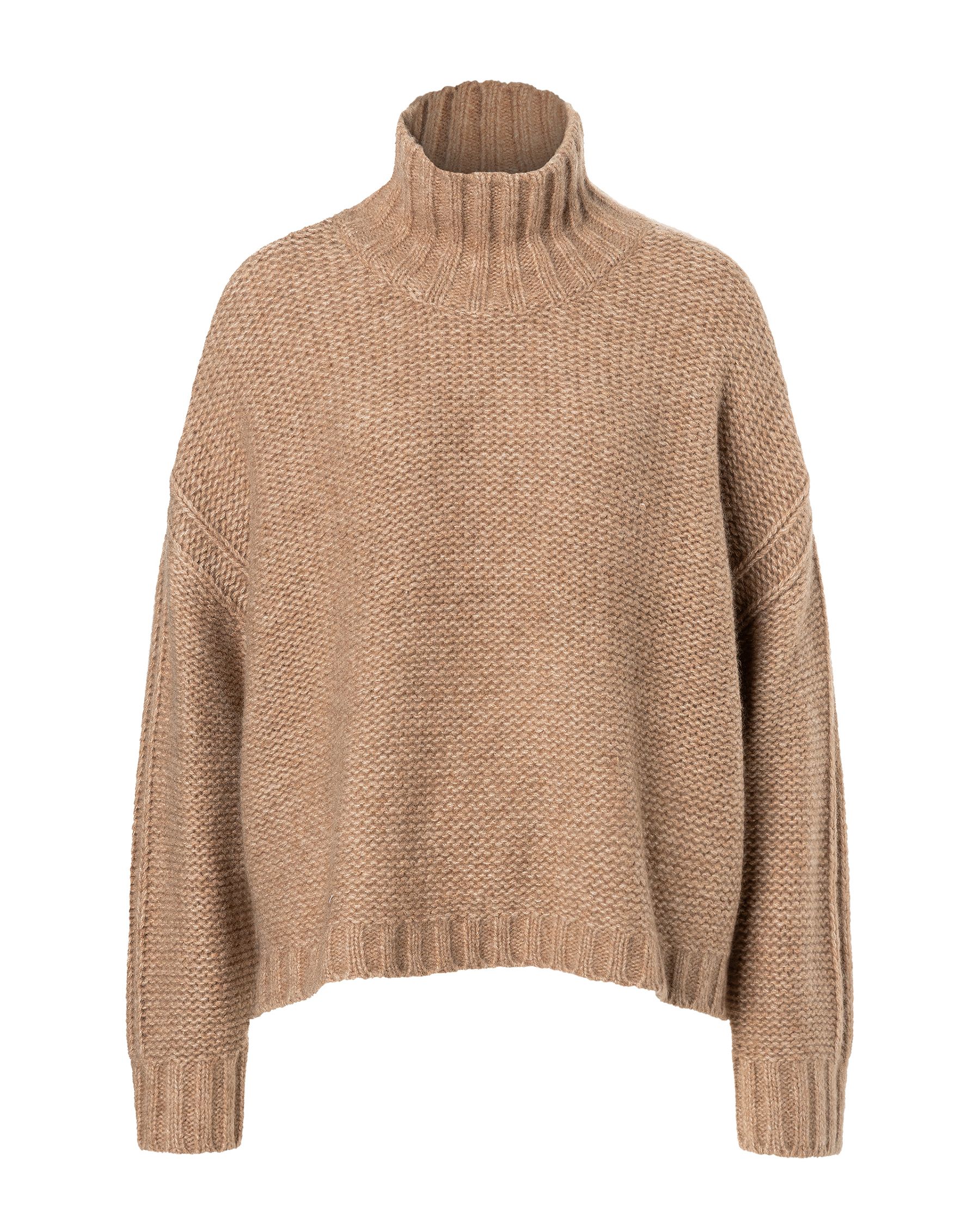 Ein Rollkragenpullover, der mit seiner Oversized-Silhouette und groben Strickstruktur ein klares Statement setzt. Tragen Sie ihn über einer schmalen Wollhose und Pumps für einen modernen Office-Look oder kombinieren Sie ihn mit einer Culotte und kniehohen Stiefeln für einen entspannten, aber stilvollen Auftritt.