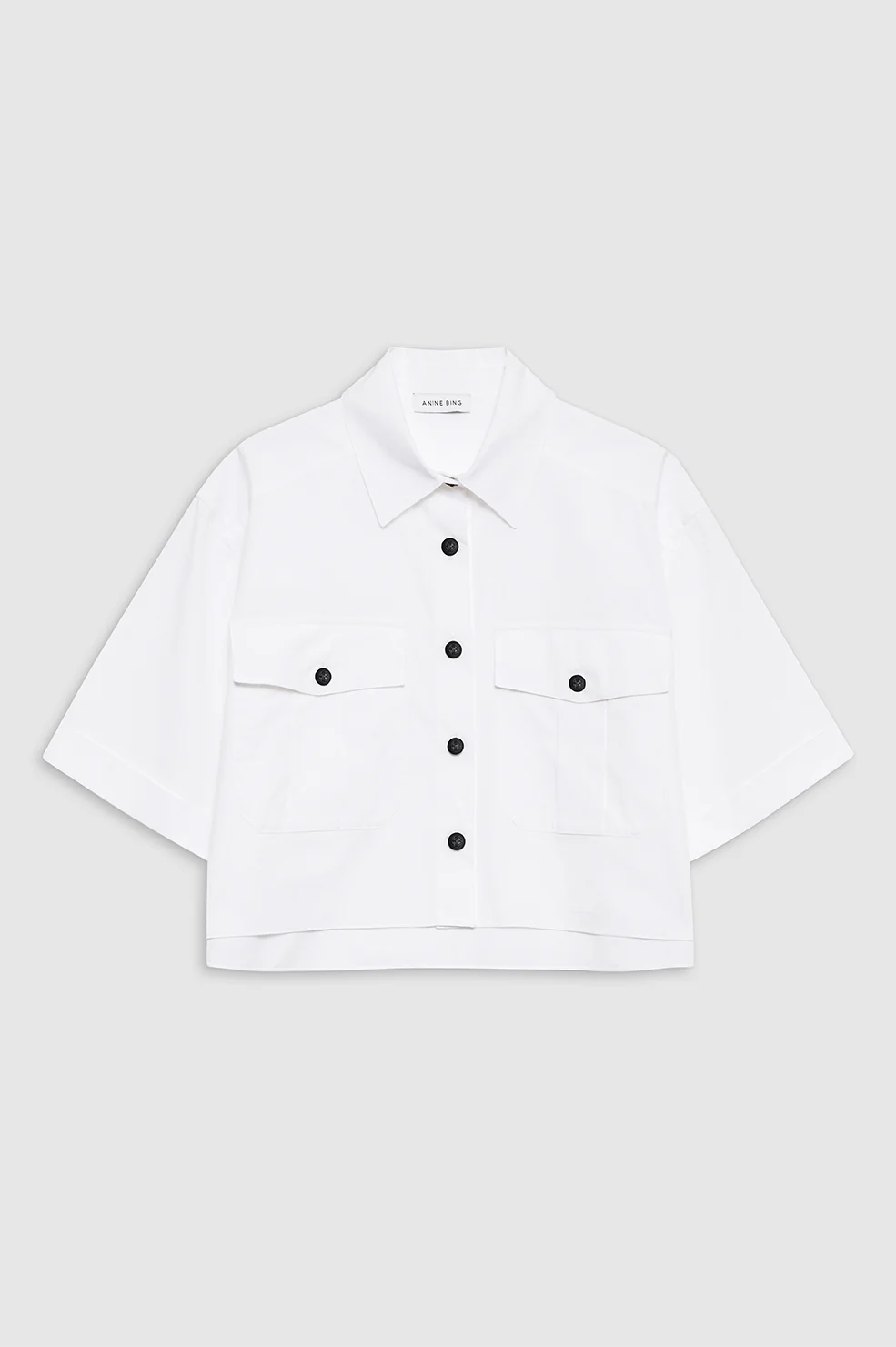 Das Edith-Shirt ist ein modernes, vom Utility-Stil inspiriertes, kurzes Hemd aus leichtem Popeline aus 100% Baumwolle mit einem frischen, strukturierten Look.