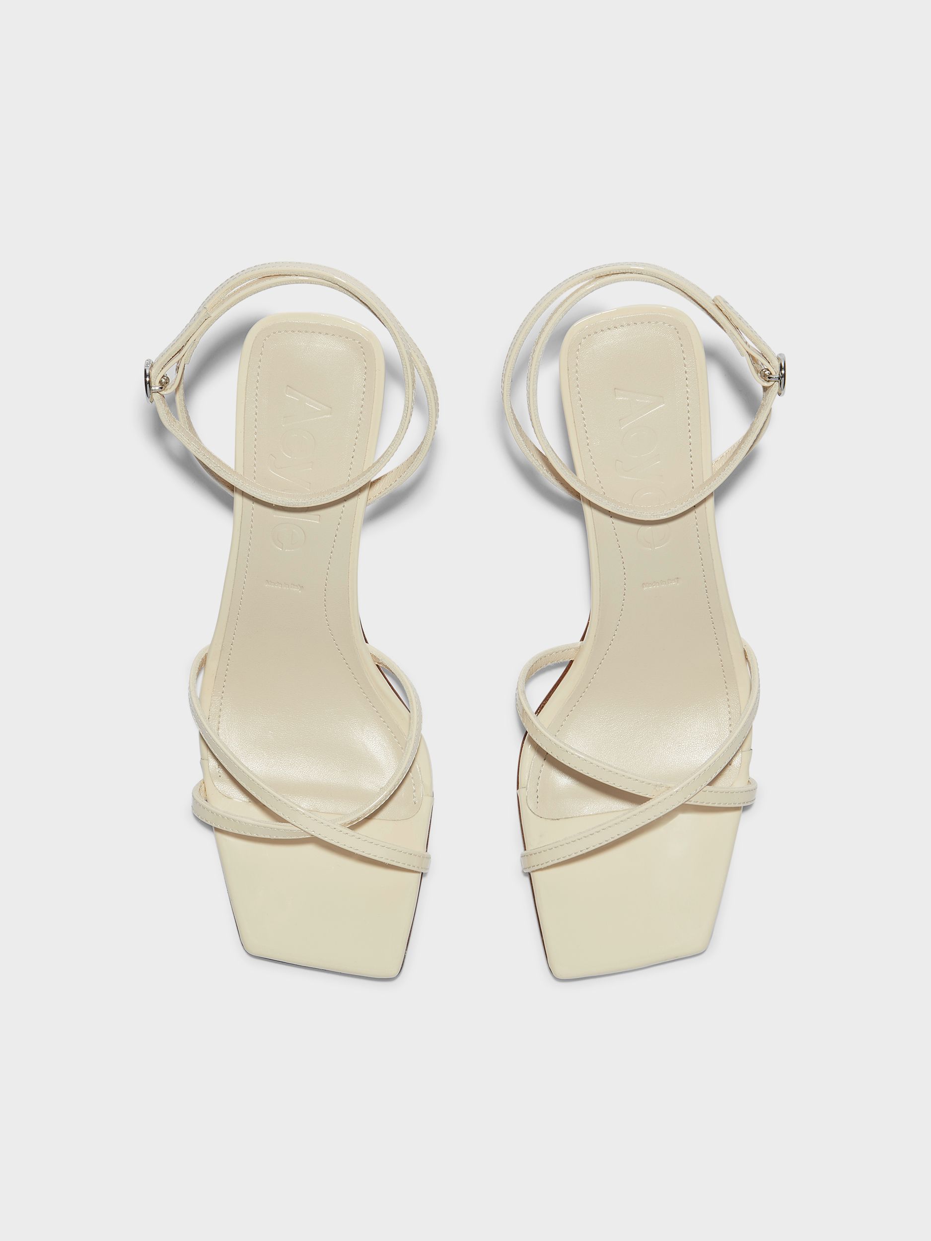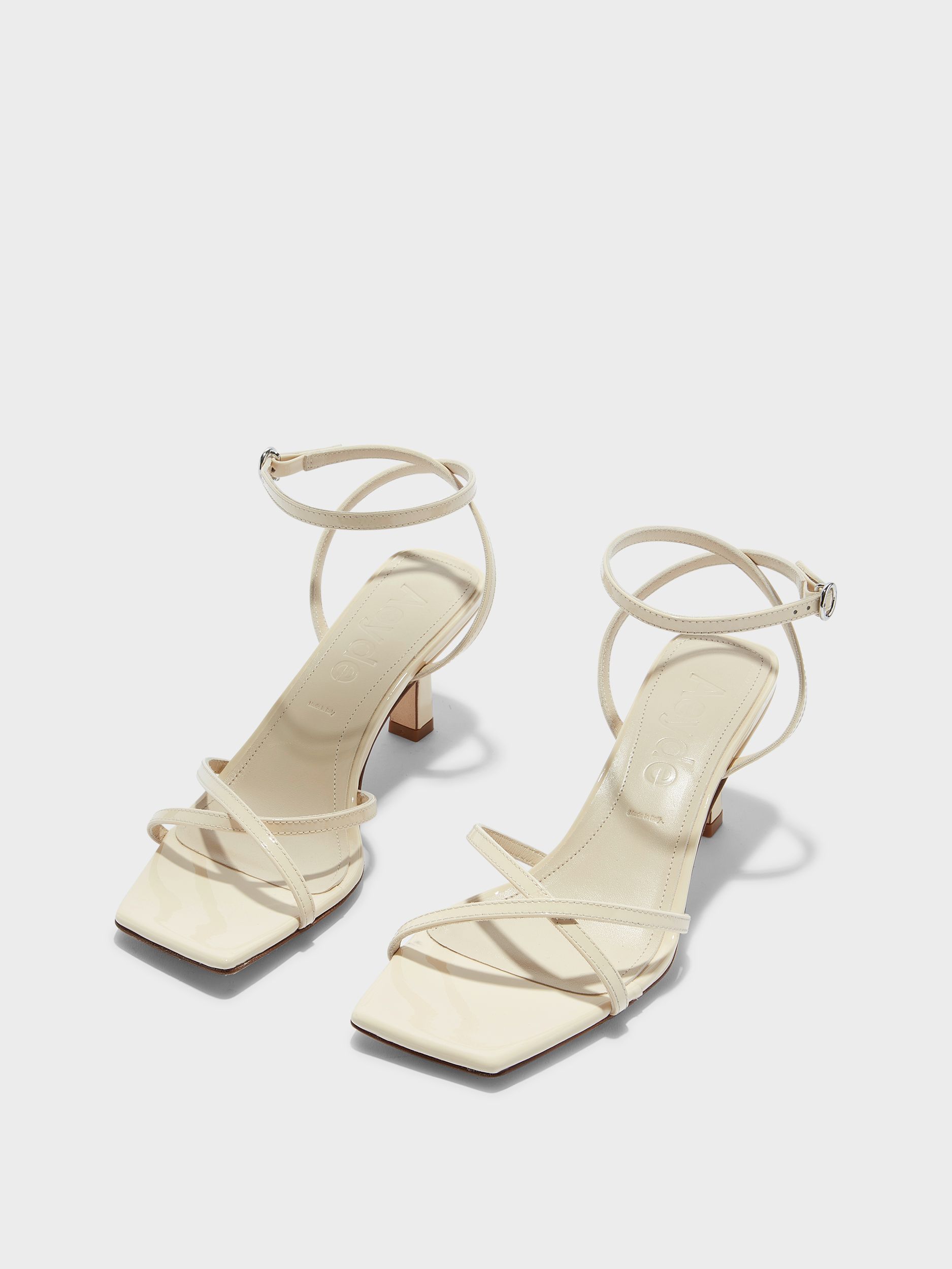Edith verleiht dem Schuh eine dramatische Note: Feine, überlappende Riemchen treffen auf einen markanten Absatz und eine eckige Zehenpartie. Die klare Silhouette harmoniert perfekt mit dem hochglänzenden Lackleder.