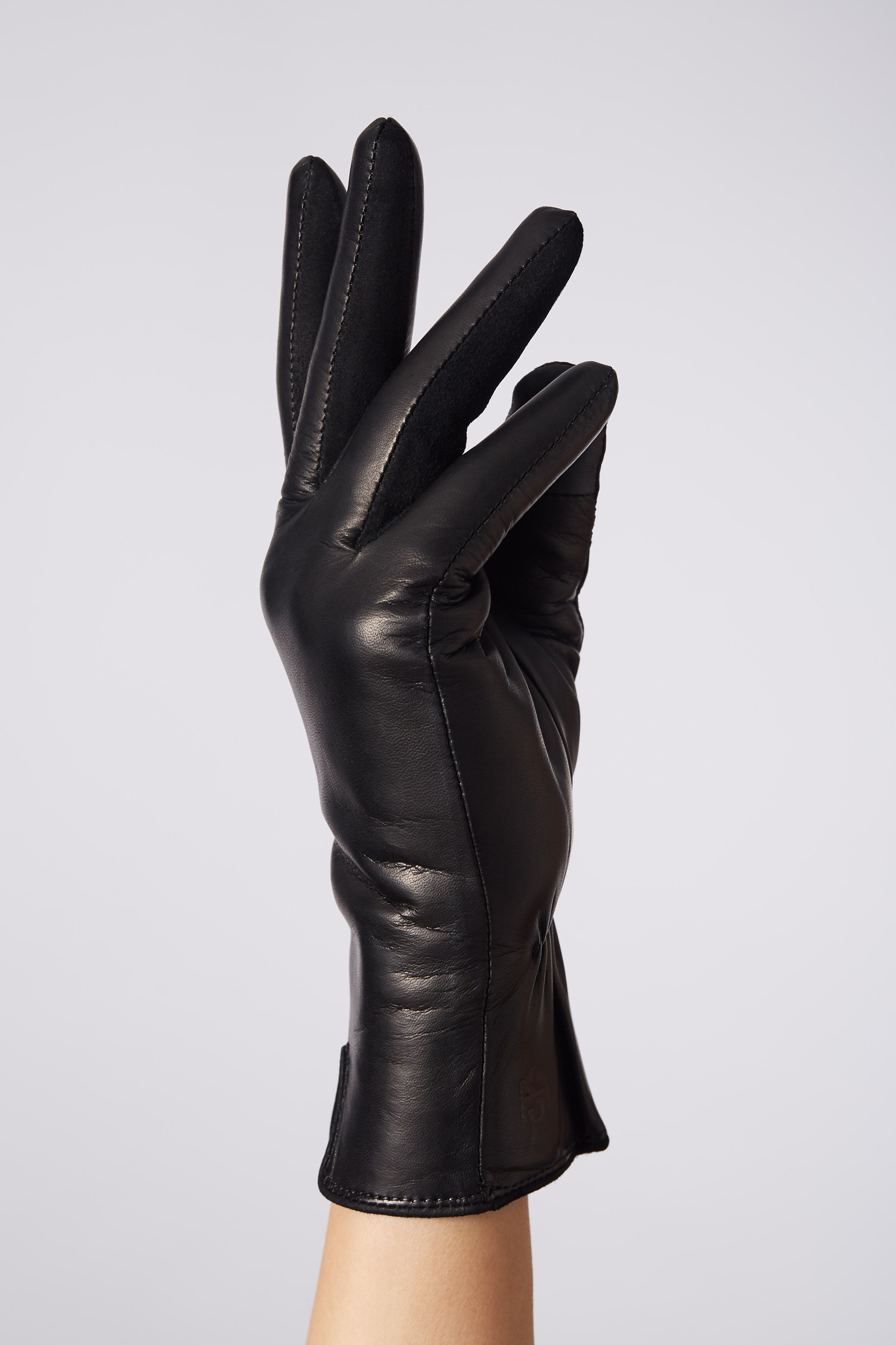 Die Essentials Black Handschuhe, eine Kombination aus Leder und Wildleder, wurden für stilbewusste Frauen entworfen, die klassische und geschmackvolle Handschuhe für jeden Anlass suchen.