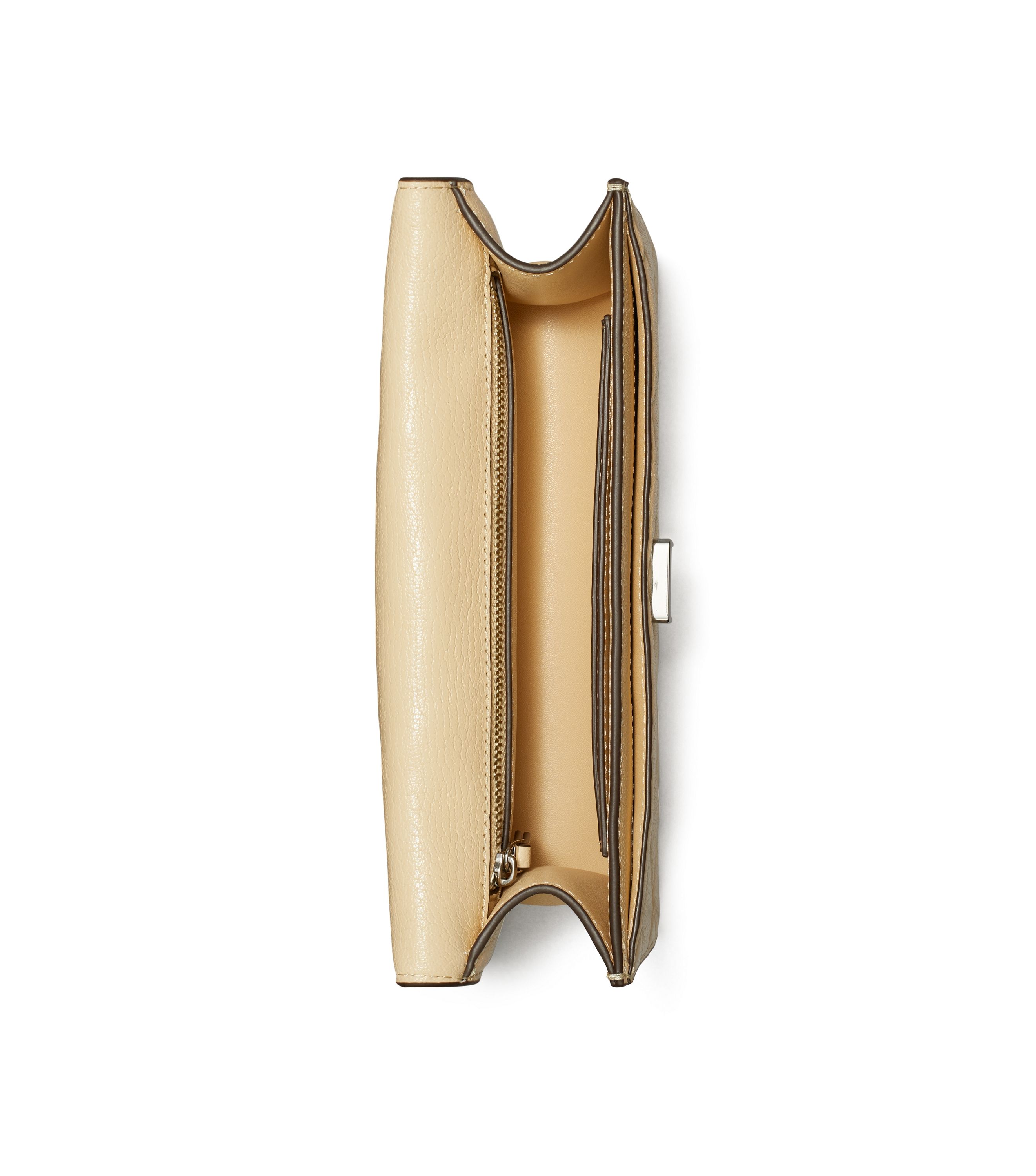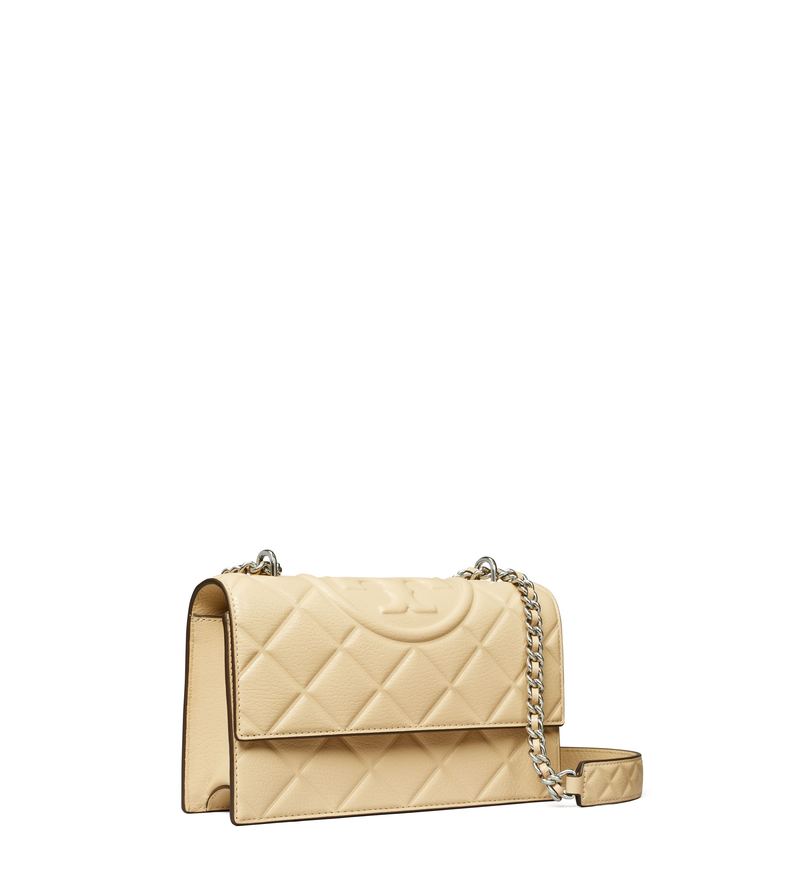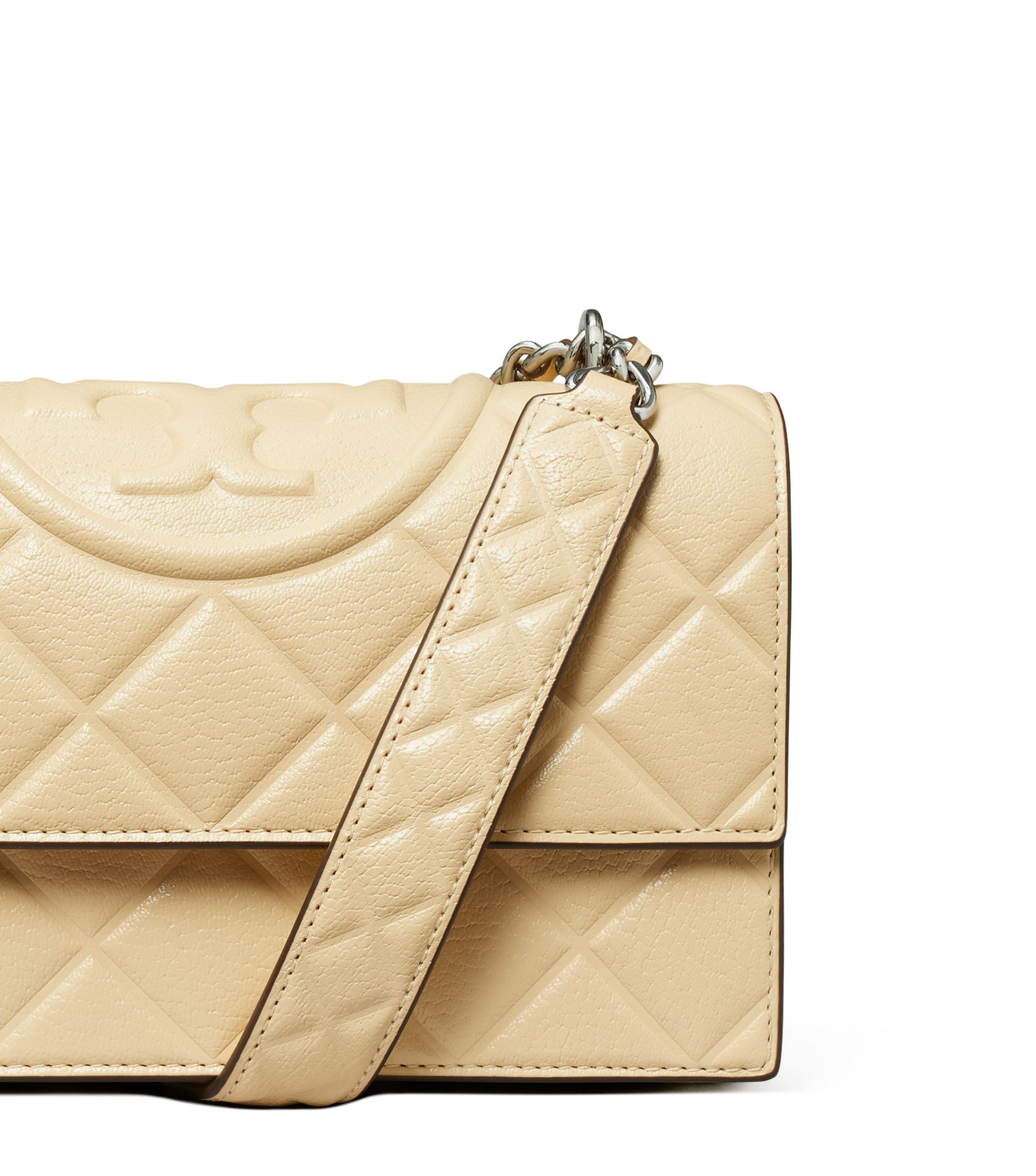 Die kleine, wandelbare Fleming Schultertasche ist mit einem grafischen Rautenmuster und einem geprägten Doppel-T versehen. Der verstellbare Trageriemen mit eingeflochtener, goldfarbener, gebürsteter Kette und doppeltem Schulterpolster dient gleichzeitig als Umhängeriemen.