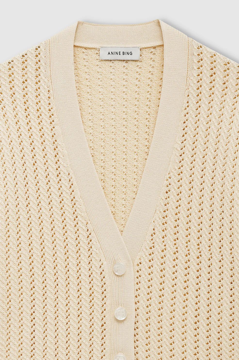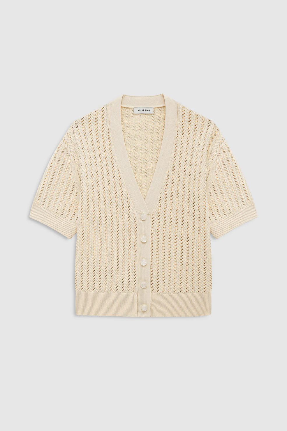 Ein unkompliziertes Must-have für warme Tage, das sich durch seine feine, offene Strickstruktur und den sanften Cremeton auszeichnet. Gefertigt aus einem leichten Baumwollmix mit atmungsaktivem Lochmuster, besticht es durch einen klassischen V-Ausschnitt und eine Knopfleiste. Die kurzen Ärmel und die lockere Passform sorgen für eine vielseitige Silhouette, die sich perfekt für den urbanen Alltag oder entspannte Ausflüge ans Meer eignet.