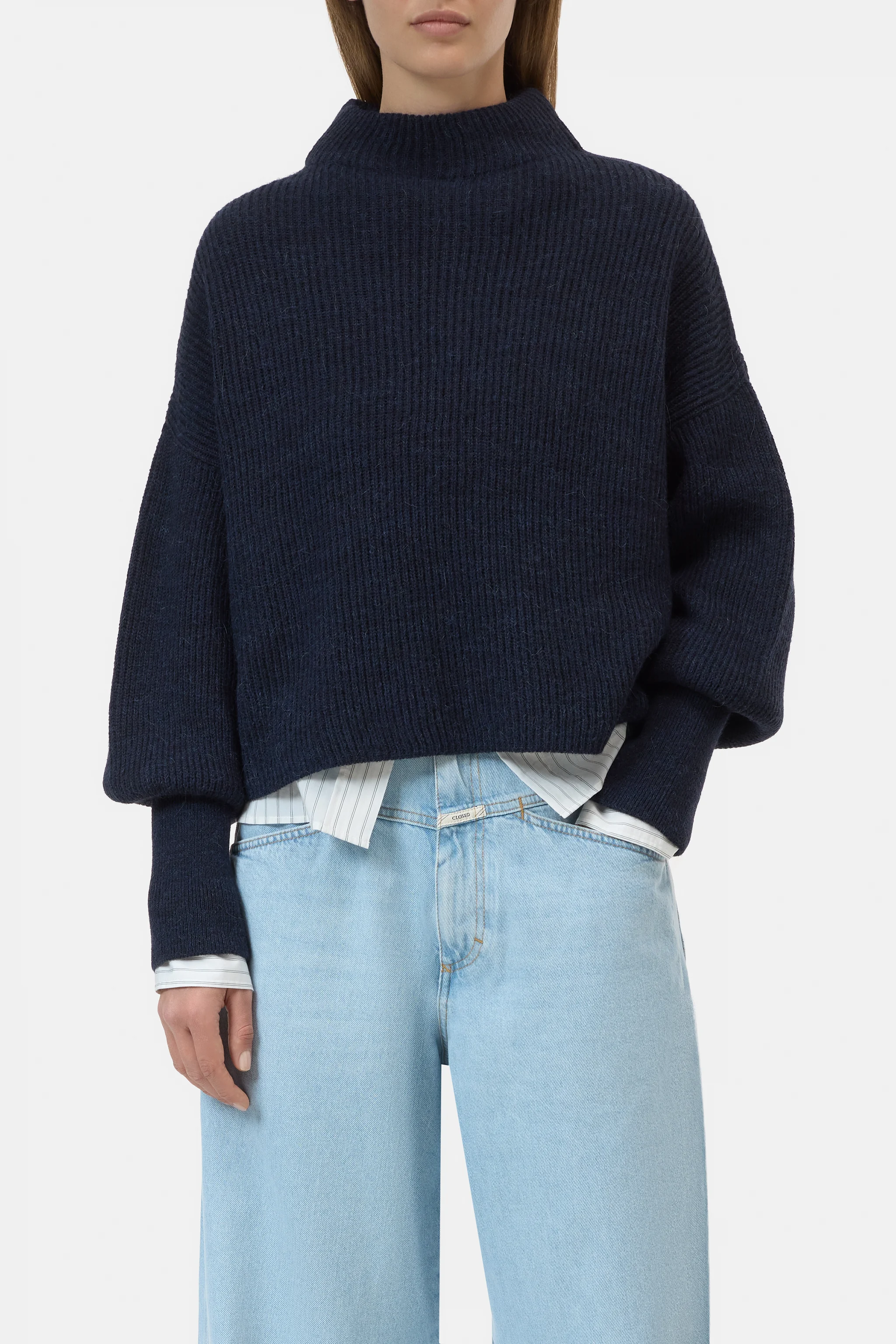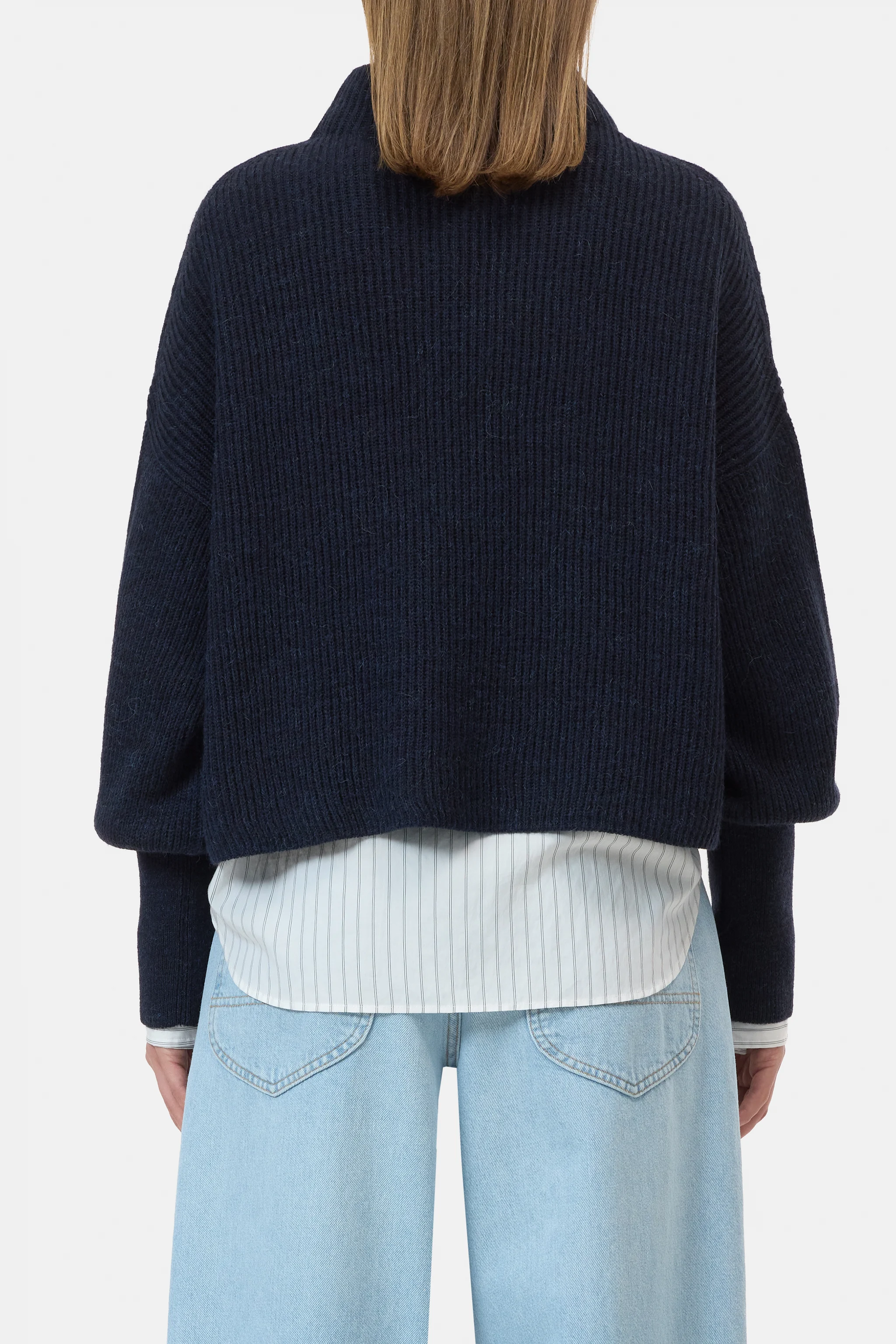 Aus weichem italienischem Alpaka-Mix-Garn: kurzer Strickpullover im Fisherman's Rib (5 gg) mit Stehkragen, überschnittenen Schultern und extra breiten Bündchen an den Ärmeln.