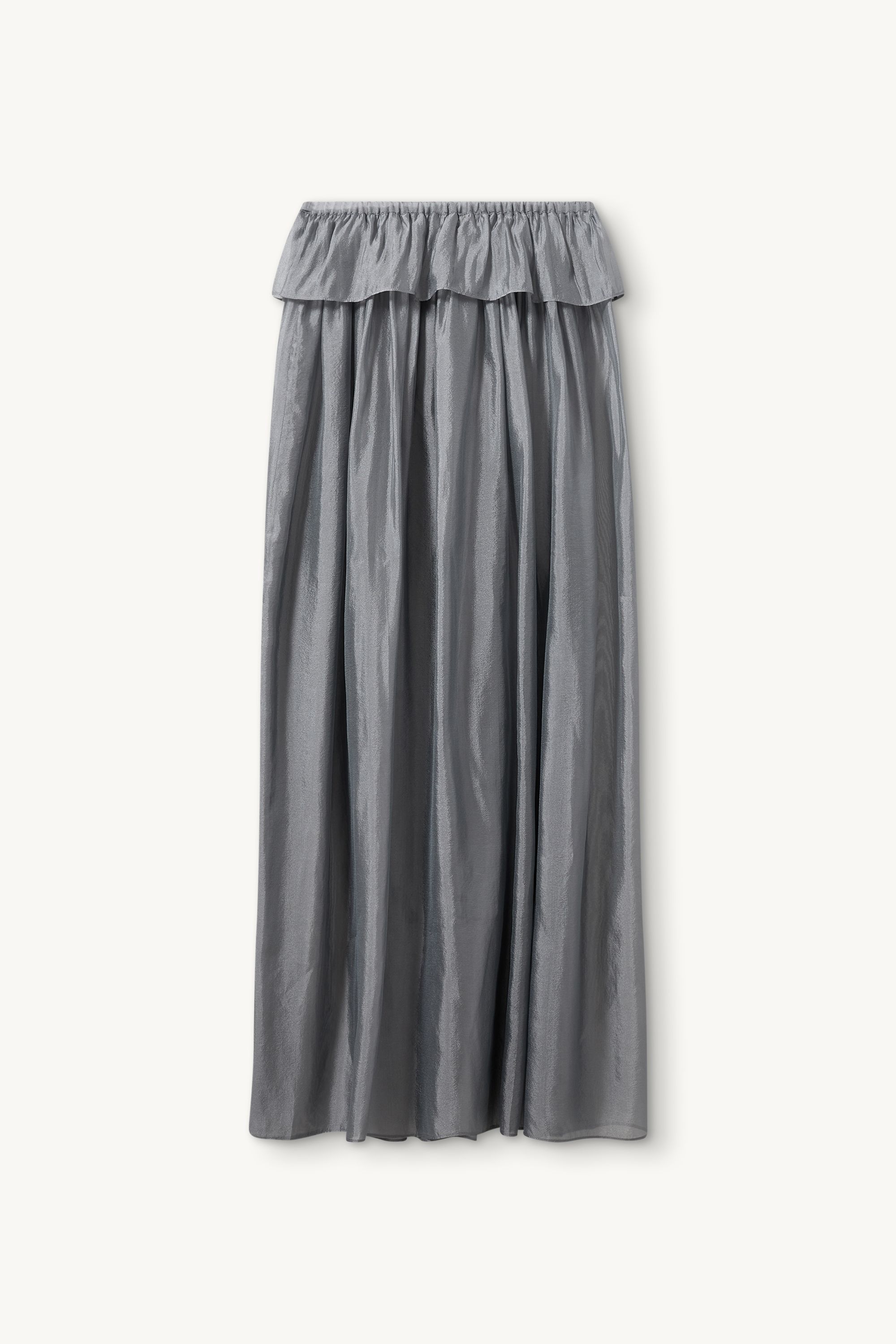Der Gilian Maxirock ist ein transparenter, knielanger Rock mit einem hohen Seitenschlitz. Die gerafften Lagen verleihen ihm eine elegante Fülle und werten jedes Outfit mühelos auf.