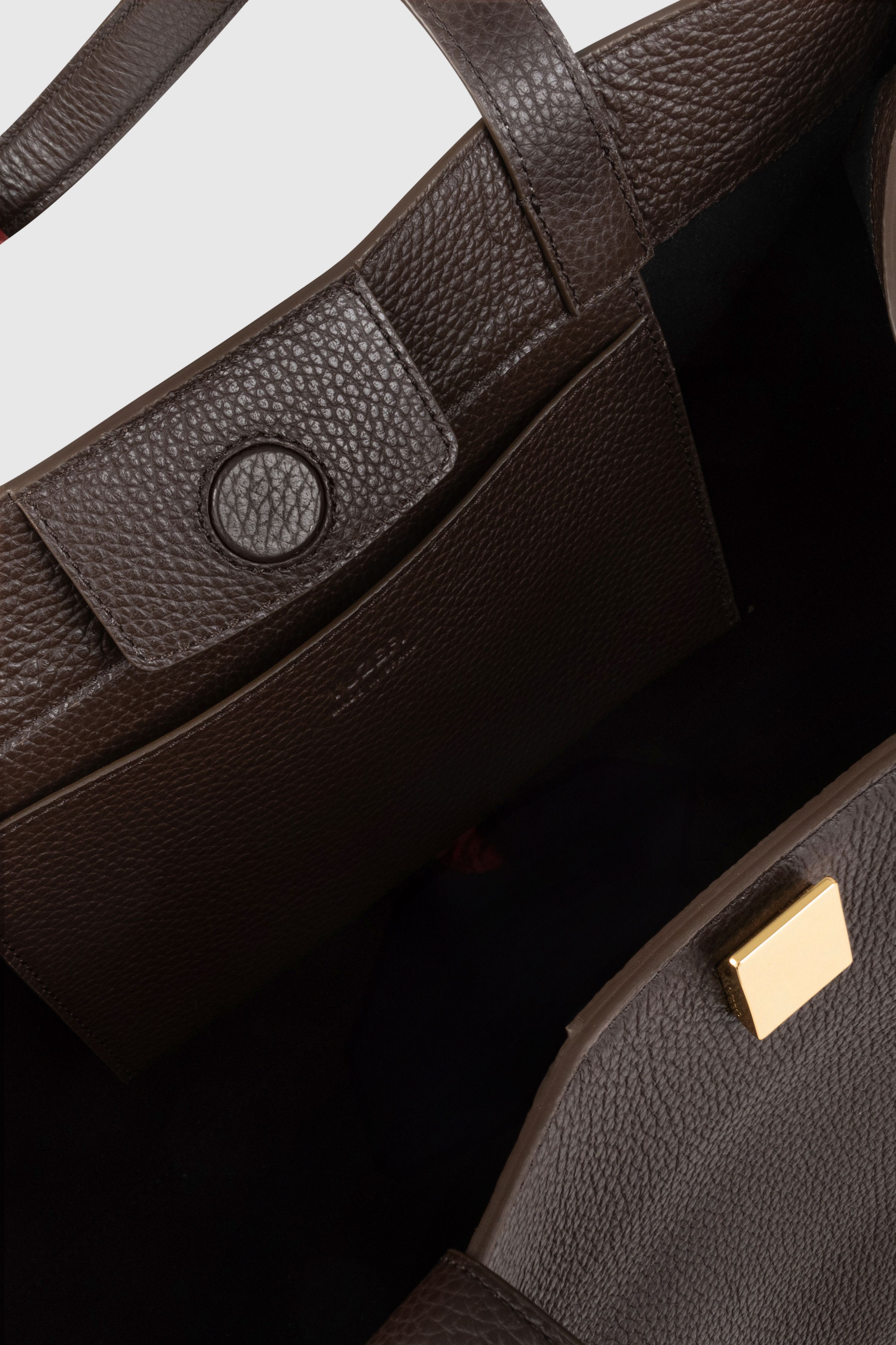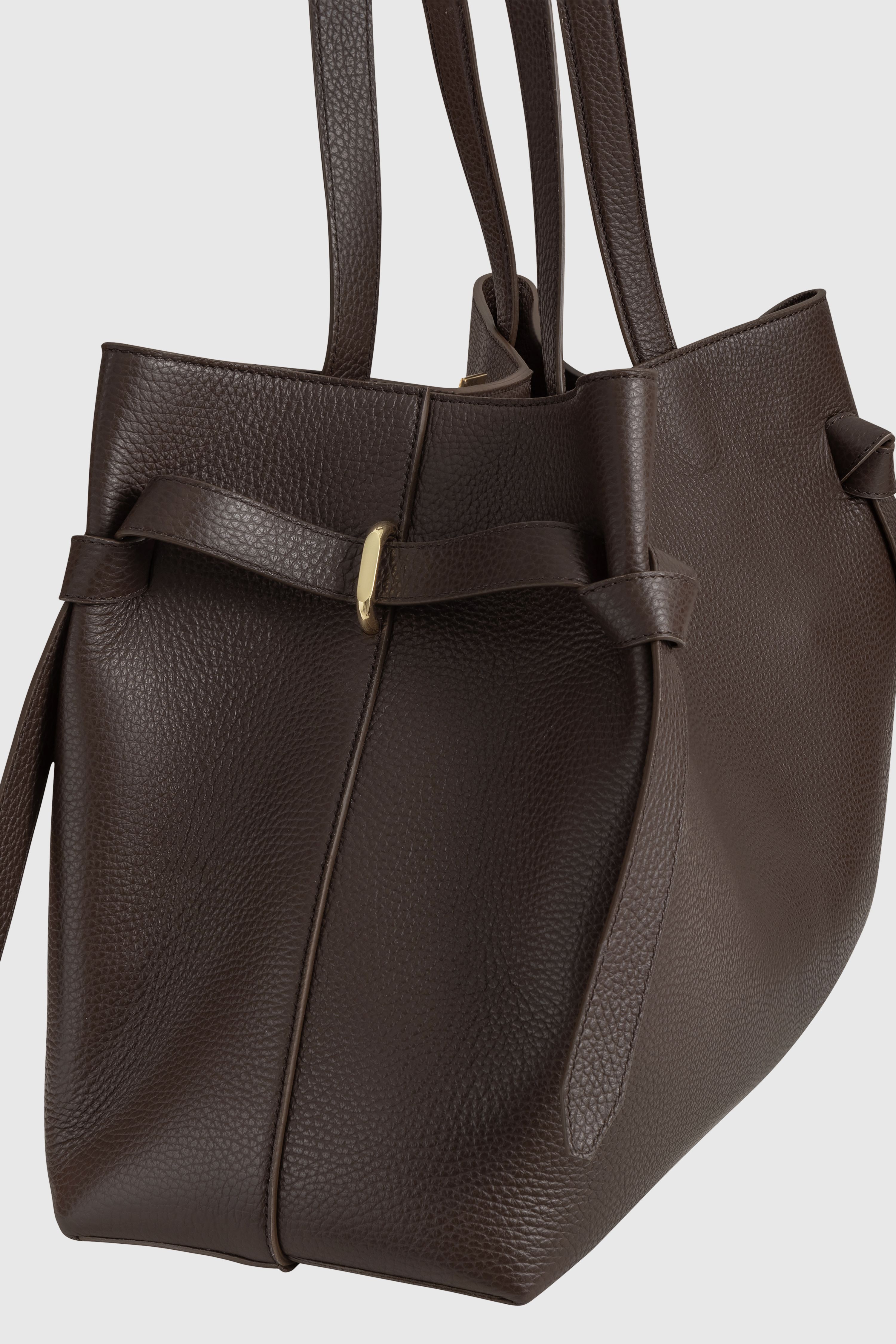 Die Gyoza ist eine strukturierte Henkeltasche aus luxuriösem italienischem Espresso-genarbtem Leder, verziert mit eleganten goldfarbenen Beschlägen.