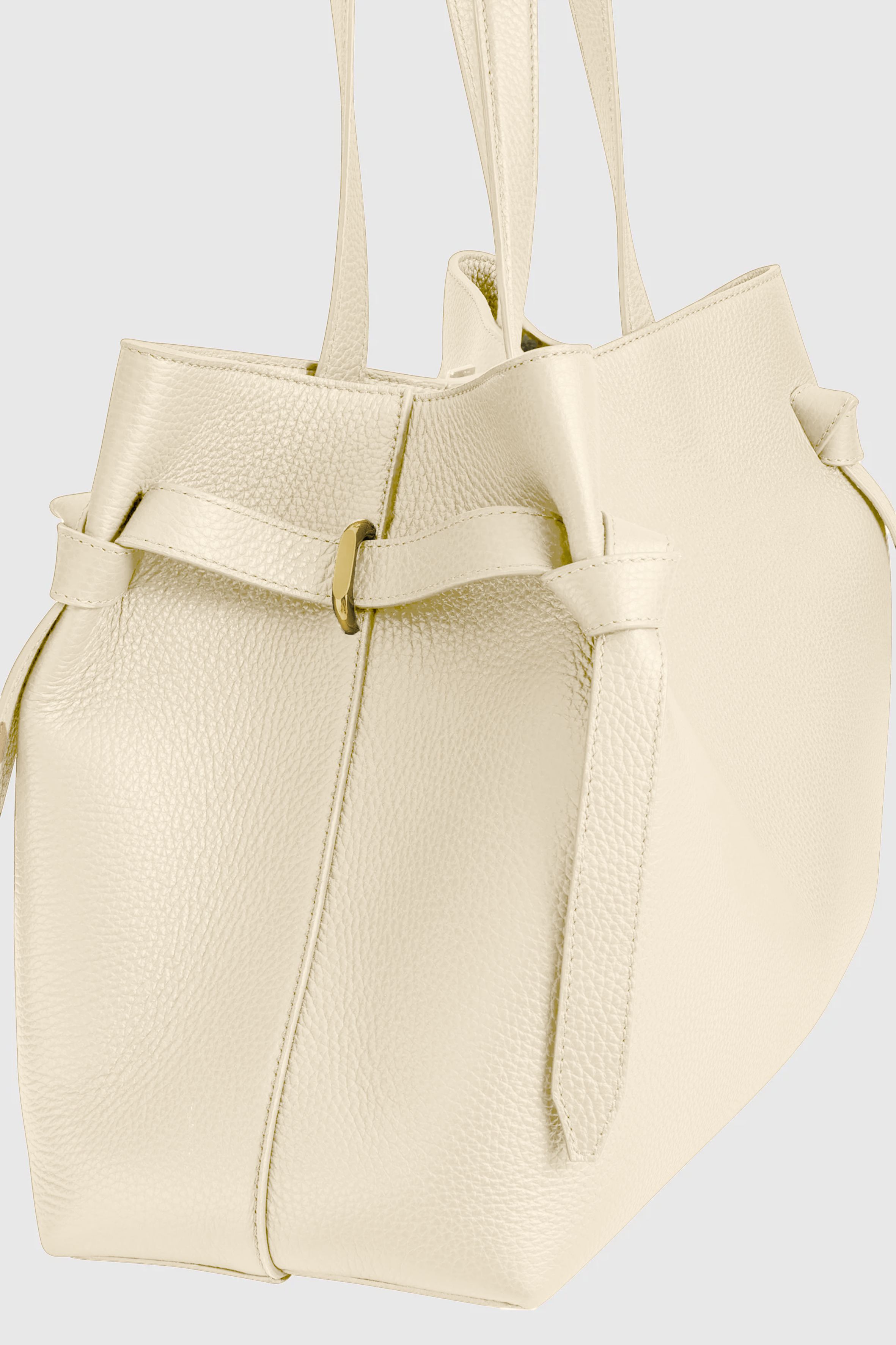 Die Gyoza ist eine strukturierte Henkeltasche aus luxuriösem italienischem Espresso-genarbtem Leder, verziert mit eleganten goldfarbenen Beschlägen.
