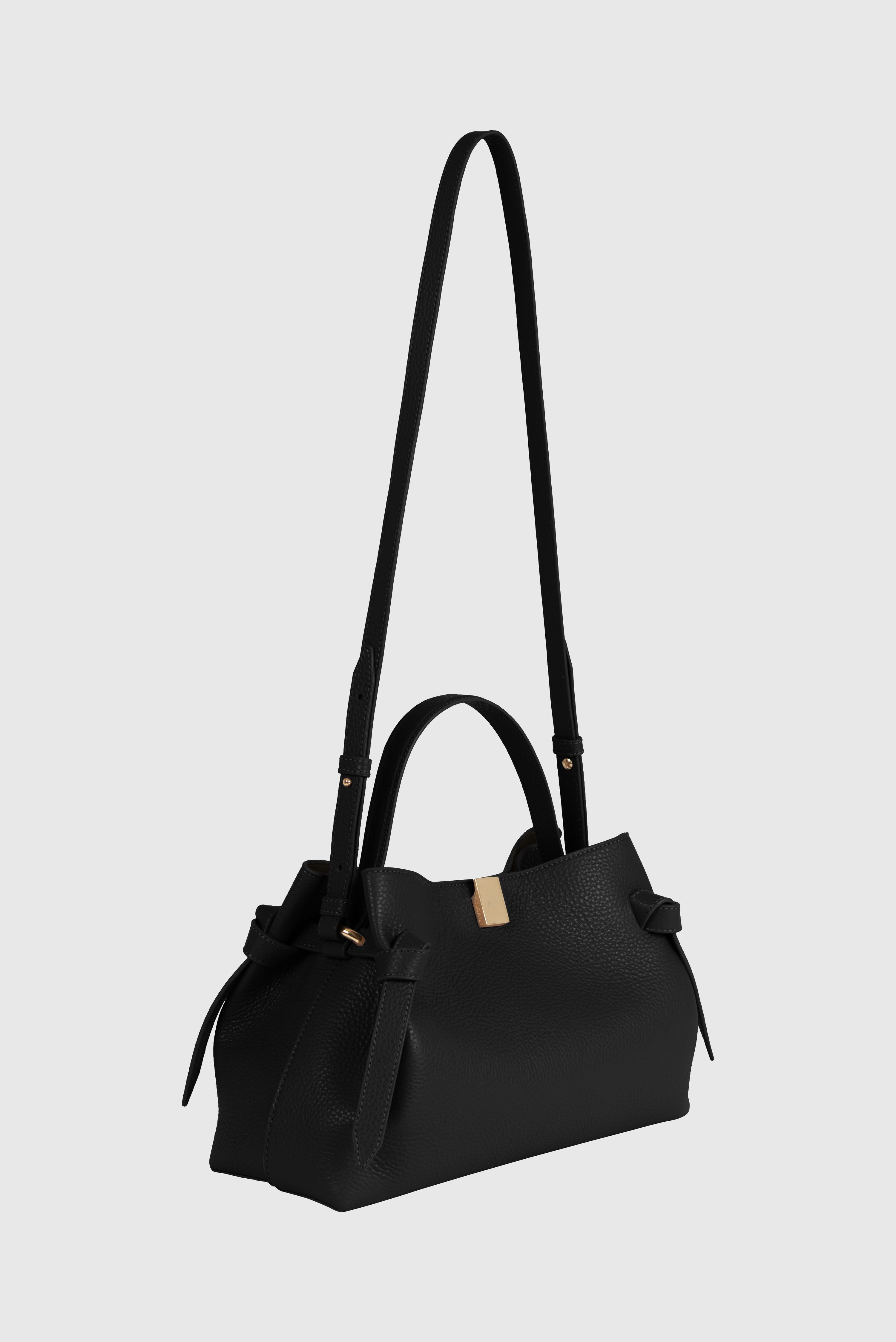 Die Mini Gyoza ist eine skulpturale Henkeltasche aus luxuriösem italienischem schwarzem genarbtem Leder mit eleganten goldfarbenen Beschlägen.