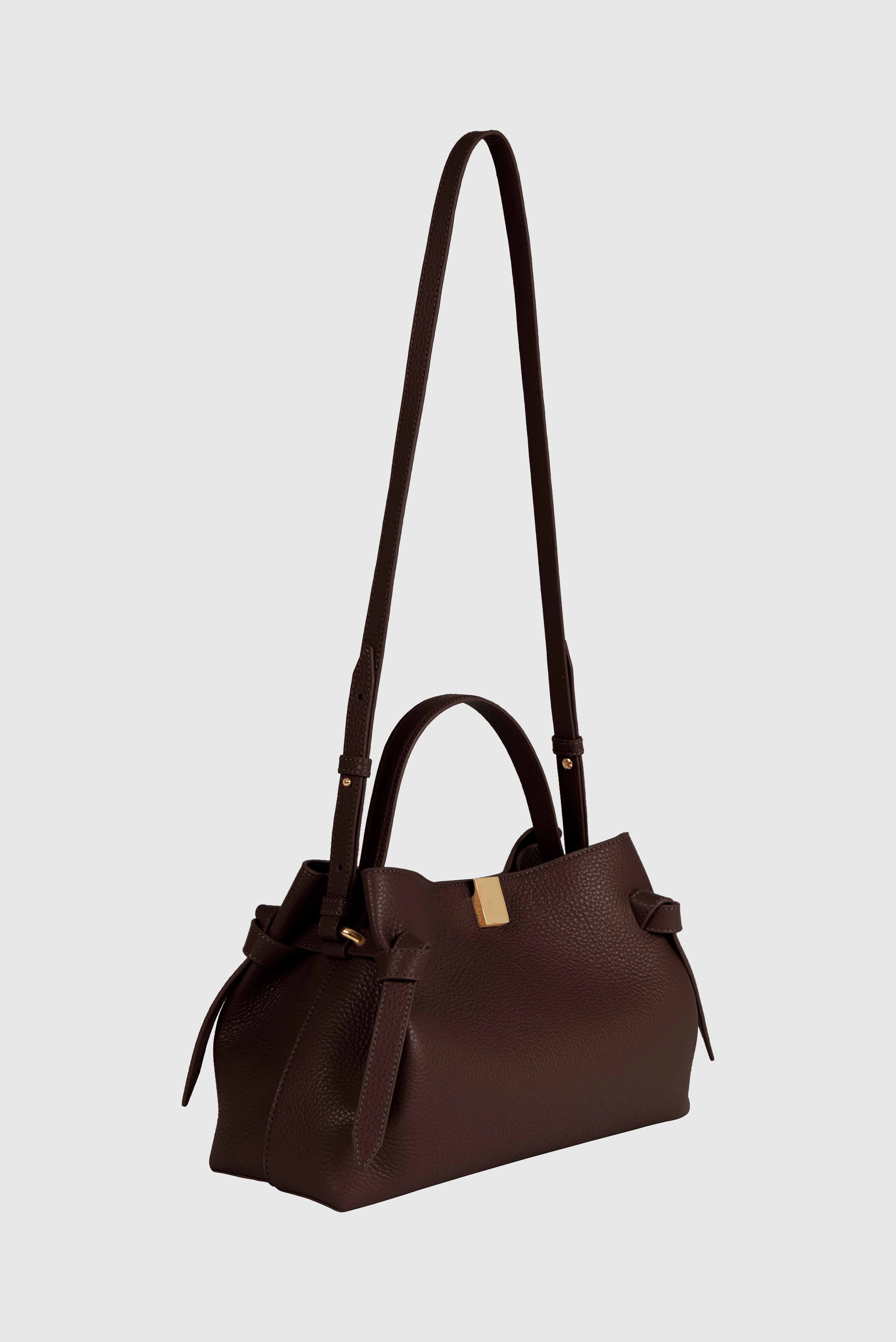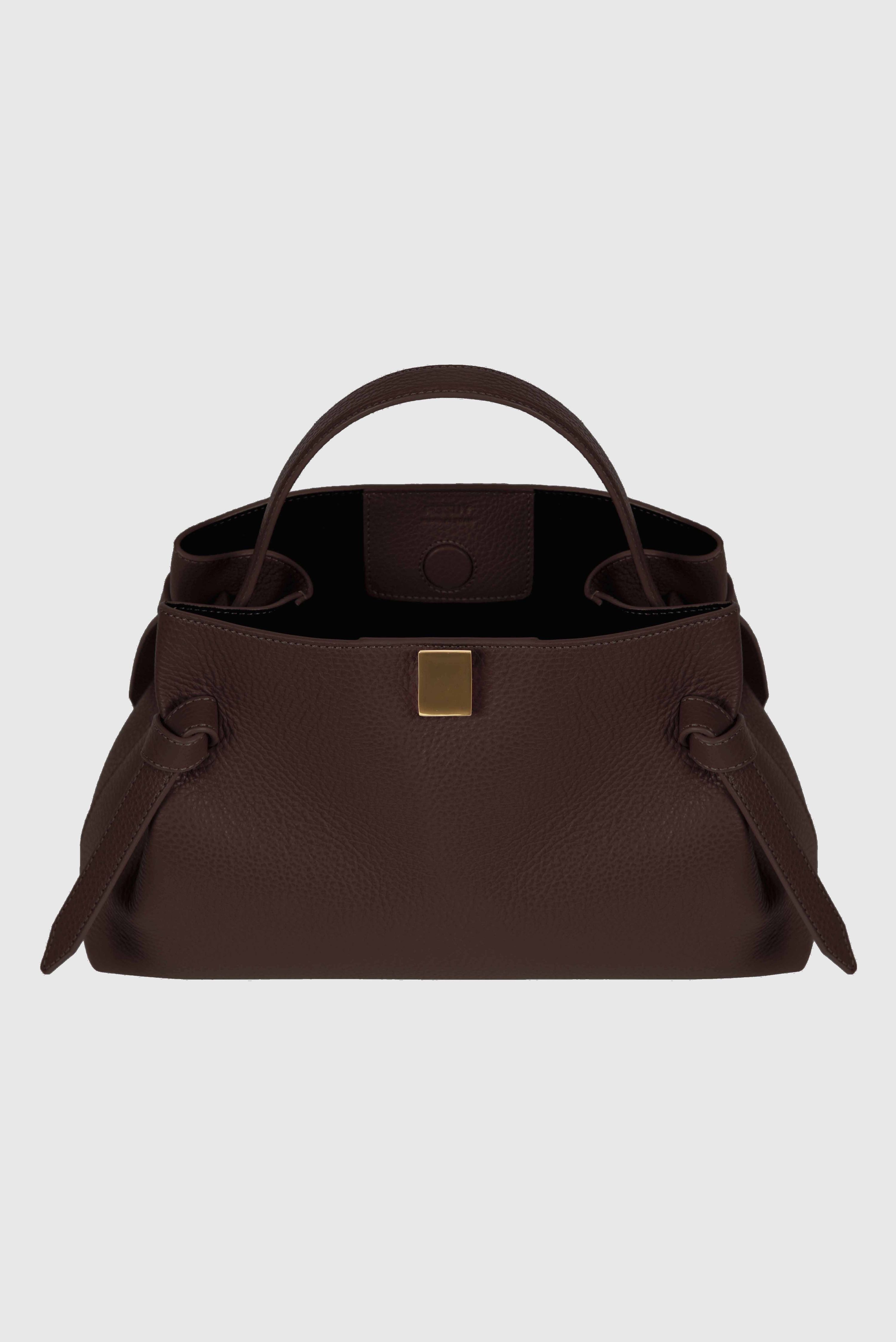 Die Mini Gyoza ist eine skulpturale Henkeltasche aus luxuriösem italienischem schwarzem genarbtem Leder mit eleganten goldfarbenen Beschlägen.