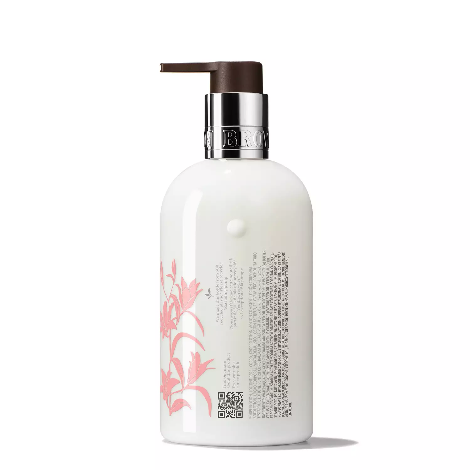 Pflegen Sie Ihre Haut nach der Dusche mit unserer sinnlichen, weiss-blumigen Körperlotion, die mit einer eleganten Illustration einer Ingwerlilie verziert ist – einer einfachen Ausgabe, passend zum Muttertag. Ergänzt mit unserem passenden Bade- und Duschgel, um die Spuren von zarten Gewürzen und weissem Blütenduft einzufangen.