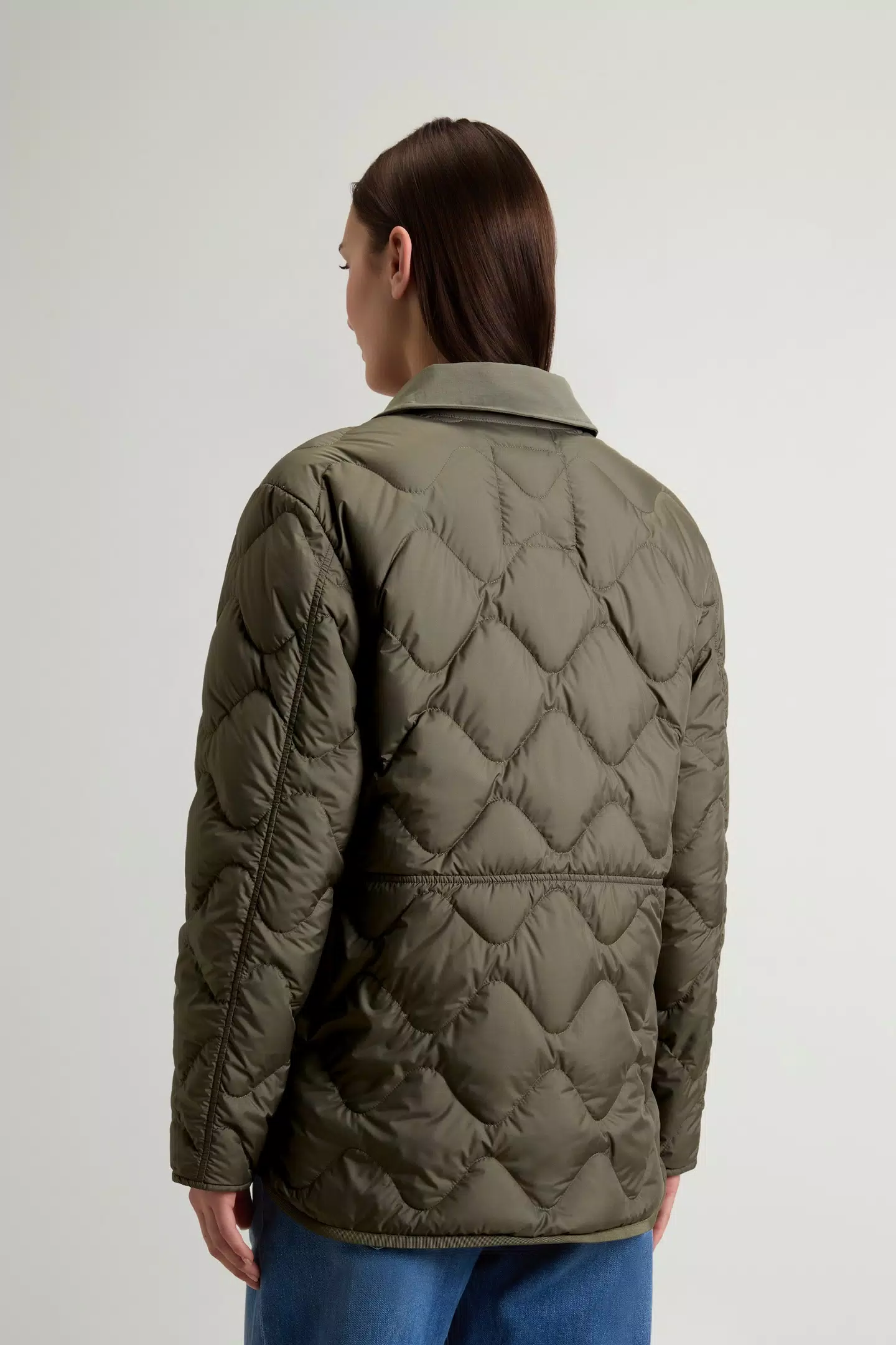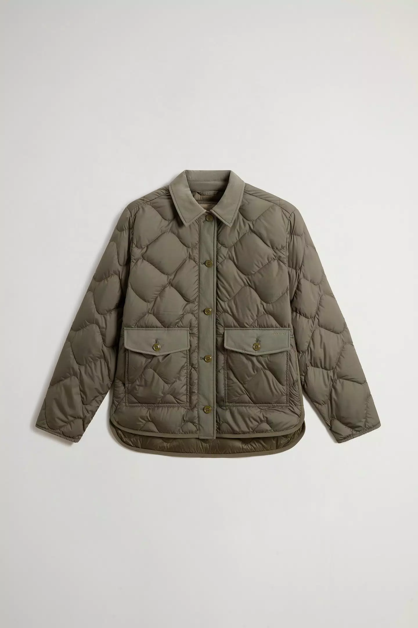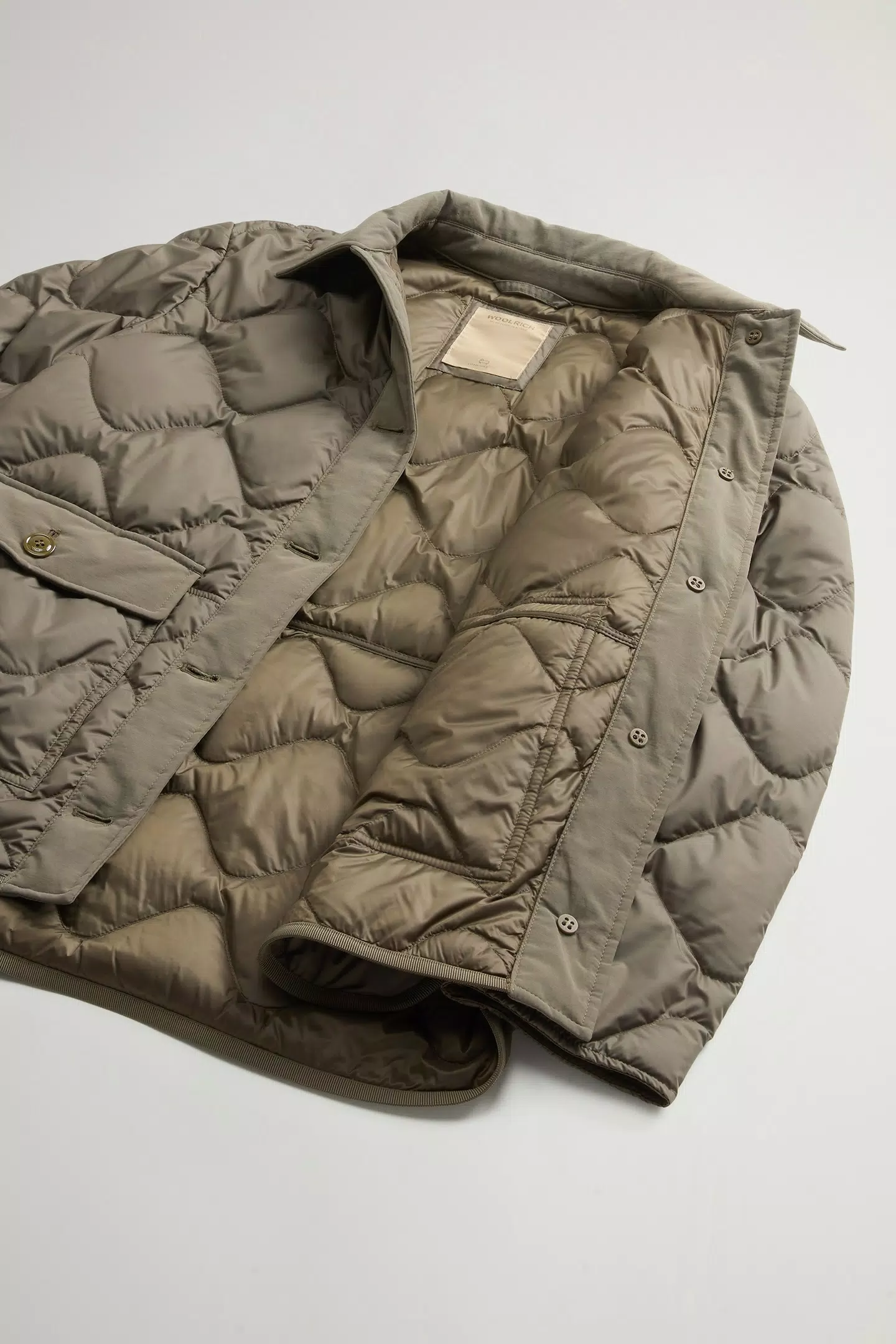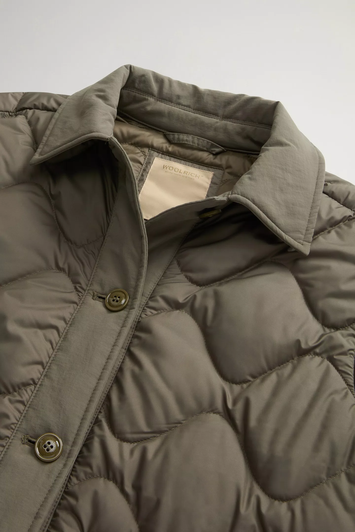 Diese Jacke interpretiert eine klassische Ästhetik durch eine leichte und funktionelle Konstruktion neu, die für die Übergangszeiten konzipiert wurde. Sie besteht aus weicher, wasserabweisender und windbeständiger Mikrofaser und ist ideal für den täglichen Schutz bei gleichzeitigem Komfort und geringem Gewicht. Die Entendaunenfüllung sorgt für eine ausgewogene Wärmezufuhr, während die Steppung im Zwiebelmuster an eine von den Kleidungsstücken Heritage der Marke inspirierte Sprache erinnert. Der Hemdkragen und der Frontverschluss mit Knöpfen definieren eine klare und zeitlose Linie. Die aufgesetzten Taschen mit doppeltem Eingriff sorgen für zusätzliche Funktionalität, während das auf der linken Tasche aufgestickte Logo das Modell dezent signiert.