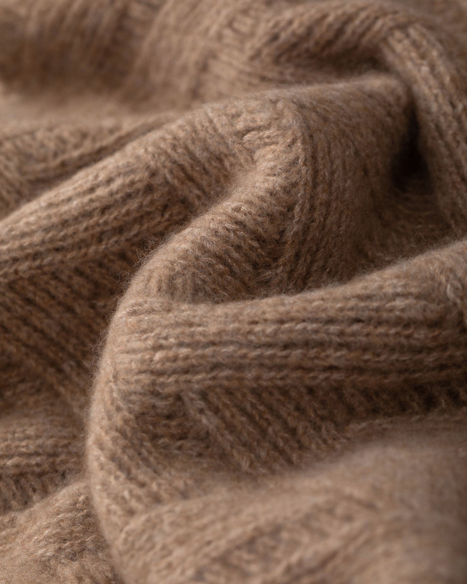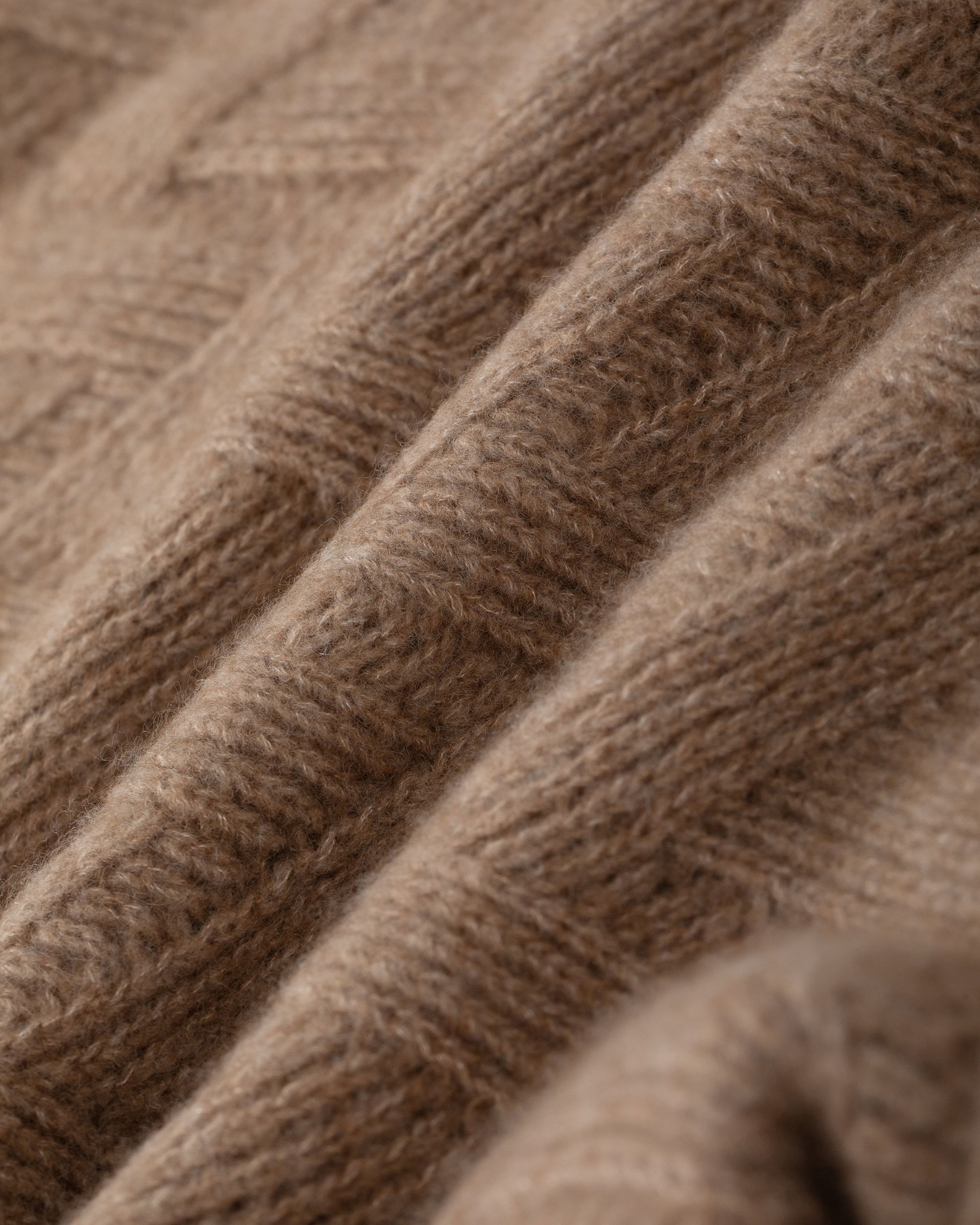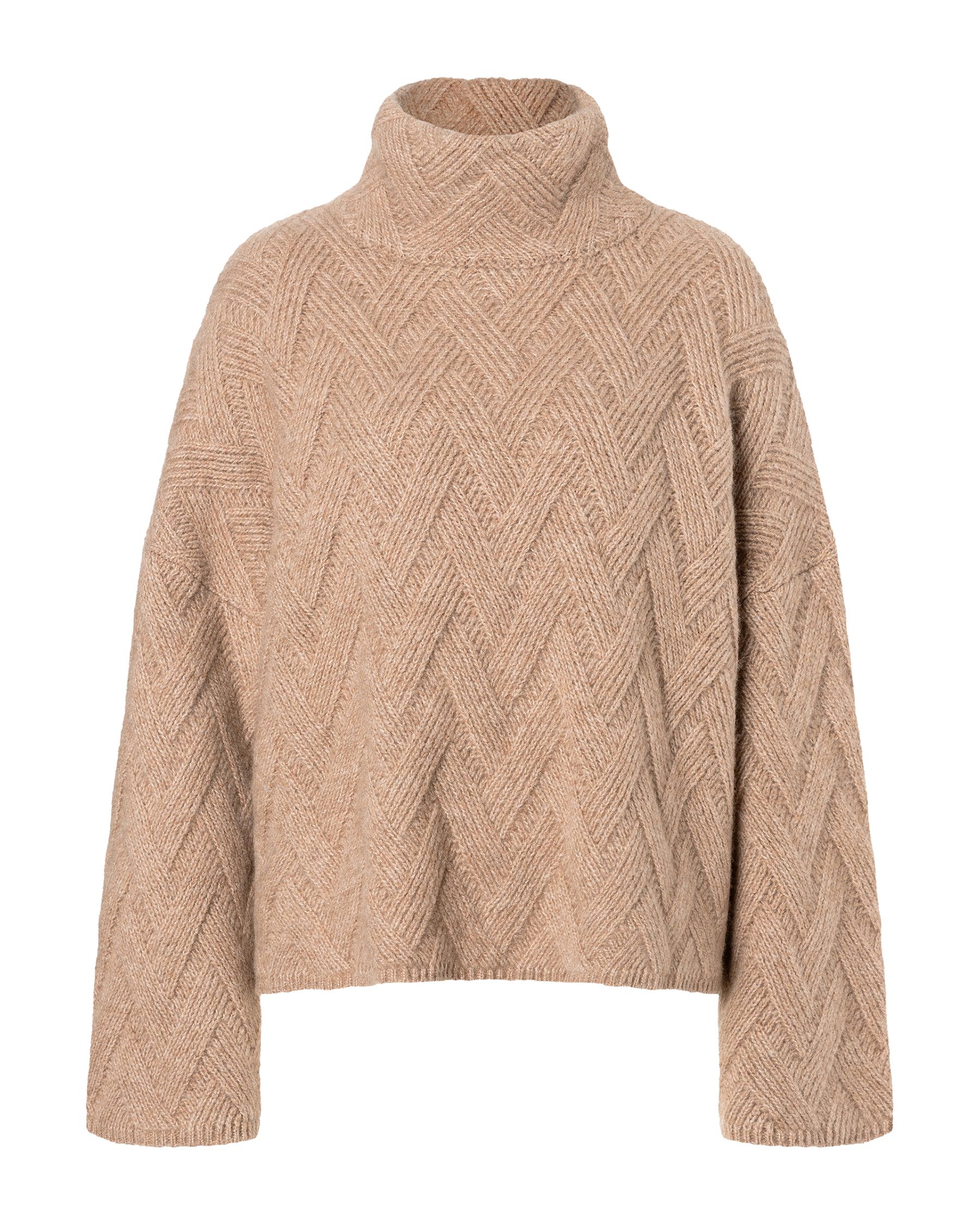 Dieser Pullover mit grafischem Zopfmuster und hohem, doppeltem Stehkragen verleiht Ihren Outfits eine markante Struktur. Tragen Sie ihn zu einer weiten Wollhose und Lederslippers für einen entspannten, aber stilvollen Look oder kombinieren Sie ihn mit einem Plisseerock und kniehohen Stiefeln für eine moderne, feminine Silhouette.