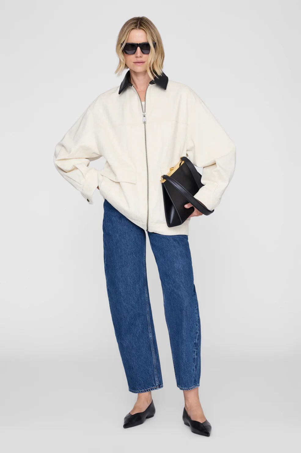 Die aus einem glatten, formstabilen Stoff gefertigte Jacke besticht durch einen markanten, spitz zulaufenden Kragen in kontrastierendem Schwarz, einen durchgehenden Frontreissverschluss und grosse aufgesetzte Taschen für einen funktionalen Look. Die lässige Silhouette und die überschnittenen Schultern verleihen der Holden Jacke mühelos Volumen, während die dezente Taillierung für eine elegante Form sorgt. Ein vielseitiges Kleidungsstück, das Stil und Lässigkeit perfekt vereint.