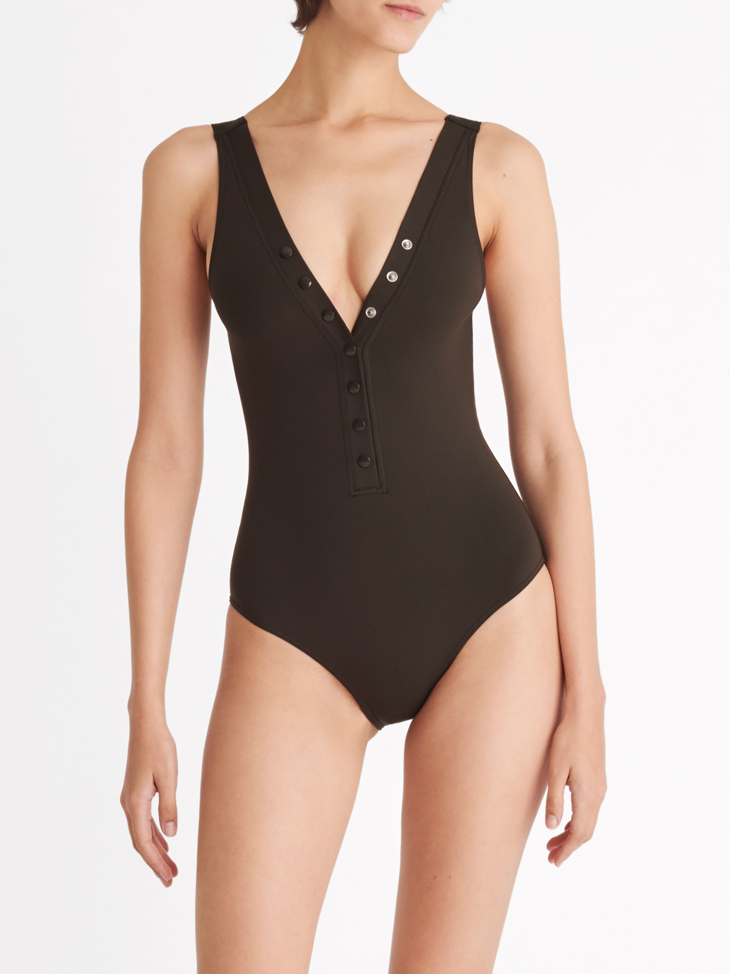 Unser Angebot an Basics wird in dieser Saison durch einen neuen ikonischen Badeanzug ergänzt. Der Badeanzug Icône weist einen V-Ausschnitt auf, der von funktionalen Druckknöpfen unterstrichen wird. Typisch für die Maison ERES kombiniert er Schlichtheit mit Feminität.