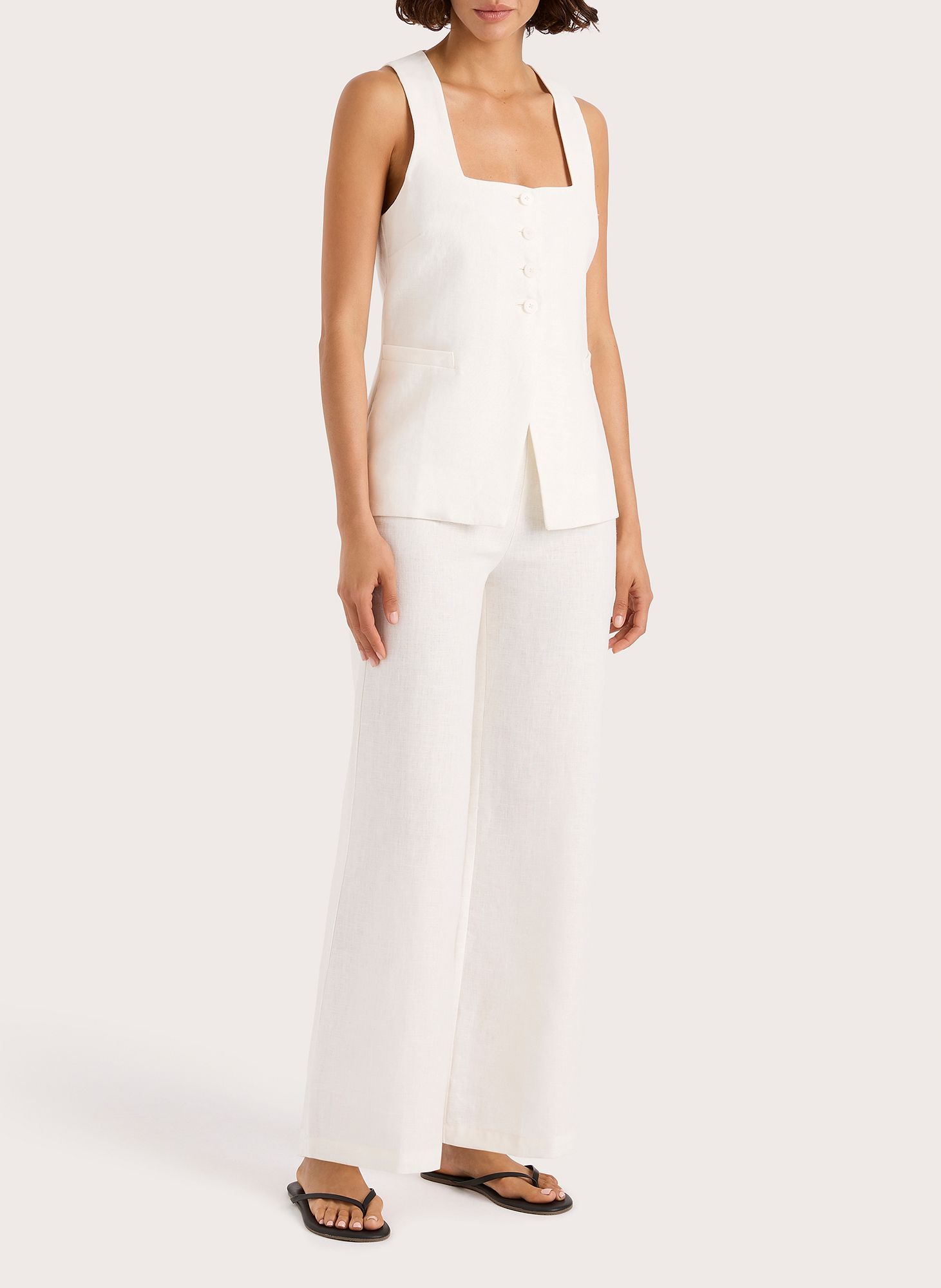 Das charakteristische FAITHFULL-Design wurde mit neuen, raffinierten Details neu interpretiert und aus 100 % europäischem Leinen (Flax®) in Cremeweiss gefertigt. Das Top im Westenstil besticht durch einen tiefen, eckigen Ausschnitt und breite Träger. Es ist leicht tailliert geschnitten und verfügt über vier Knöpfe vorne, einen V-Ausschnitt in der vorderen Mitte, Seitentaschen und einen verstellbaren Taillengürtel im Rücken. Das vollständig gefütterte Top lässt sich ideal mit einer zeitlosen Hose für einen lässigen Urlaubslook kombinieren.