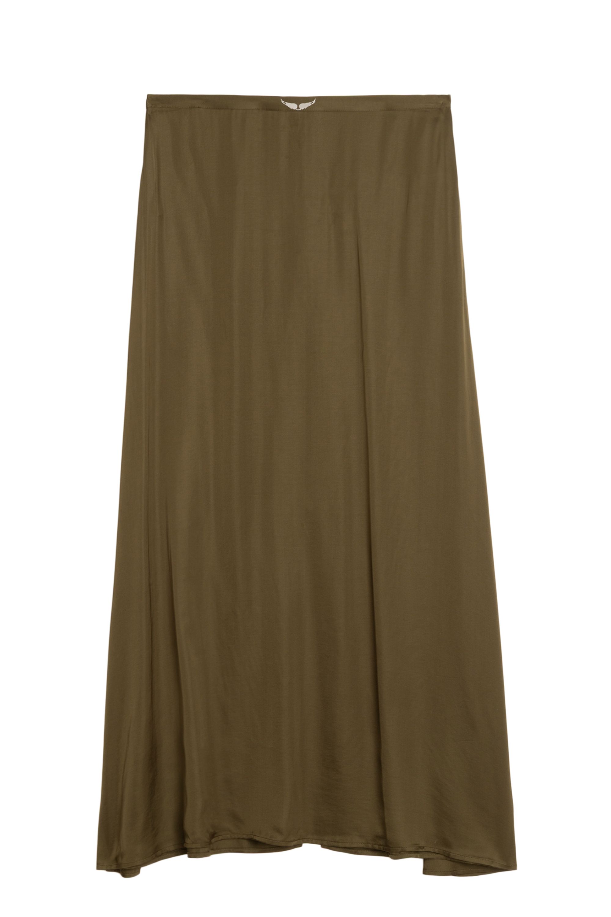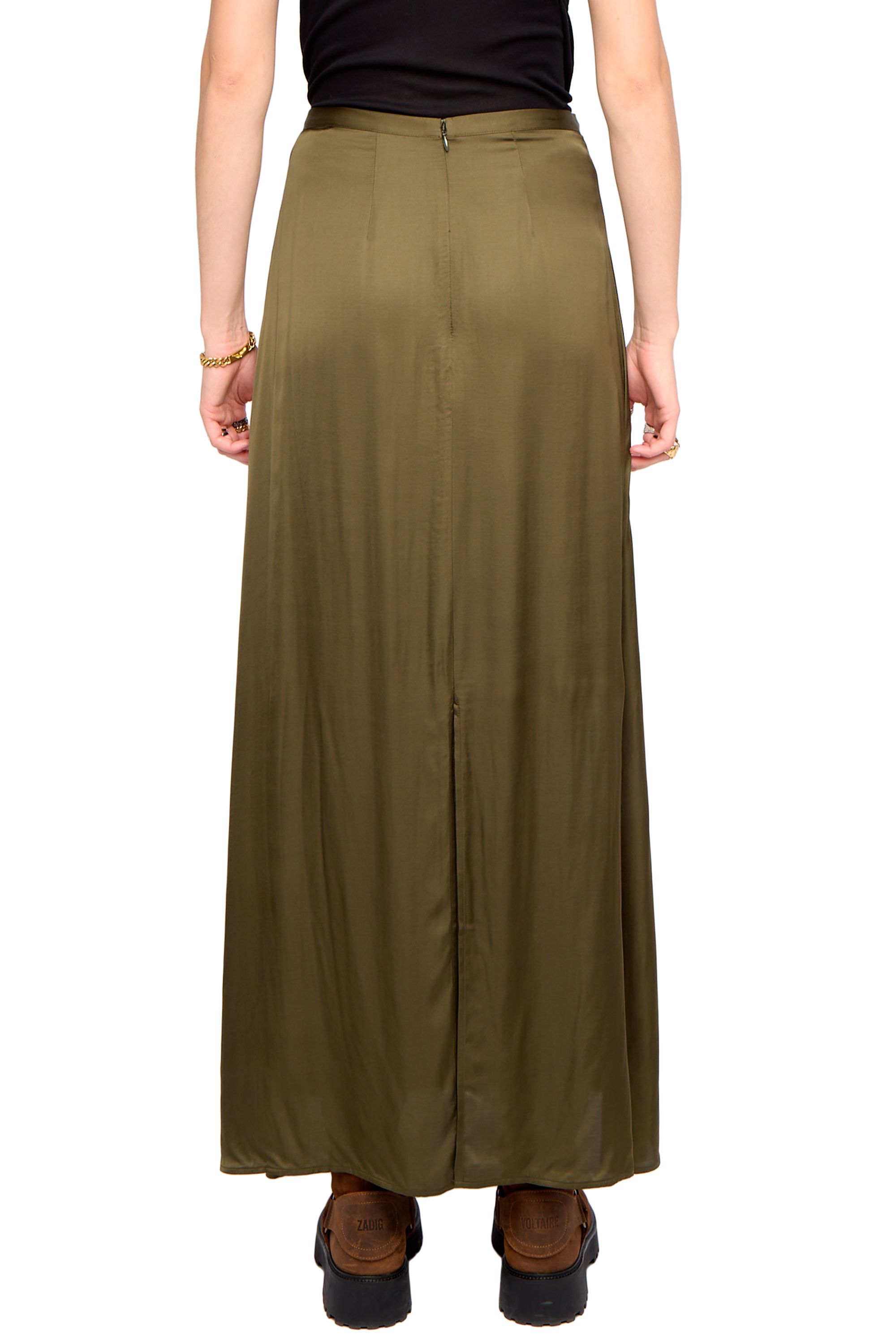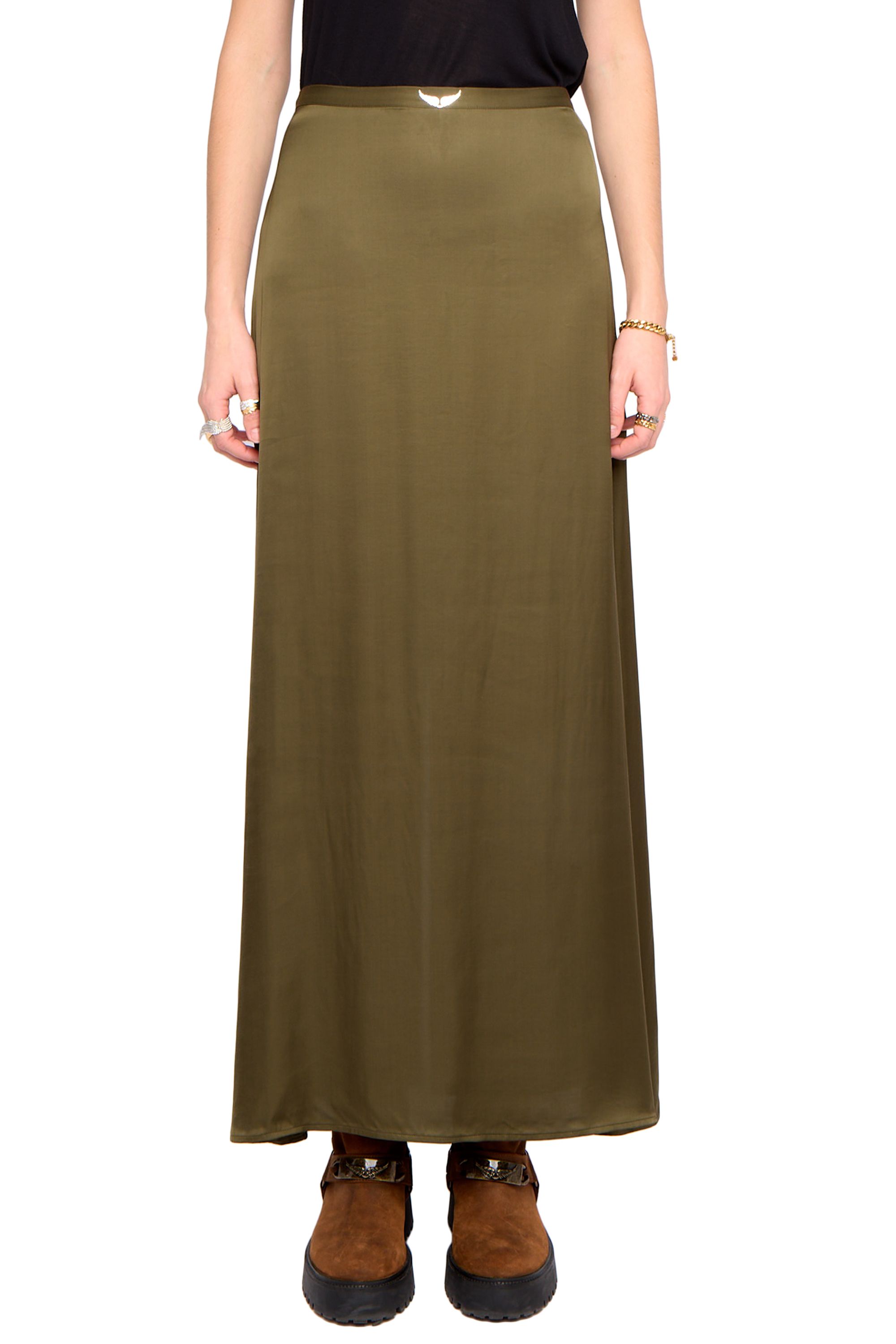 Langer Rock aus Viskose-Satin mit Rückenschlitz, Reissverschluss und Metallflügeln am Gürtel.
