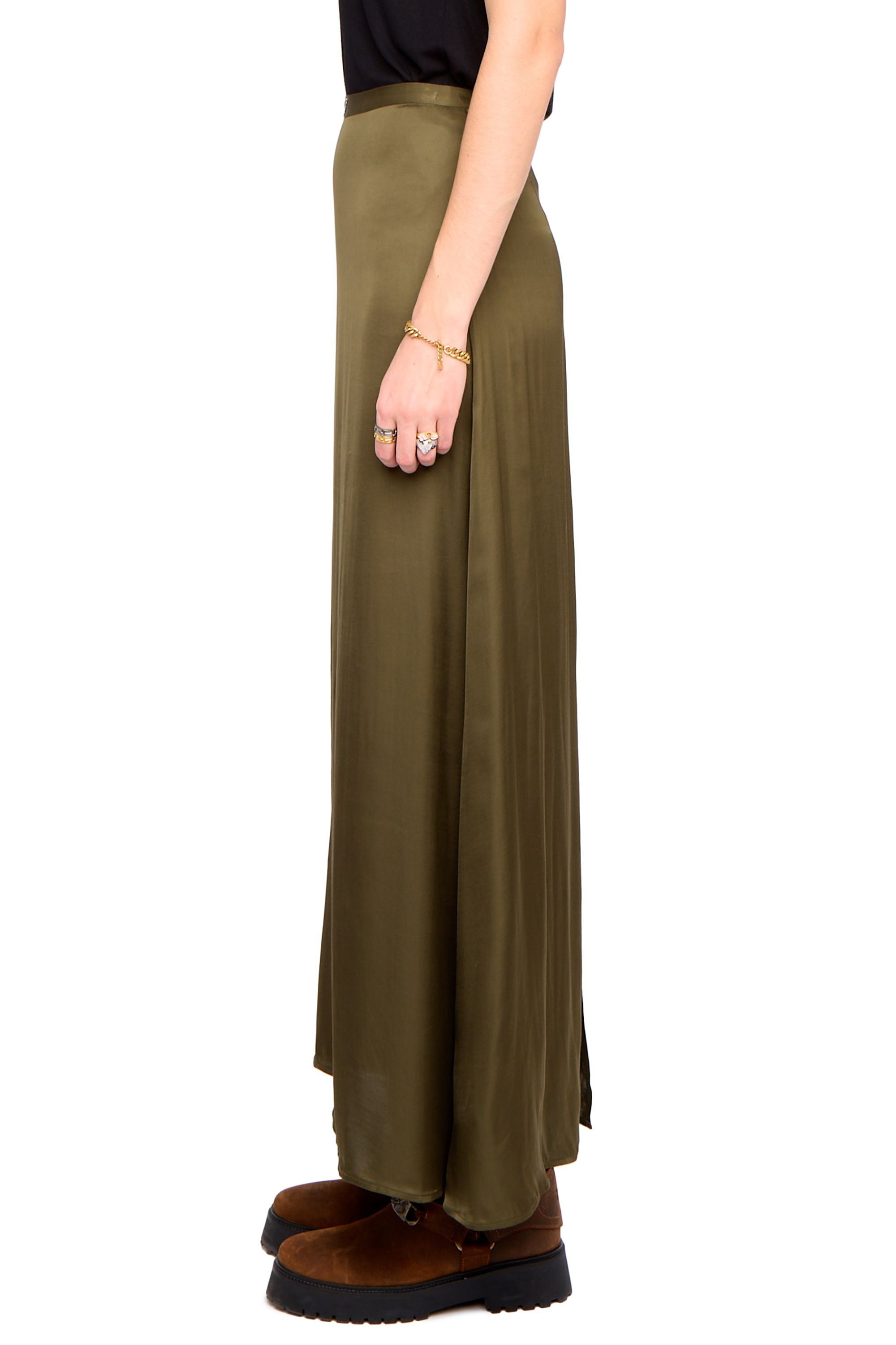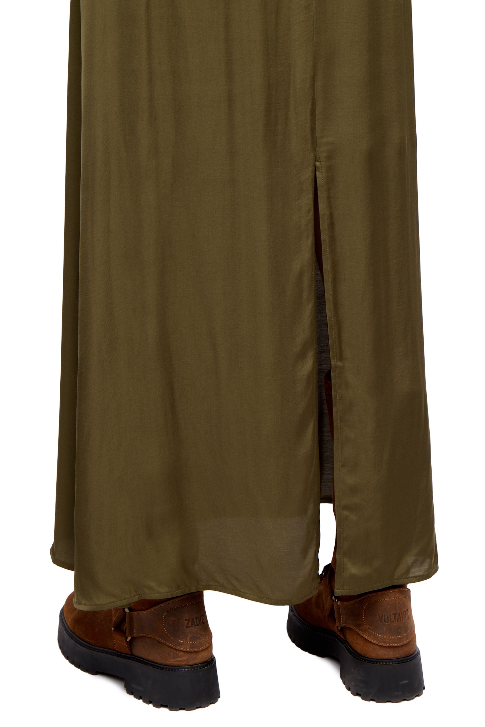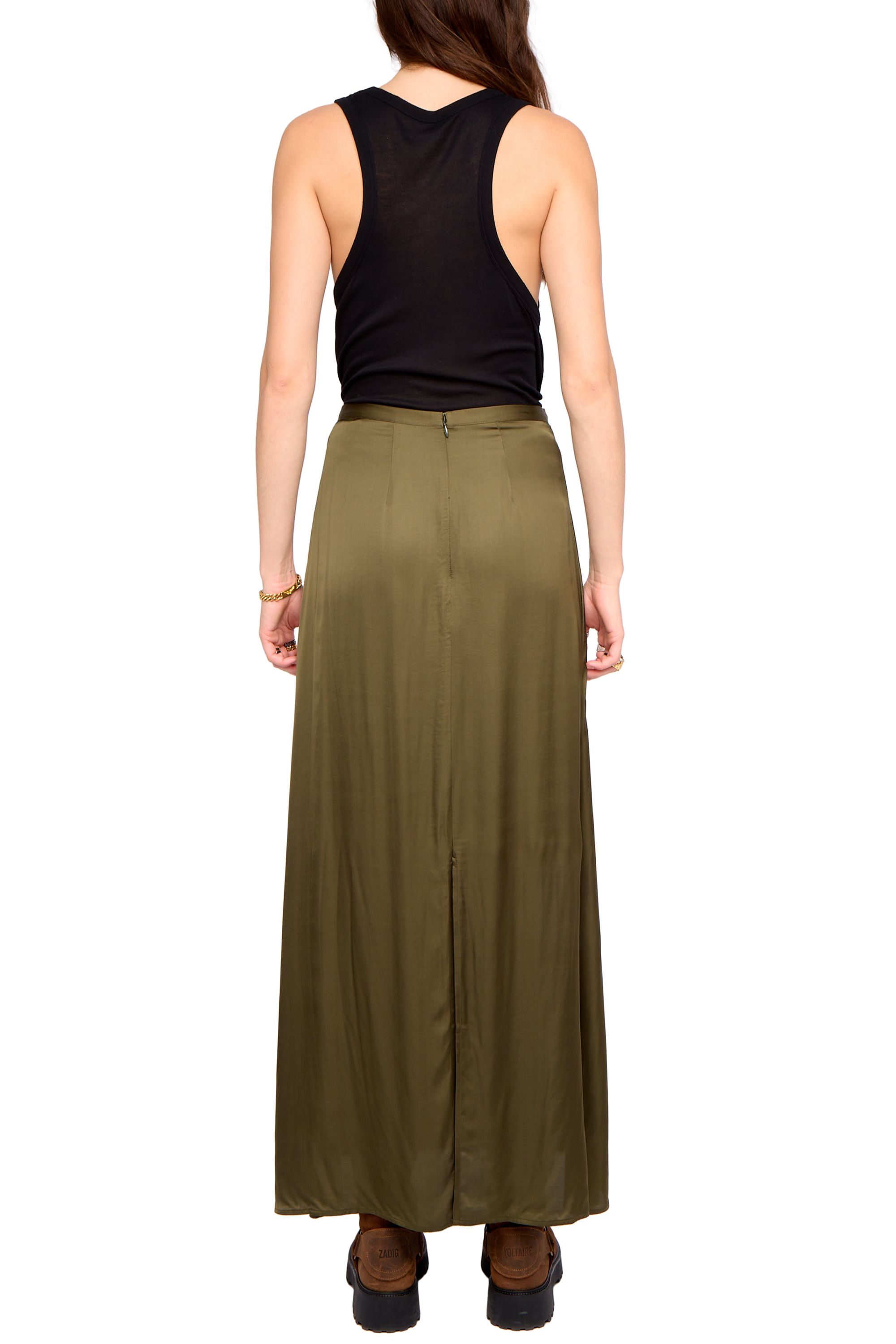 Langer Rock aus Viskose-Satin mit Rückenschlitz, Reissverschluss und Metallflügeln am Gürtel.