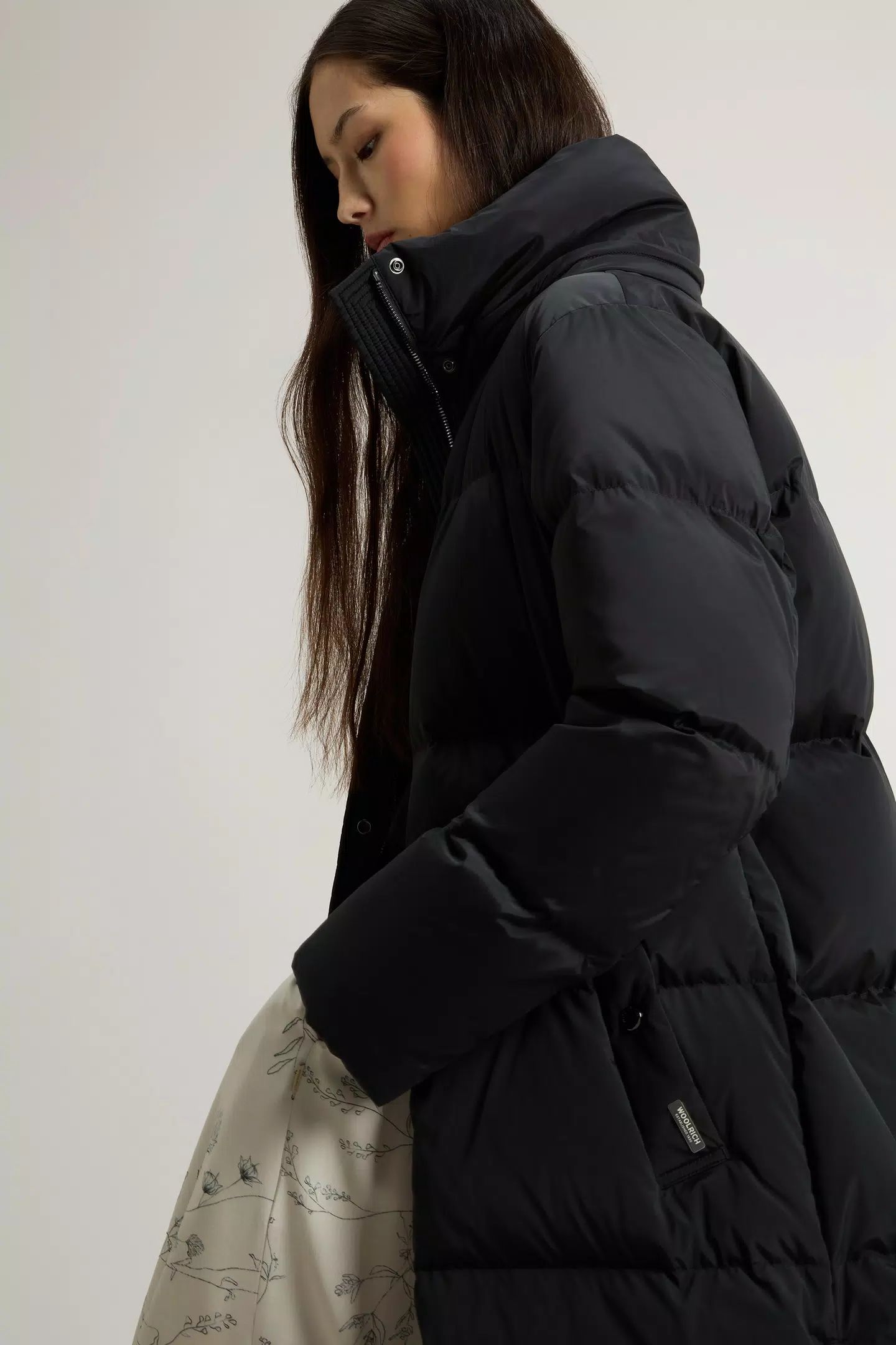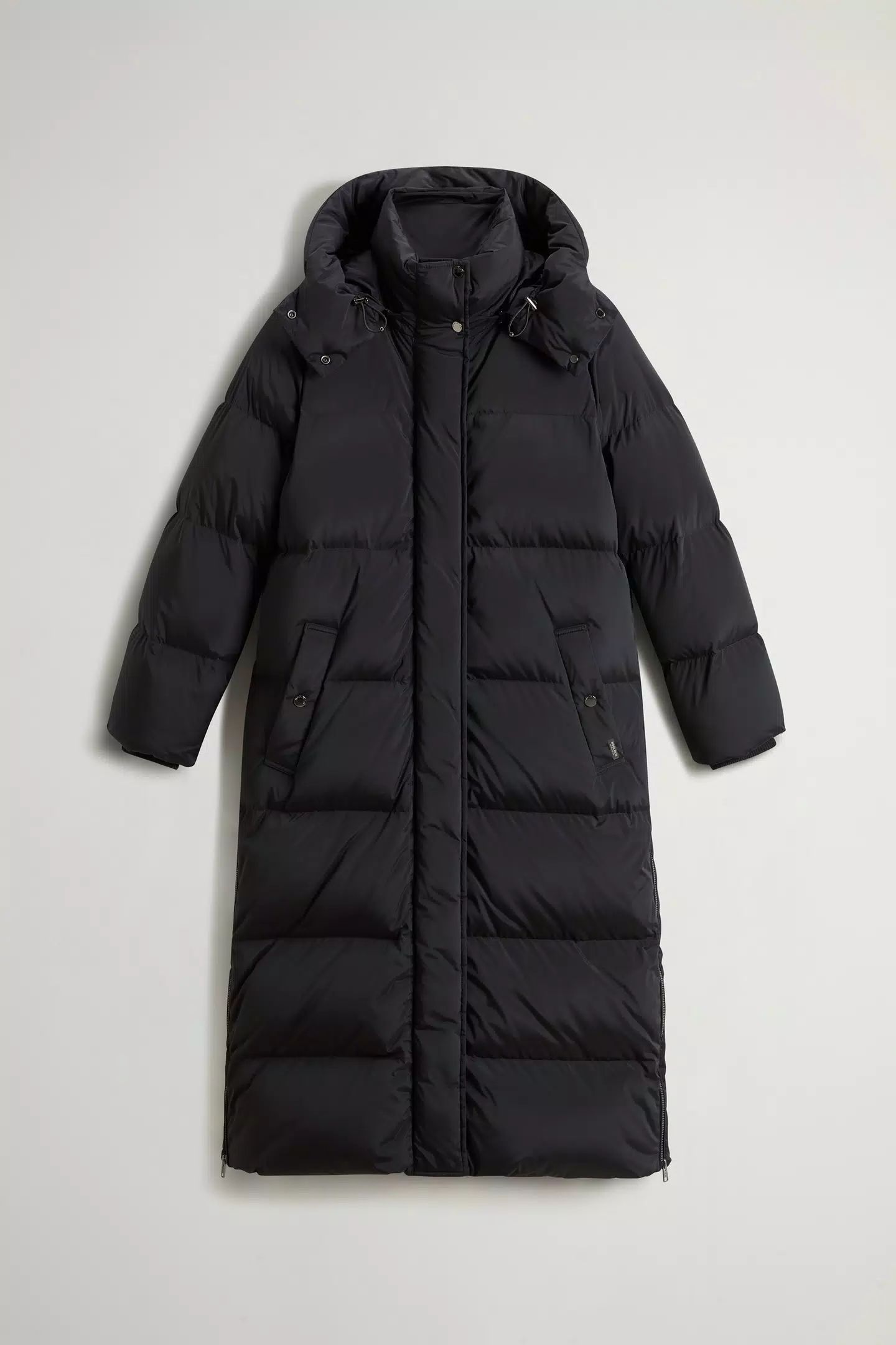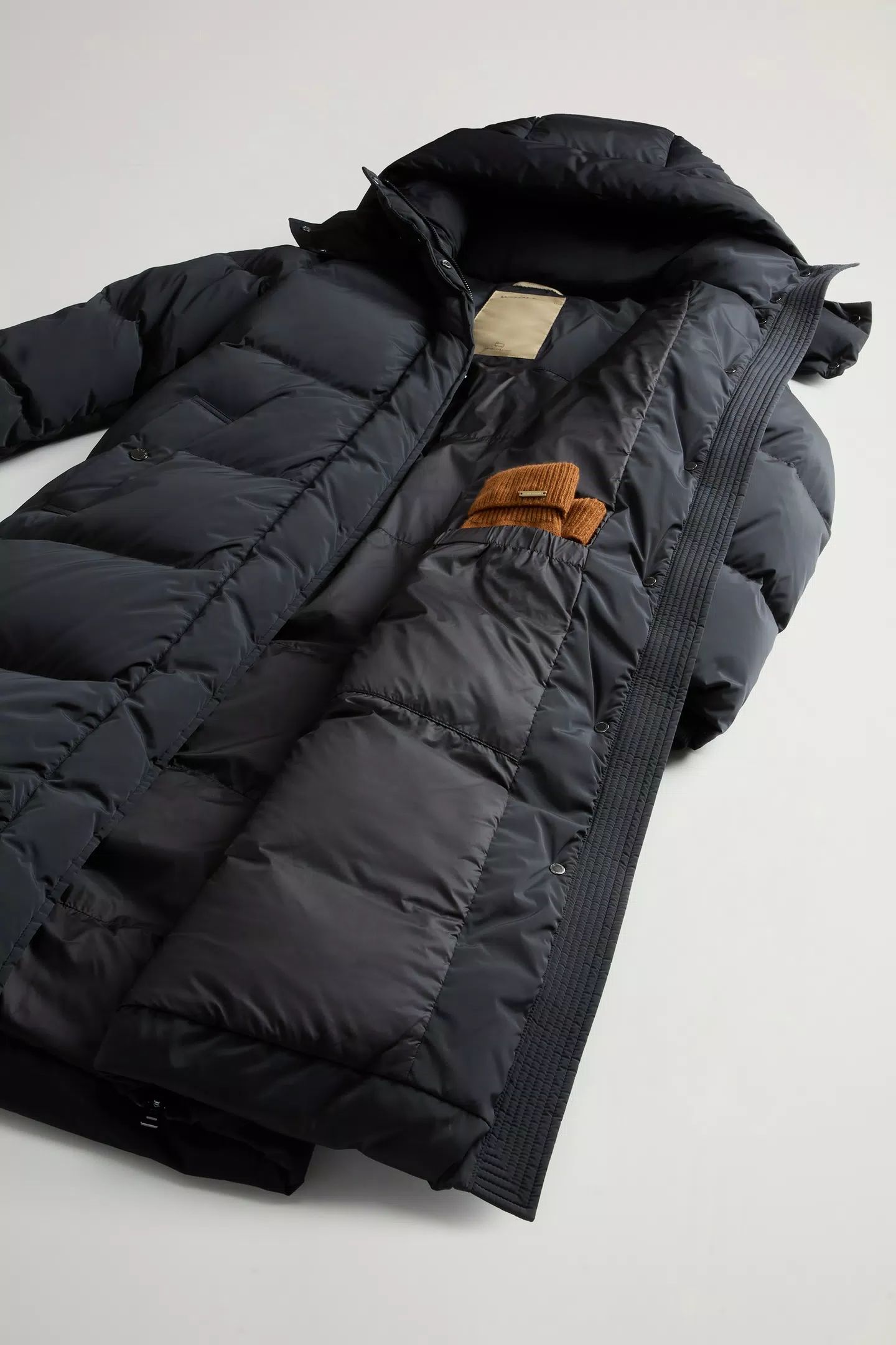 Dieser lange Parka ist eine Neuinterpretation des Woolrich-Klassikers, die durch typische Street-Style-Details aufgewertet wird und einen Platz in Ihrer Wintergarderobe verdient. Das windbeständige und wasserabweisende Modell ist mit Entendaunen gefüttert und mit einer Quersteppung versehen, um die Wärme besser zu halten. Es verfügt über funktionale Elemente wie die abnehmbare, verstellbare Kapuze mit Stopper, den hohen Kragen mit Druckknöpfen für besseren Kälteschutz und praktische Taschen: zwei seitliche Paspeltaschen und eine Innentasche. Der verdeckte Verschluss mit Reissverschluss und Druckknöpfen rundet das klare Design ab, während die Rippbündchen und die seitlichen Öffnungen mit Reissverschluss für eine optimale Passform sorgen.
