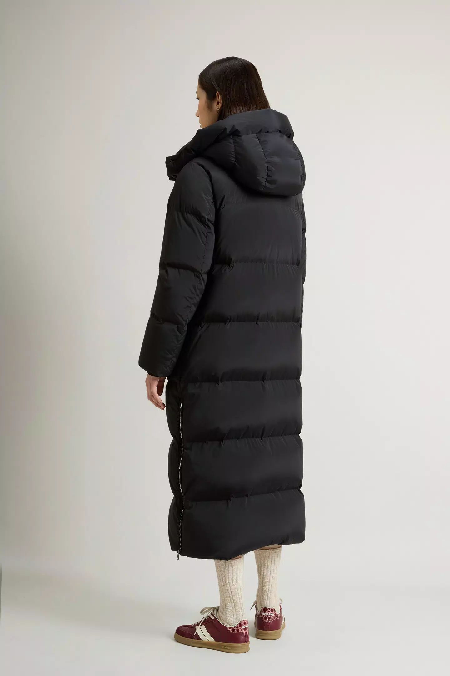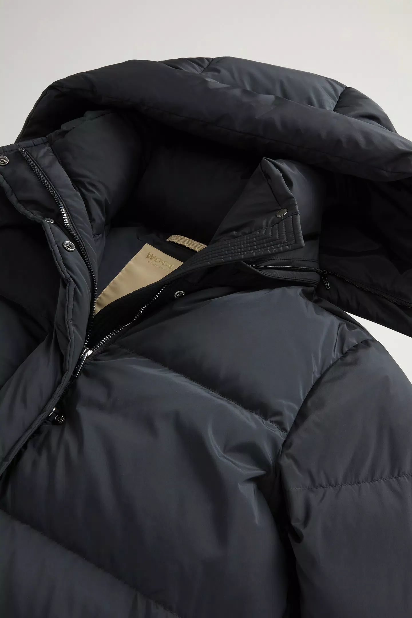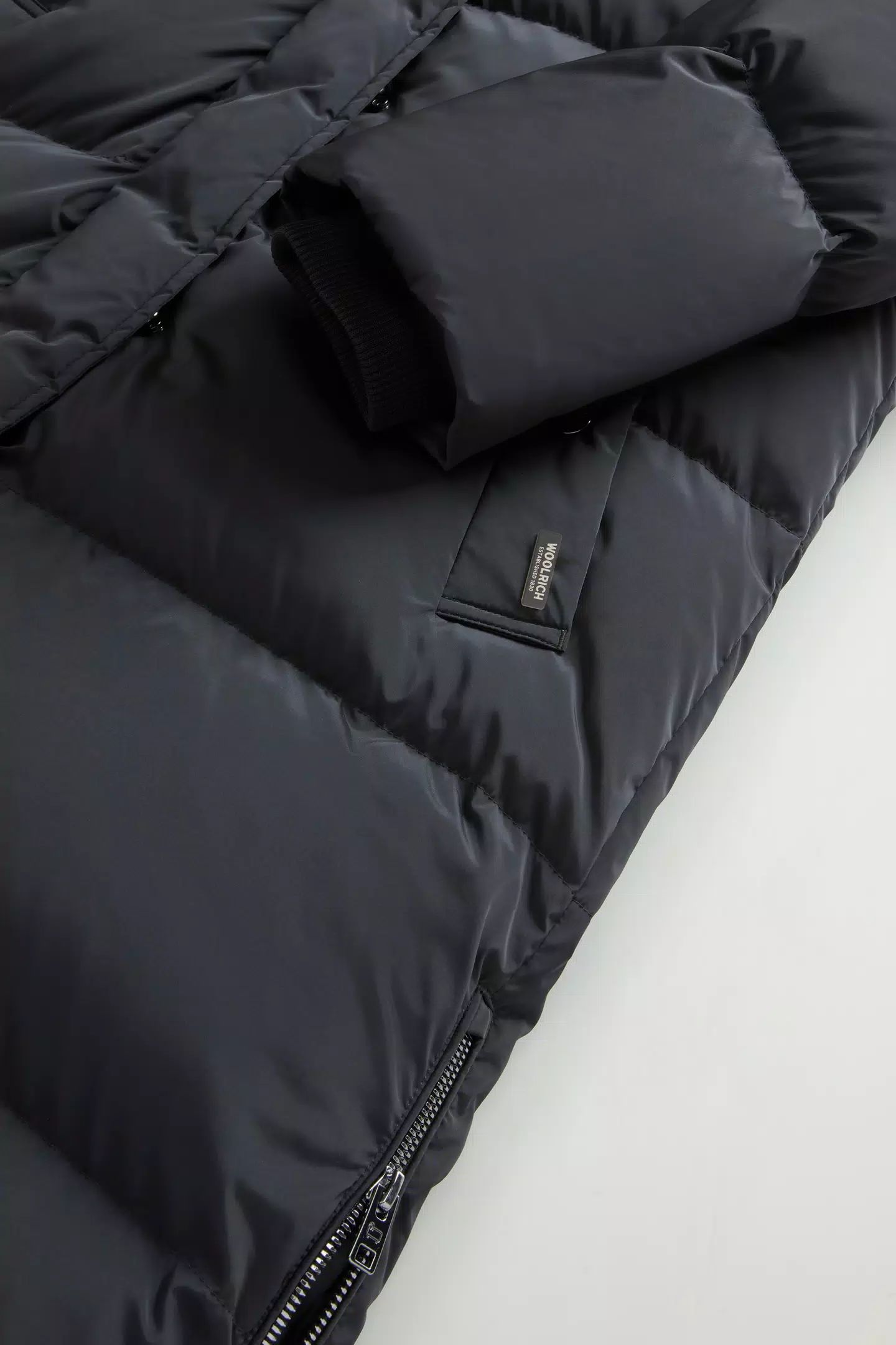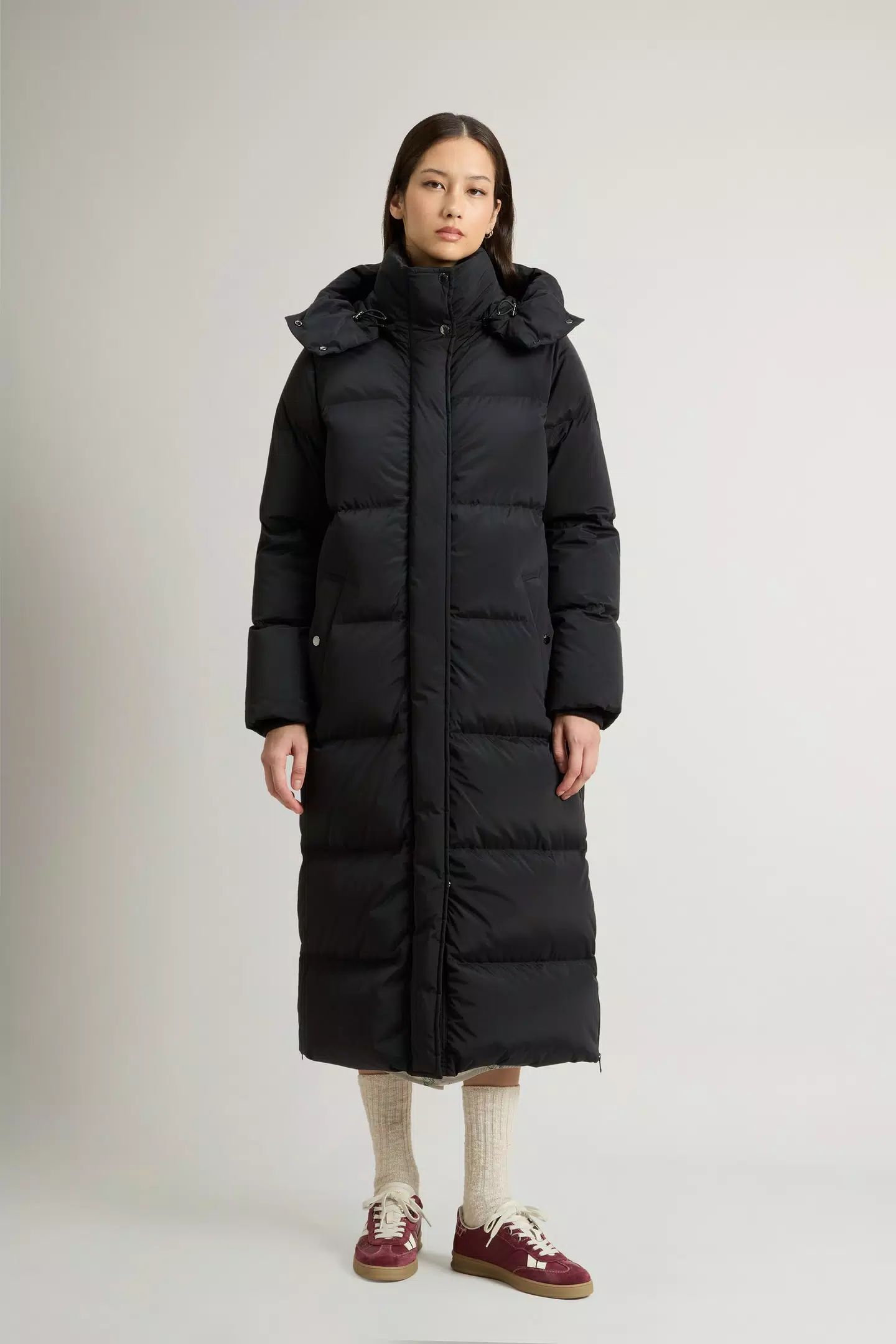 Dieser lange Parka ist eine Neuinterpretation des Woolrich-Klassikers, die durch typische Street-Style-Details aufgewertet wird und einen Platz in Ihrer Wintergarderobe verdient. Das windbeständige und wasserabweisende Modell ist mit Entendaunen gefüttert und mit einer Quersteppung versehen, um die Wärme besser zu halten. Es verfügt über funktionale Elemente wie die abnehmbare, verstellbare Kapuze mit Stopper, den hohen Kragen mit Druckknöpfen für besseren Kälteschutz und praktische Taschen: zwei seitliche Paspeltaschen und eine Innentasche. Der verdeckte Verschluss mit Reissverschluss und Druckknöpfen rundet das klare Design ab, während die Rippbündchen und die seitlichen Öffnungen mit Reissverschluss für eine optimale Passform sorgen.