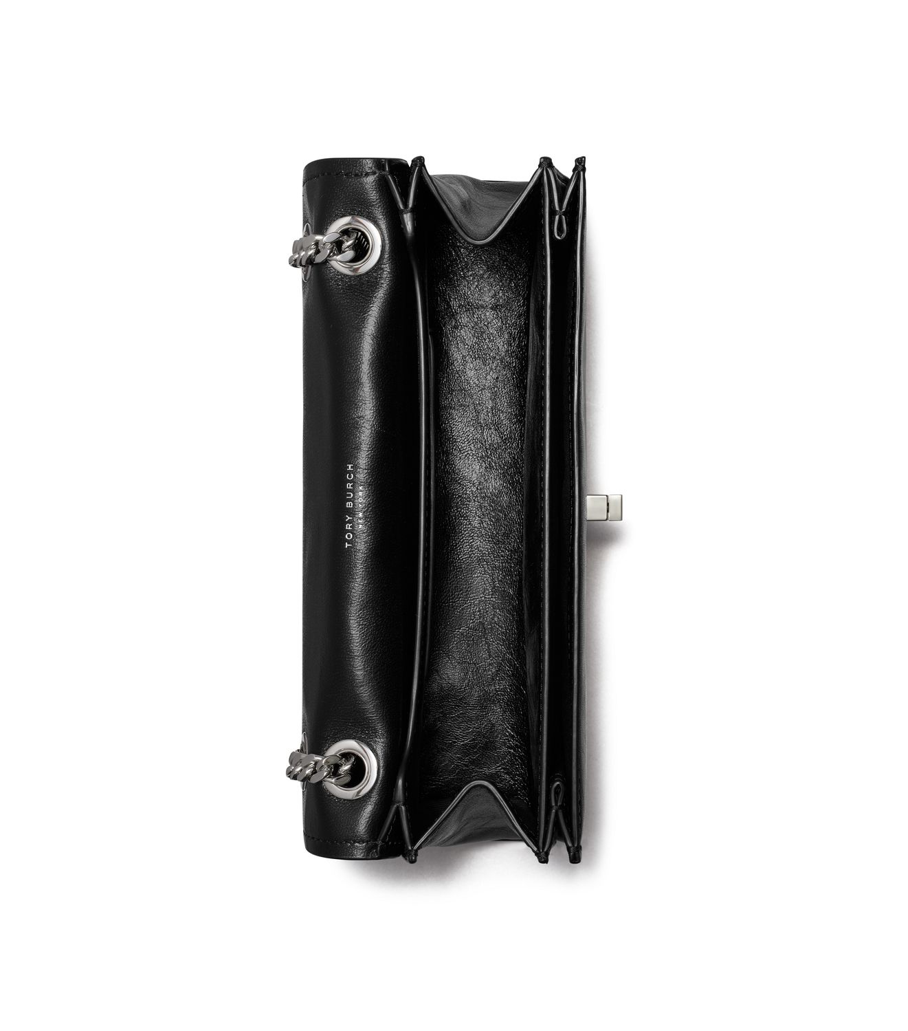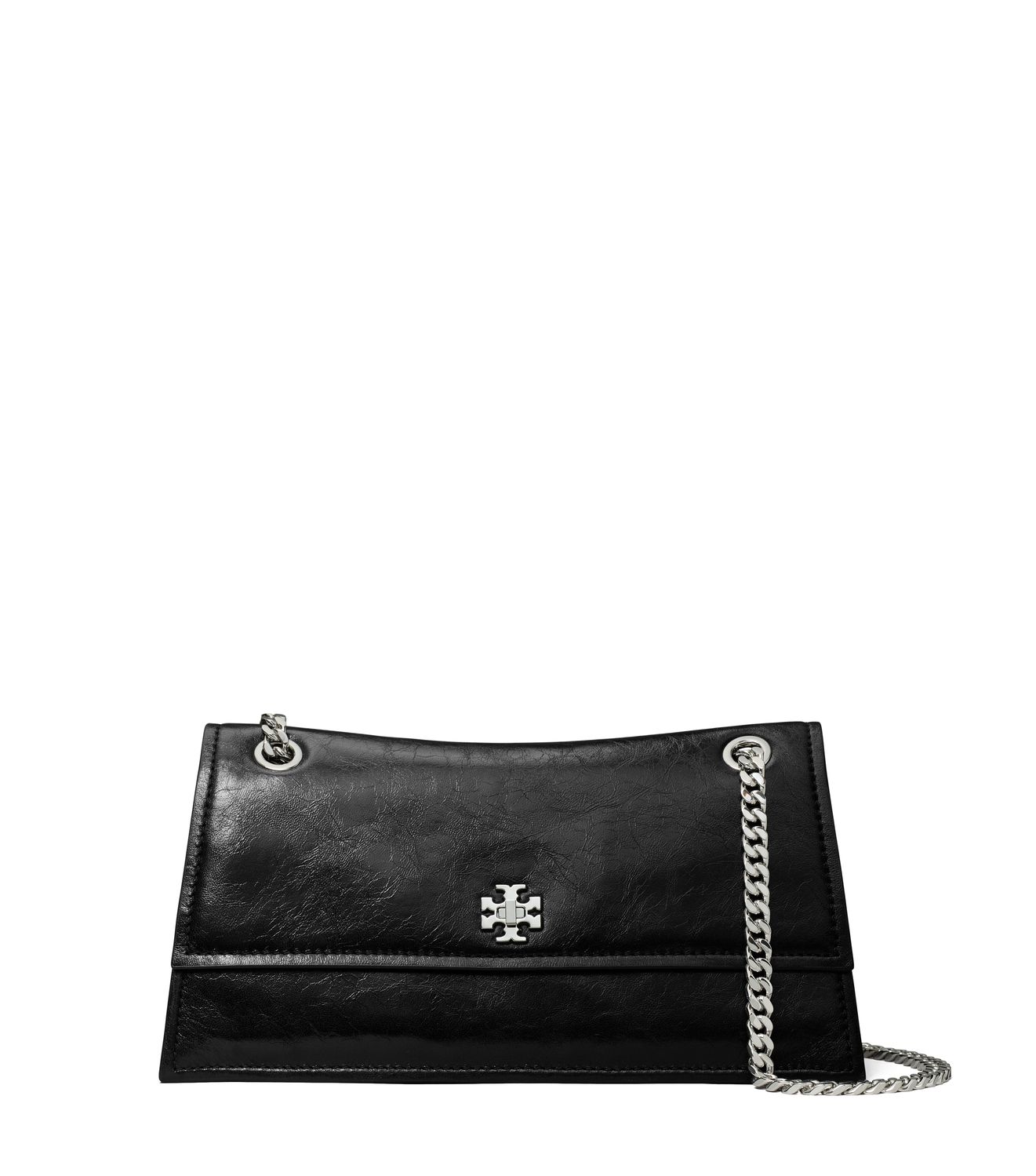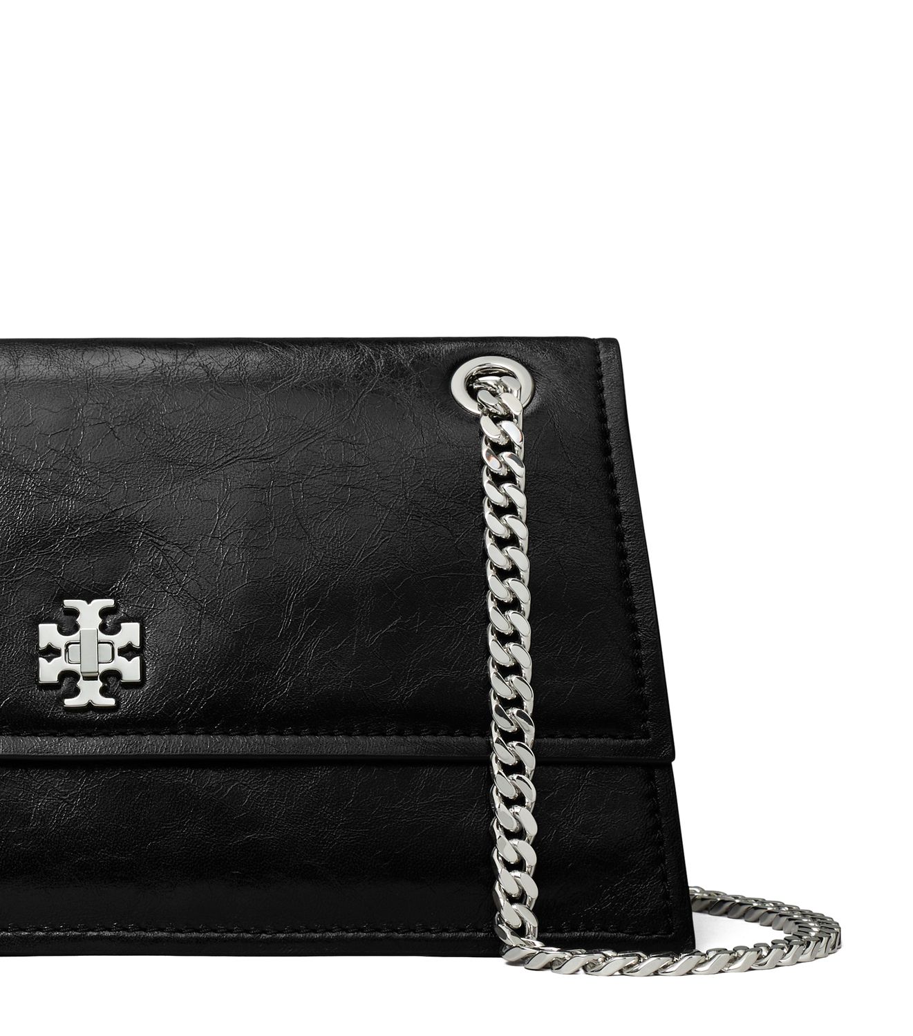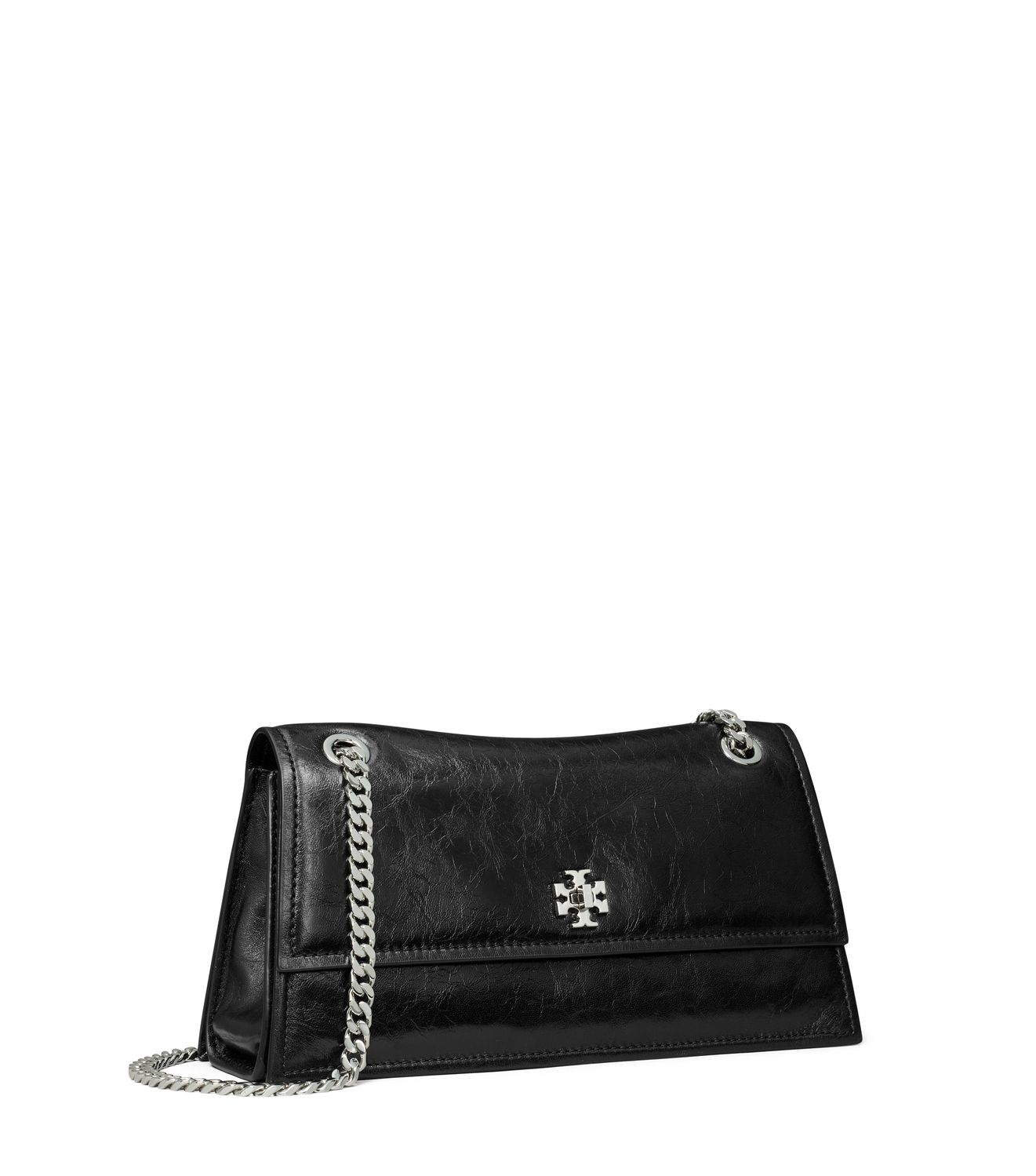 Ein charakteristisches abgeschrägtes Doppel-T wird auf unserer neuen Kira Schultertasche zu einem grafischen Metalldrehverschluss. Die Tasche verfügt über eine klassische Umschlagsilhouette mit wandelbarem Kettenriemen und geschnittenen Kanten.