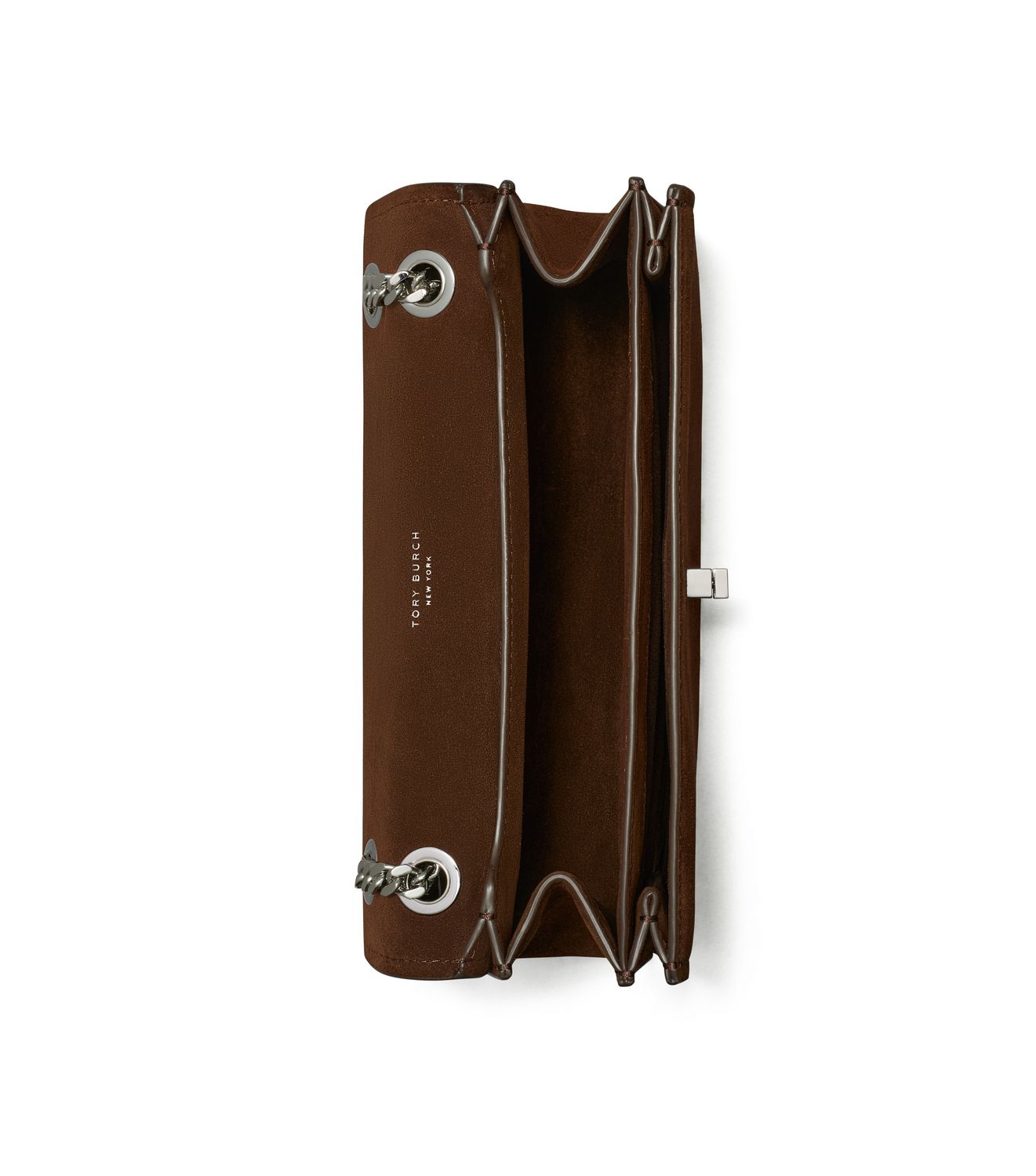Ein charakteristisches abgeschrägtes Doppel-T wird auf unserer neuen Kira Schultertasche zu einem grafischen Metalldrehverschluss. Die Tasche verfügt über eine klassische Umschlagsilhouette mit wandelbarem Kettenriemen und geschnittenen Kanten.