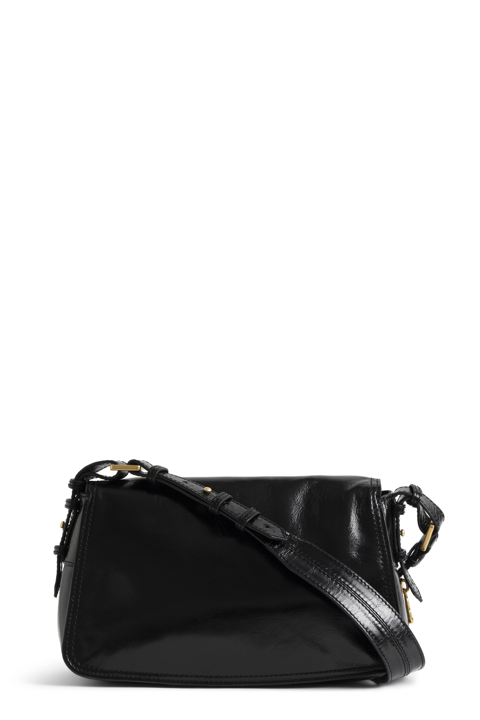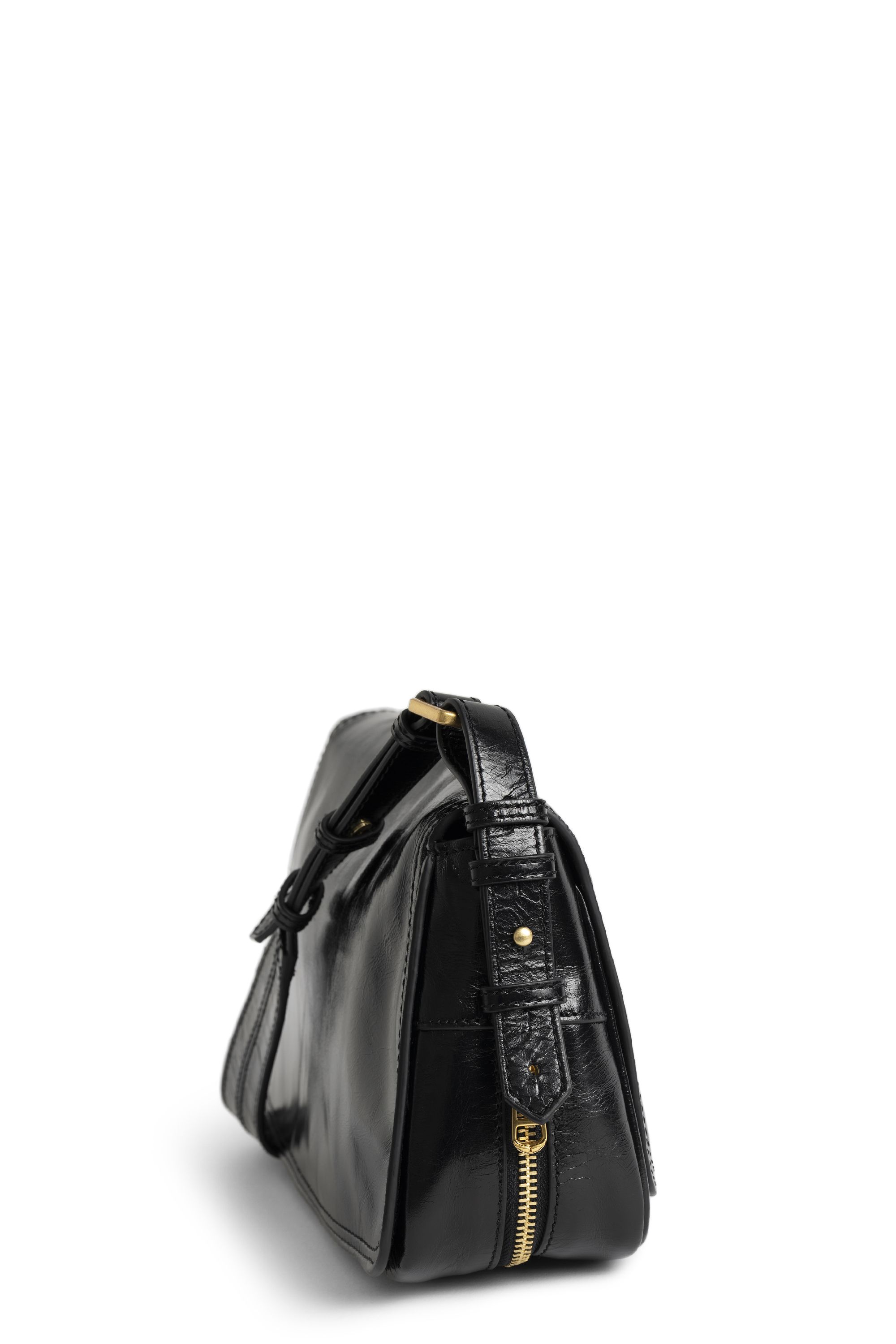 Kleine Tasche aus Lackleder mit Vintage-Effekt, mit verstellbarem Schulterriemen und charakteristischen Flügeln.