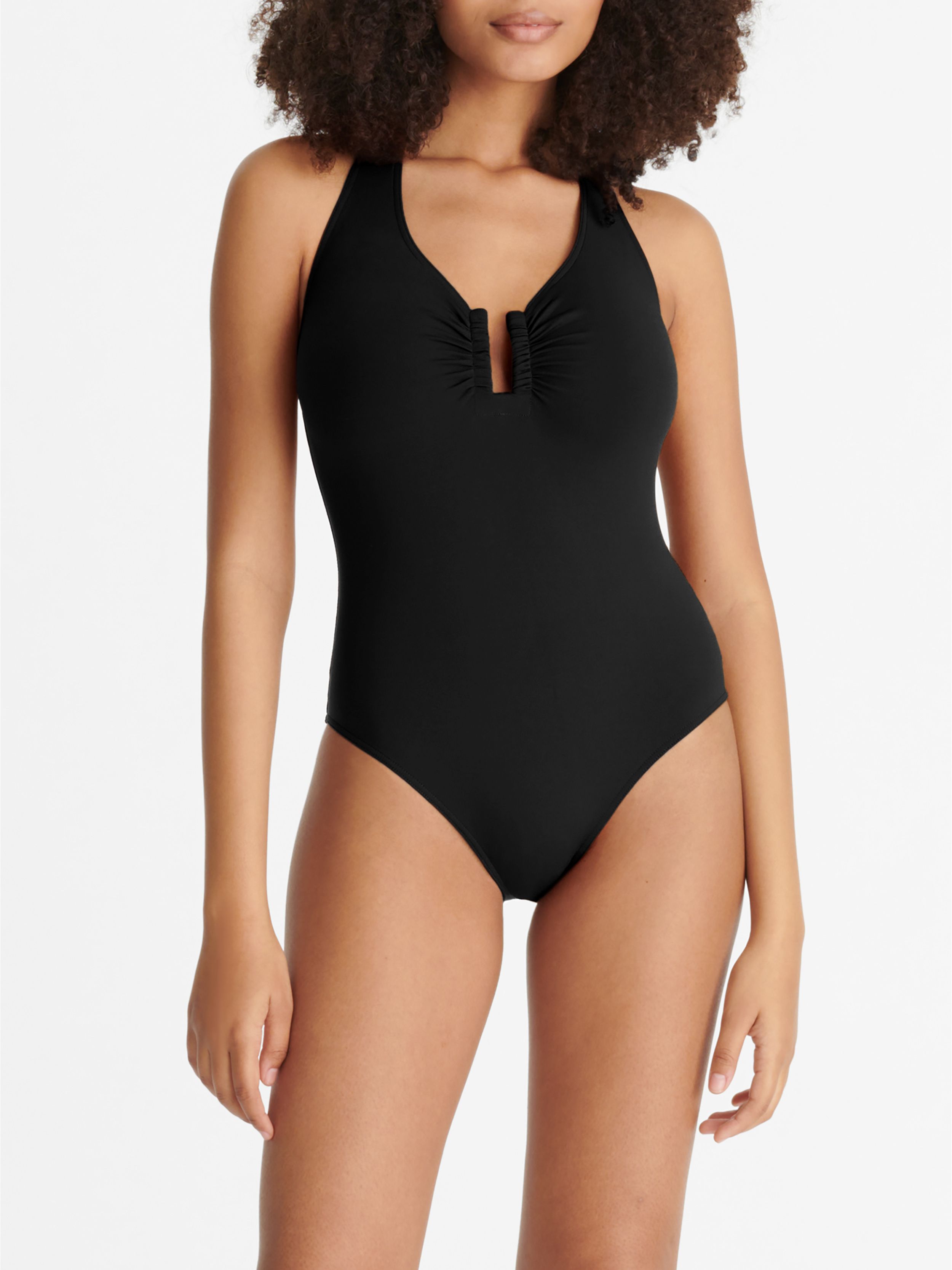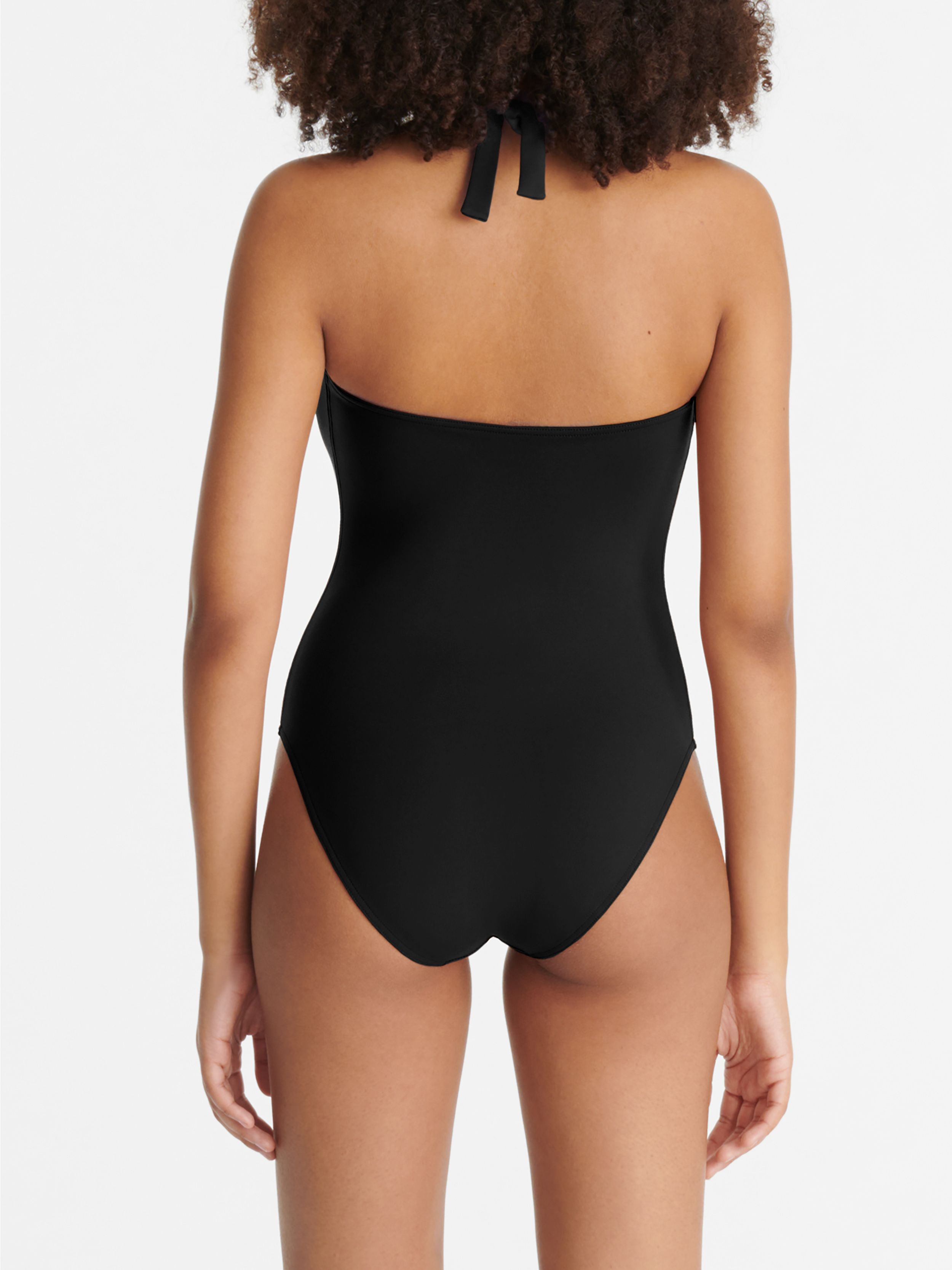 Dieser edle Badeanzug mit Neckholder-Trägern besticht durch seinen Ausschnitt mit U-Metallbügel. Das grafische, feminine Modell schmeichelt jeder Figur.