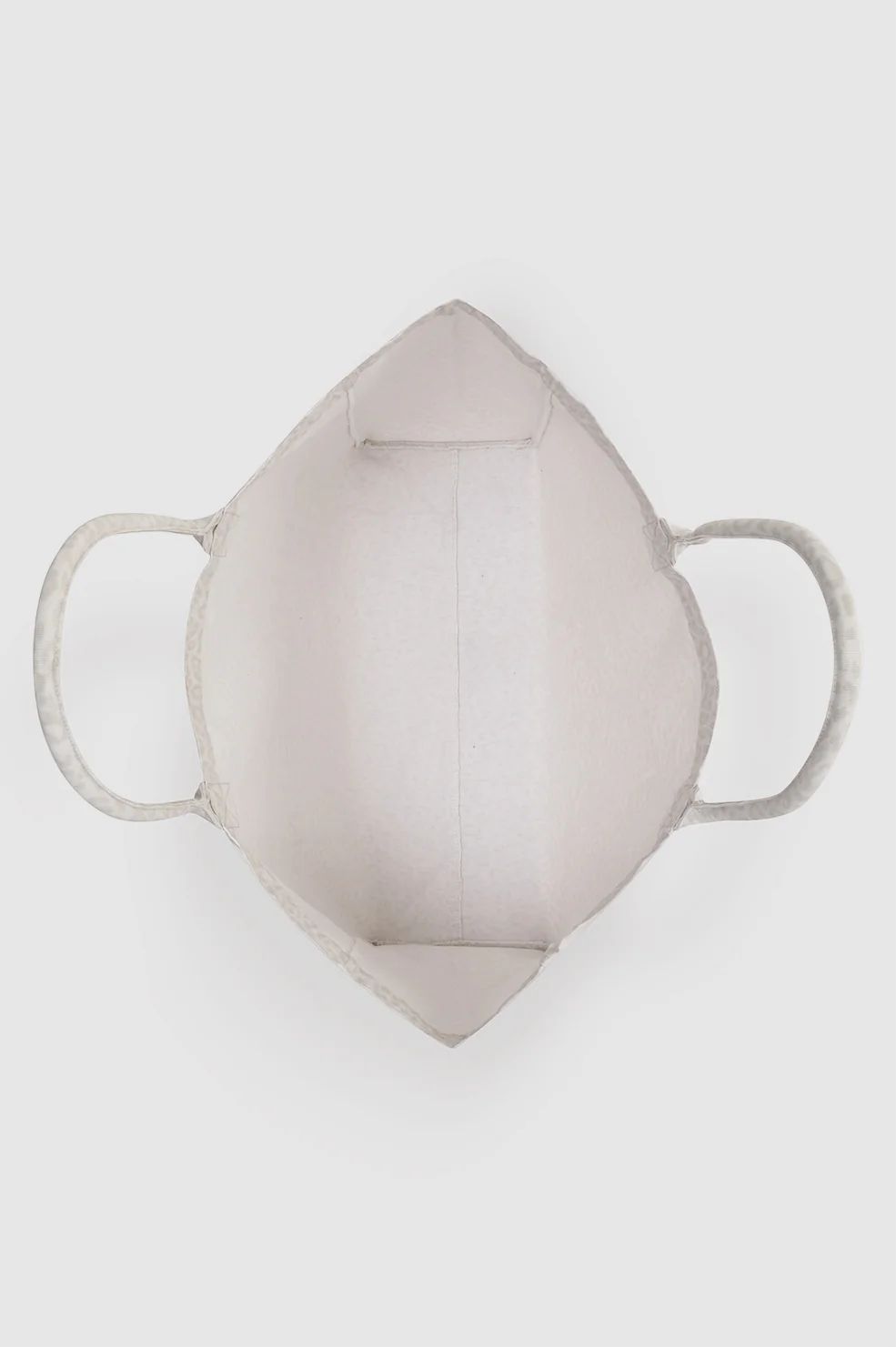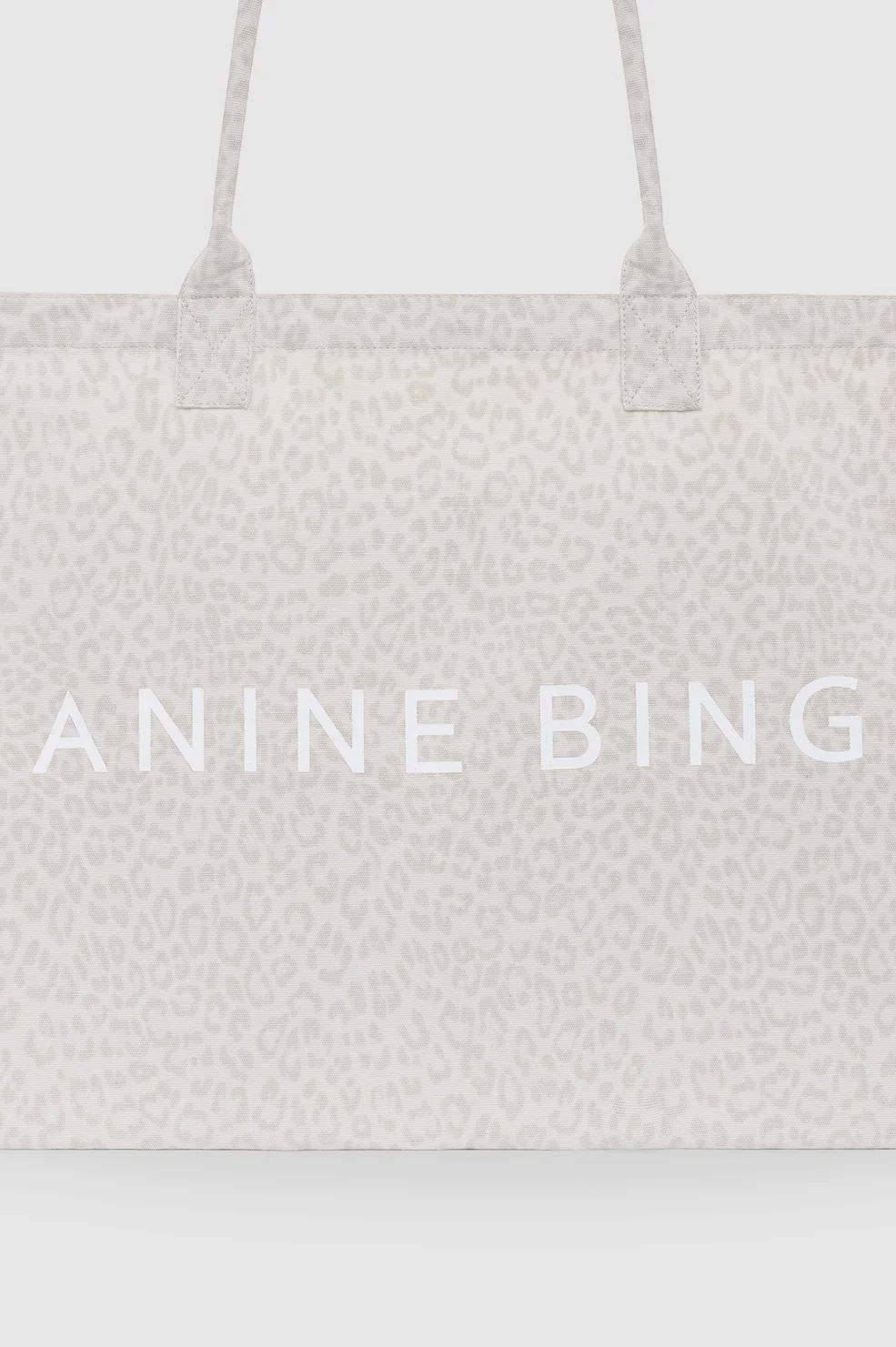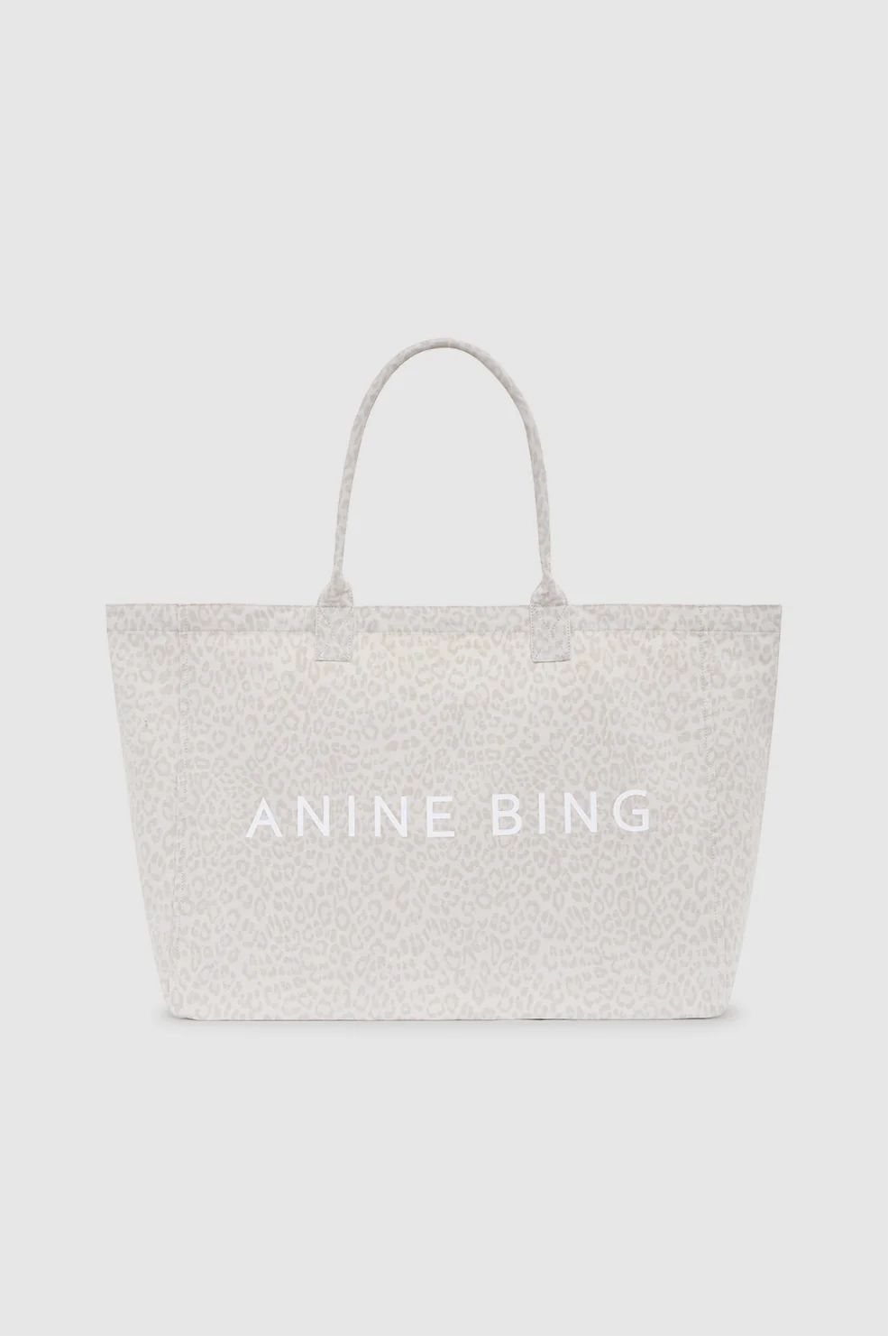 Eine ungefütterte Tragetasche aus Canvas mit einem durchgehenden, verwaschenen weissen Leopardenmuster und aufgedrucktem ANINE BING-Logo.