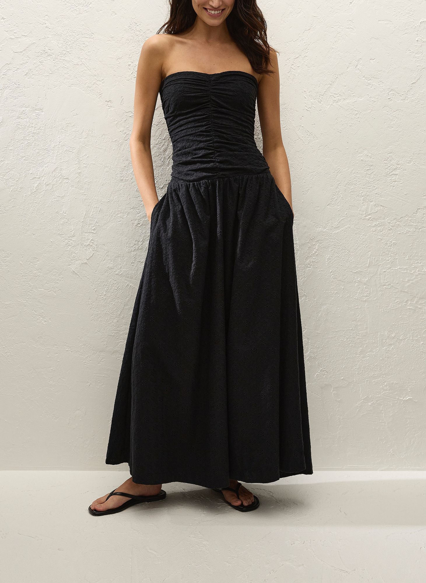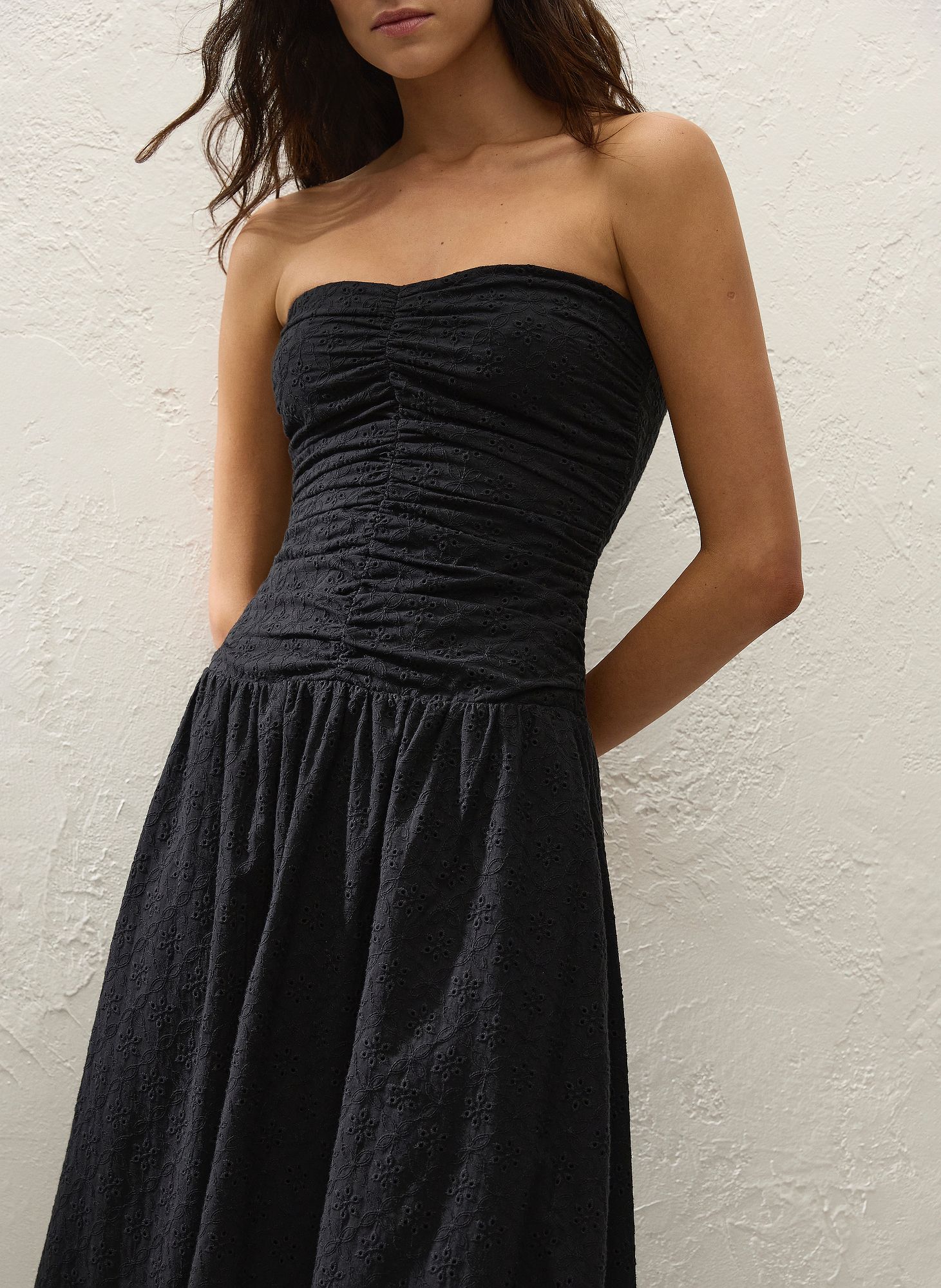 Ein feminines Maxikleid aus feinstem, schwarzem Lochstickerei-Stoff. Das trägerlose Kleid mit figurbetontem Oberteil besticht durch Raffungen vorne, die ihm einen Hauch von Vintage verleihen, und eine geraffte Taille. Der Rock fällt sanft in A-Linie und endet knapp über den Knöcheln. Kombinieren Sie es mit Kitten Heels für das perfekte kleine Schwarze für den Sommer.