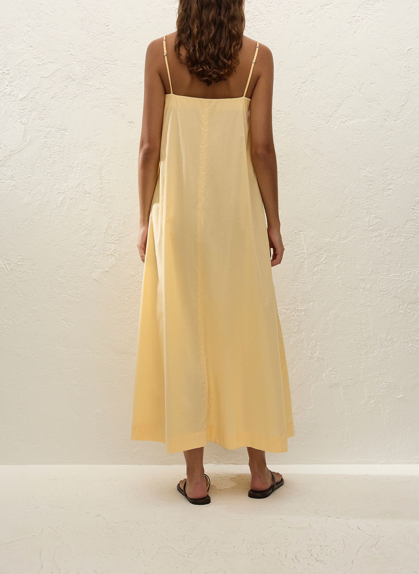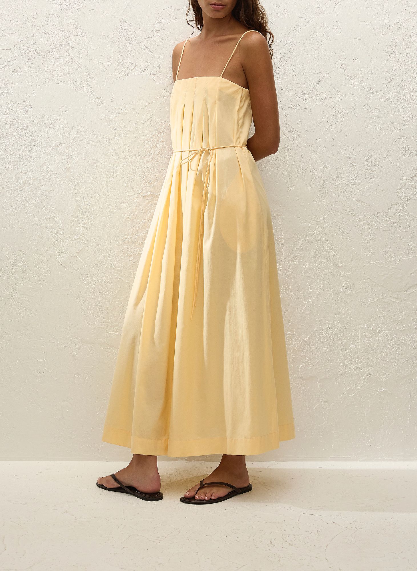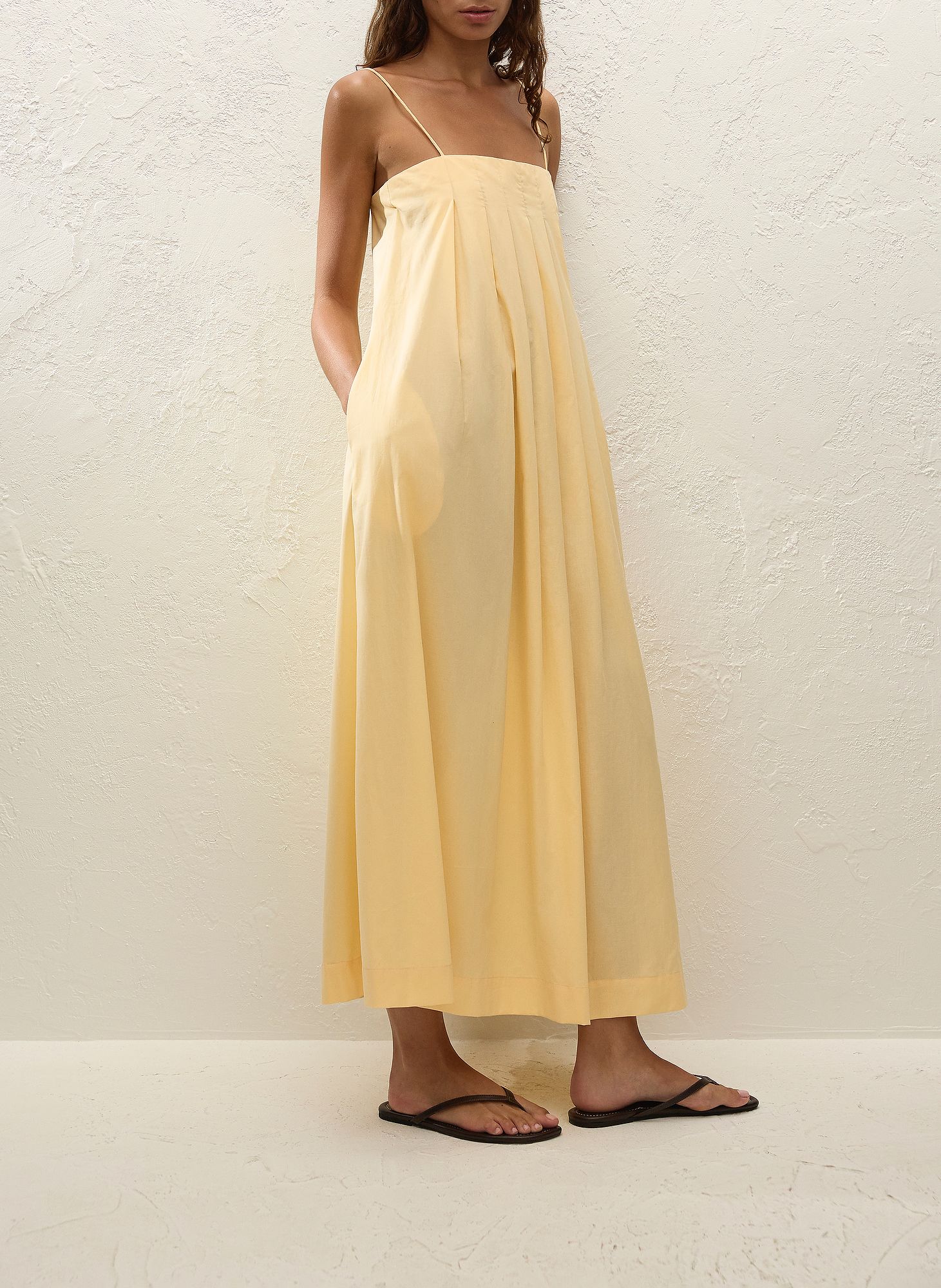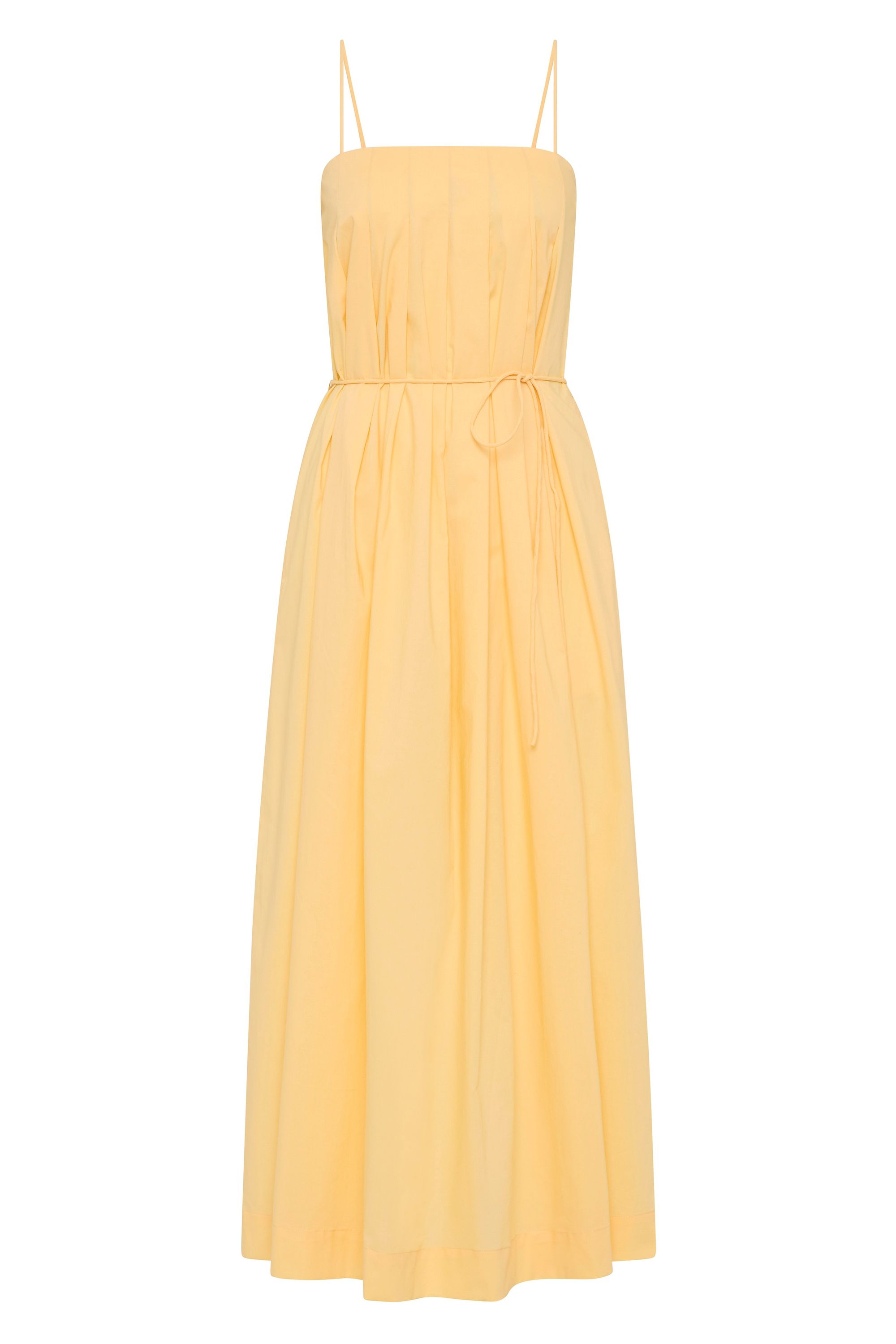 Dieses vom Urlaub inspirierte Maxikleid aus 100 % Baumwolle in einem warmen Gelbton besticht durch seinen geraden Ausschnitt mit Kellerfalte und schmalen, längenverstellbaren Trägern. Der fließende A-Linien-Schnitt mit separatem Taillenband ermöglicht eine individuelle Taillierung. Kombinieren Sie es mit schlichten Sandalen für sonnige Urlaubstage.