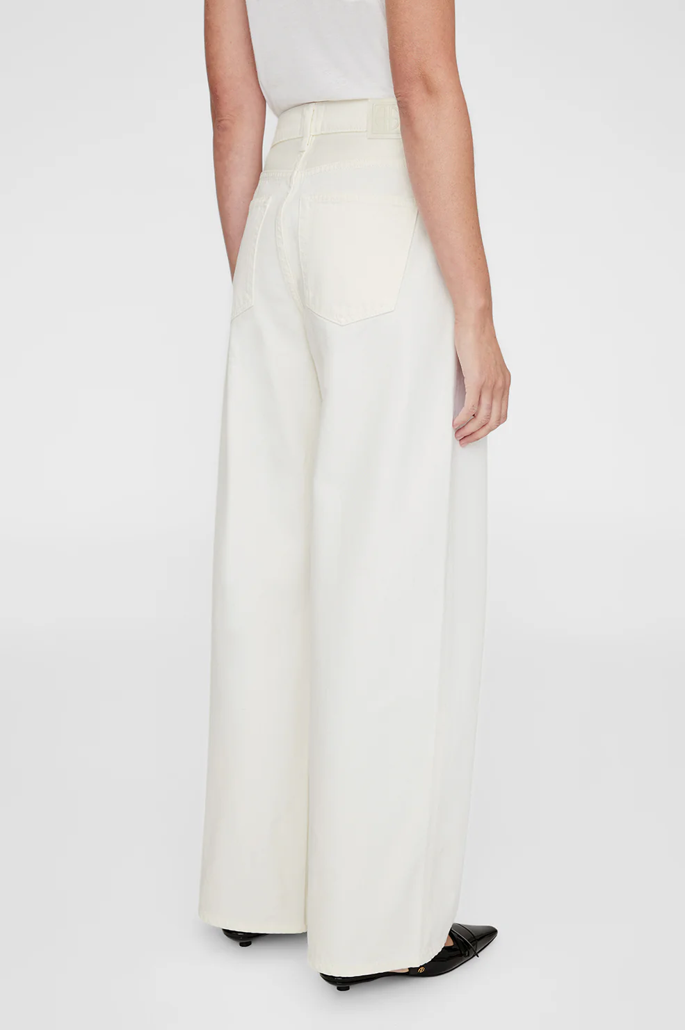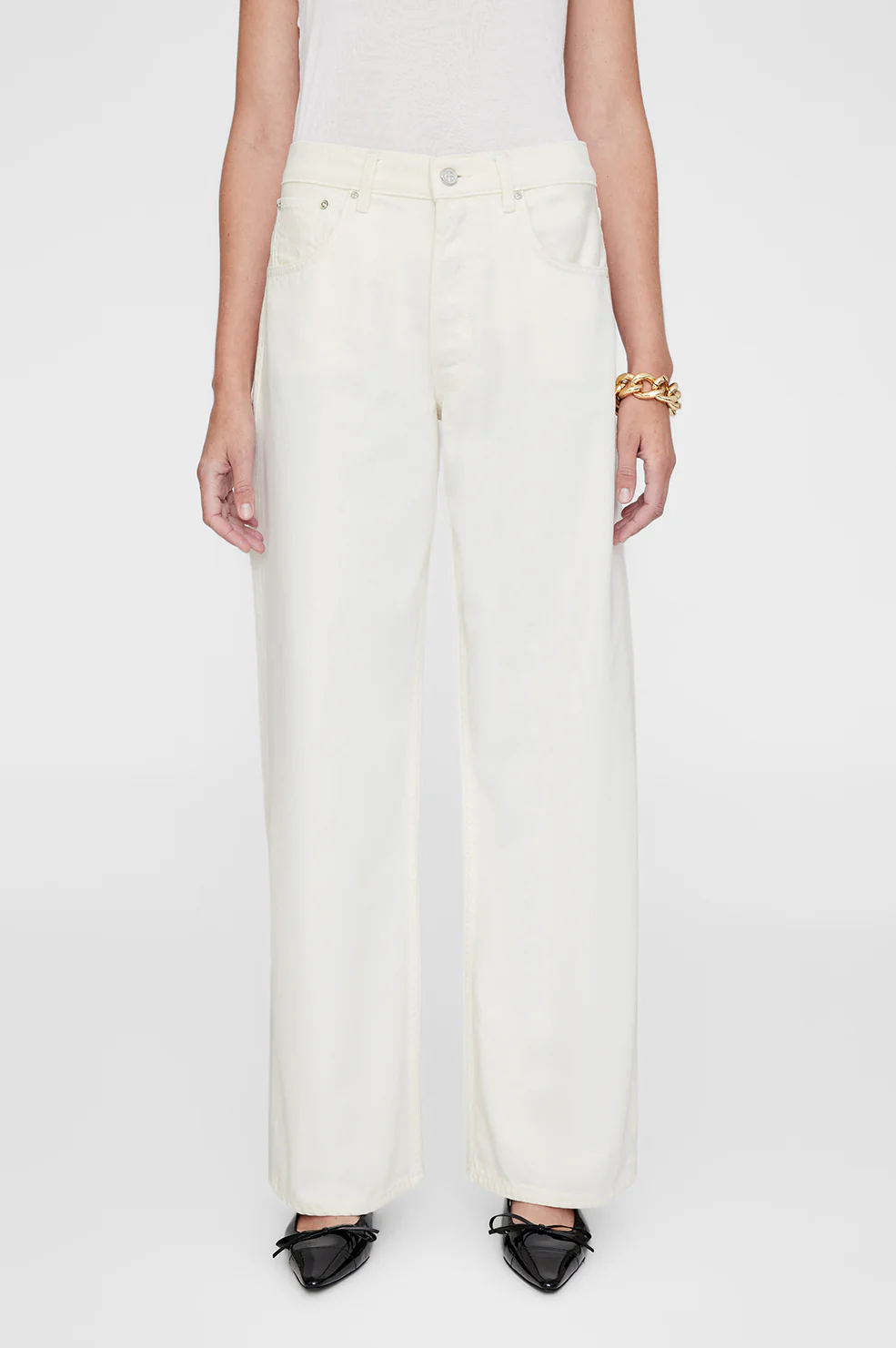 Die Manon-Jeans hat eine weite Silhouette und ist aus mittelschwerem, festem Denim aus recycelter Baumwolle ohne Stretch in einer cremefarbenen Waschung gefertigt.