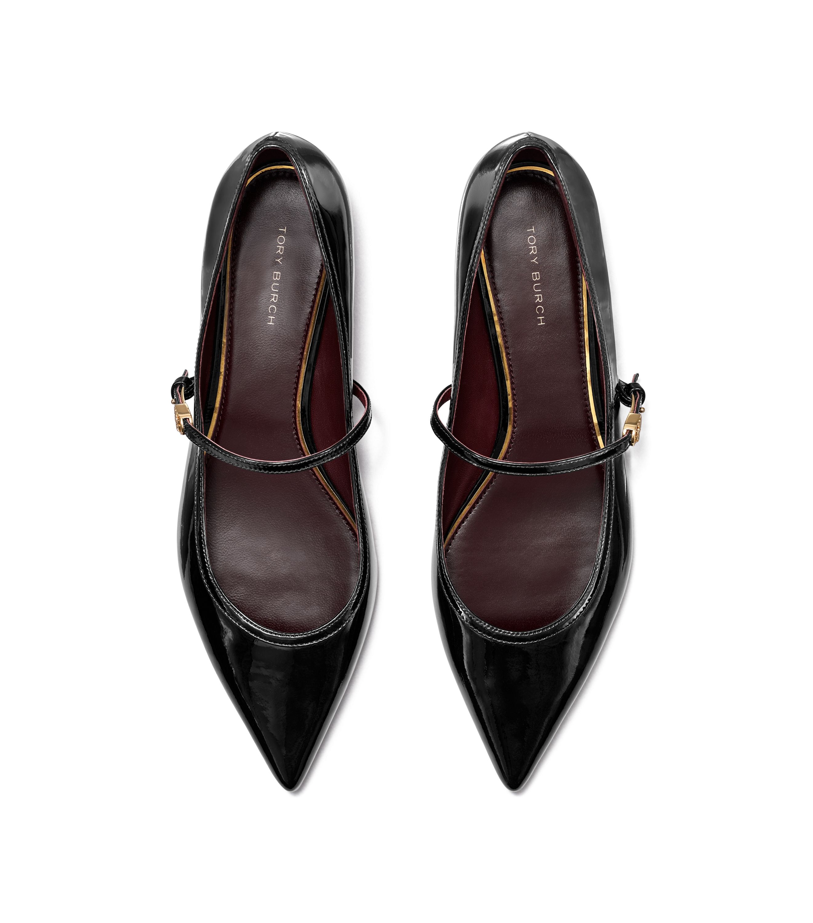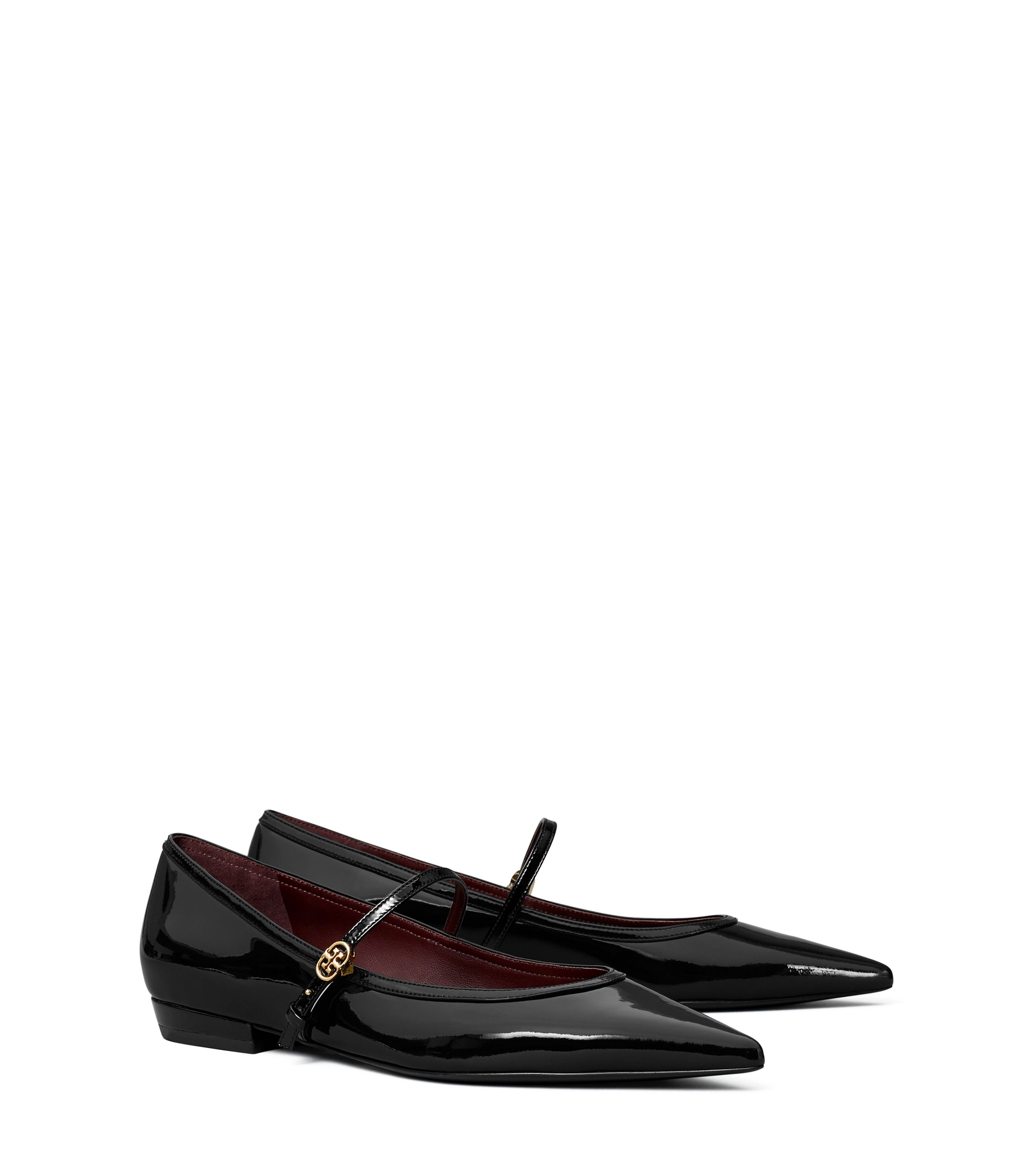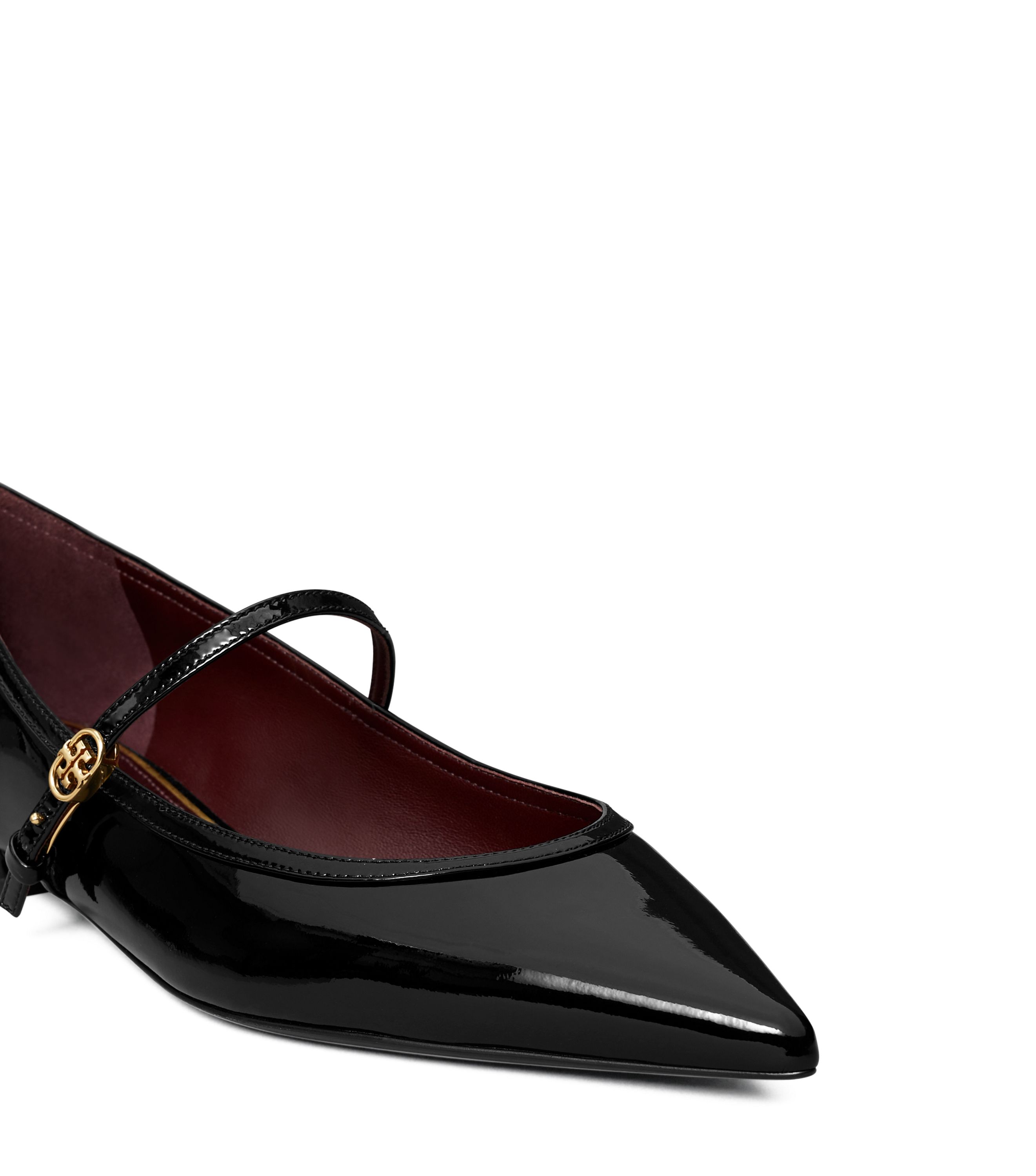 Dieser klassische Mary Jane mit edler Silhouette verfügt über eine spitze Zehenpartie und einen dezenten, niedrigen Absatz. Der elegante Flat aus Lackleder ist perfekt für jeden Tag.