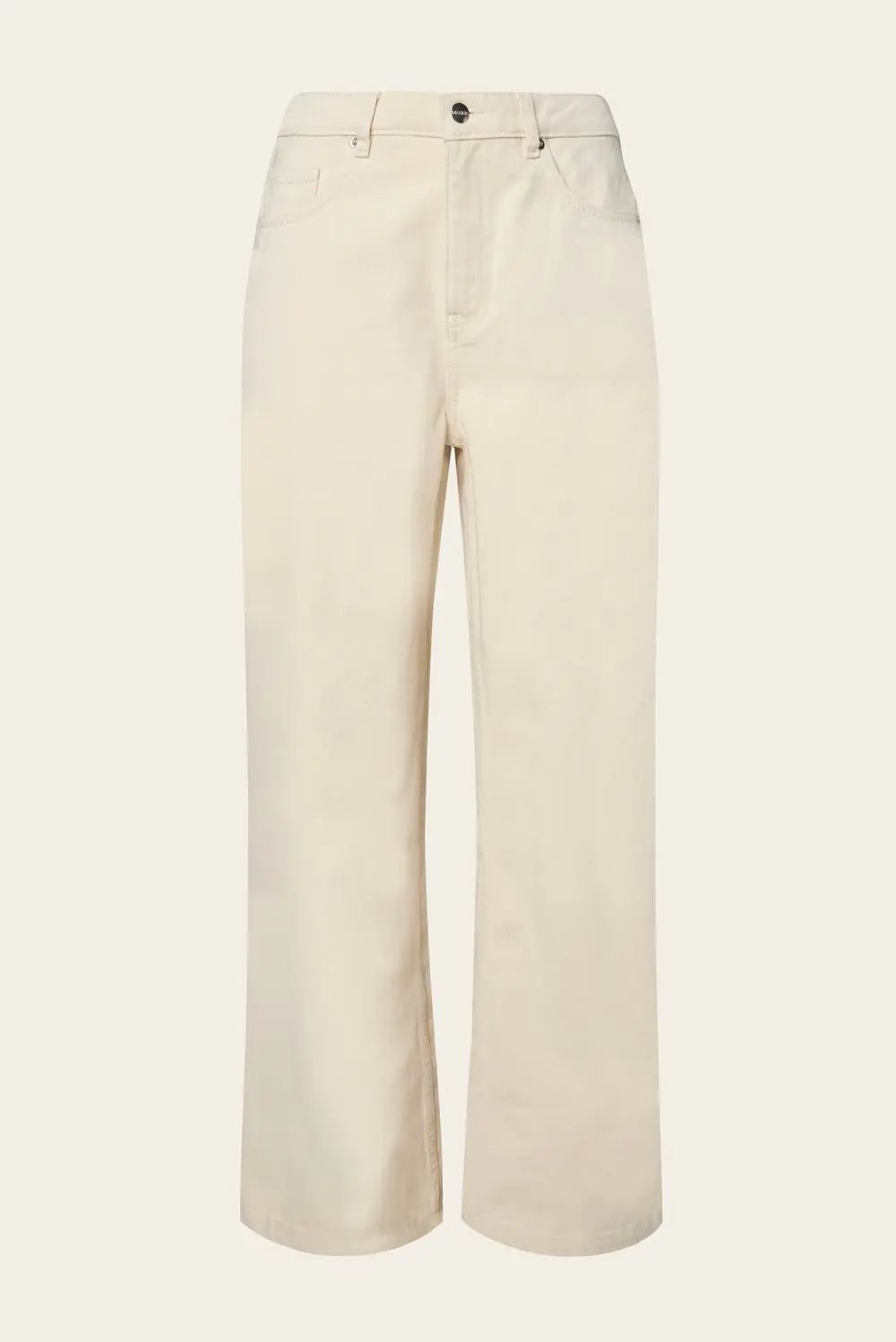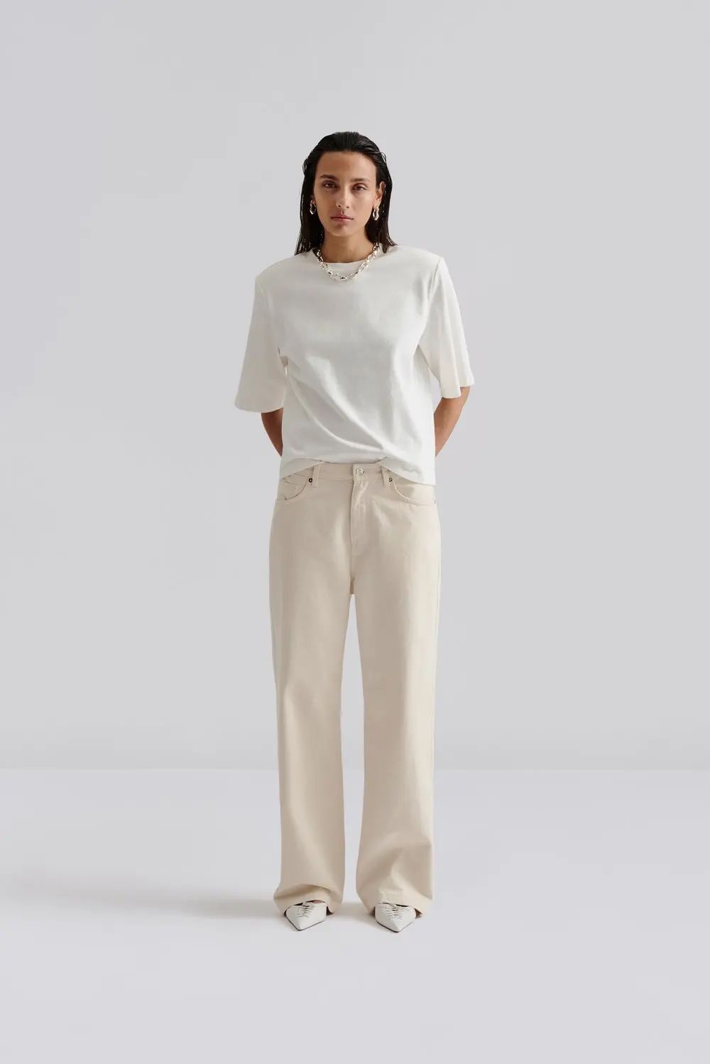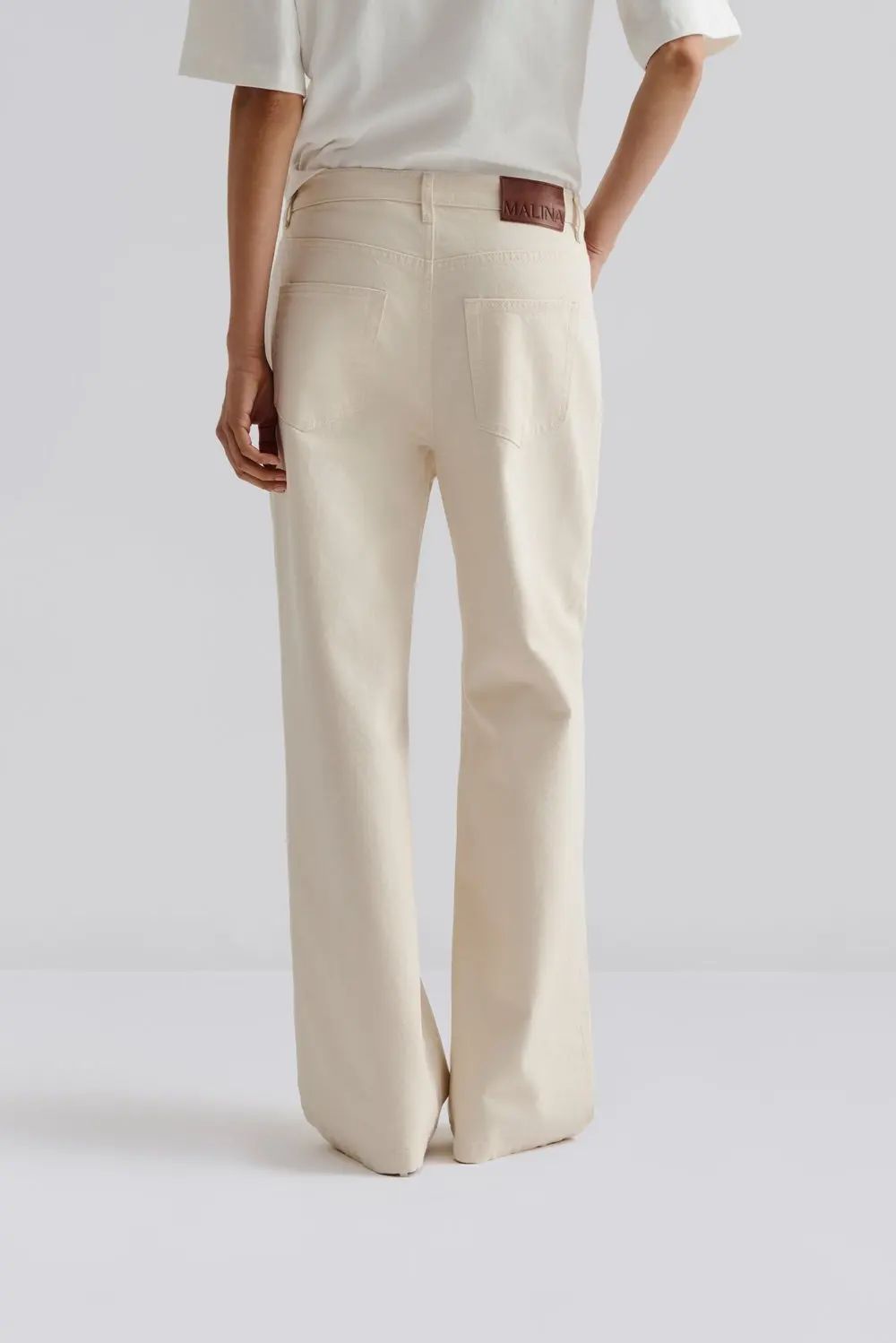 Hüftig geschnittene Jeans mit weitem Bein. Sie hat Gürtelschlaufen, fünf Taschen und einen Malina-Lederaufnäher.