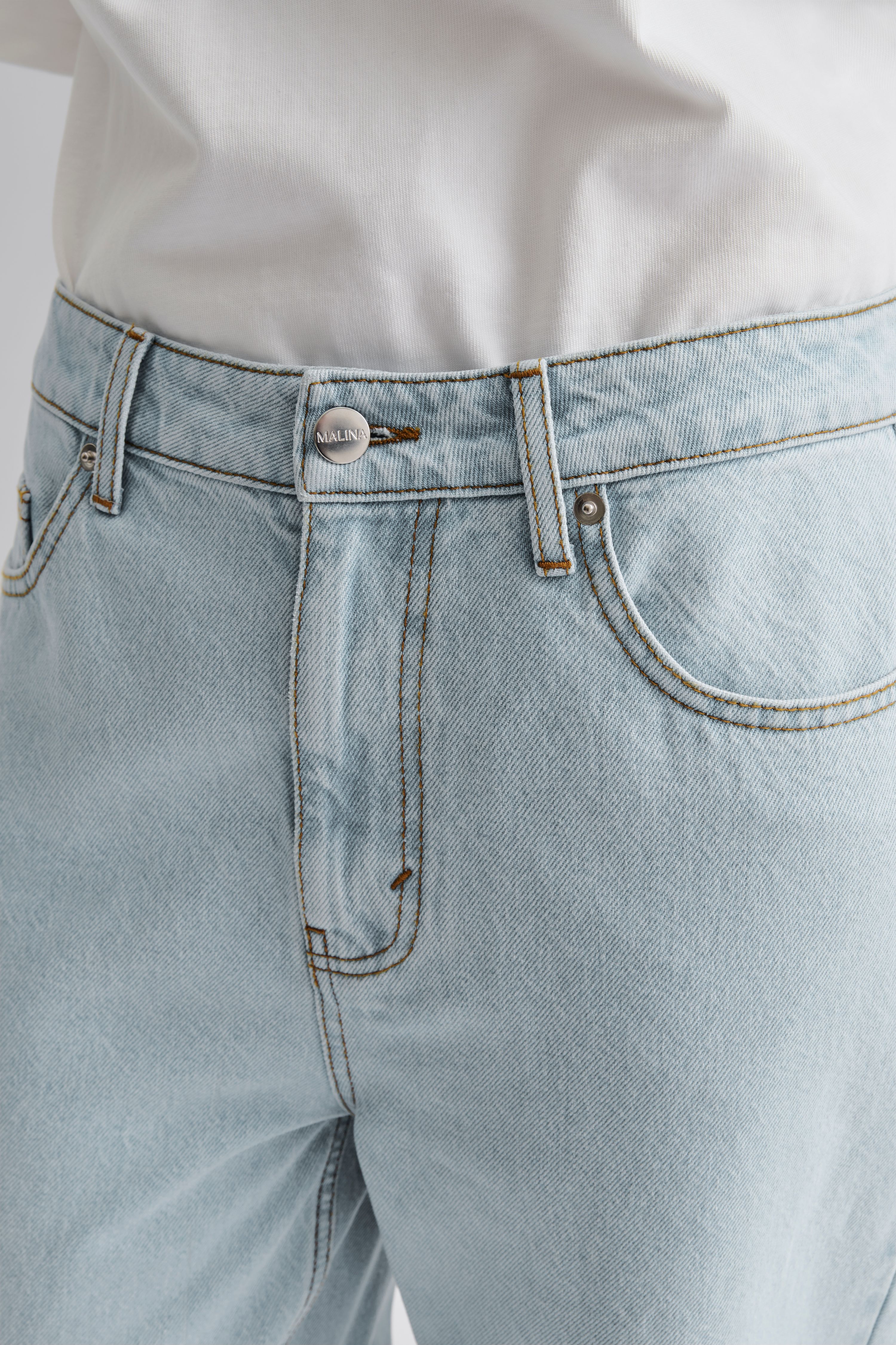 Denim-Jeans mit niedriger Leibhöhe und weitem Bein. Sie verfügen über Gürtelschlaufen, fünf Taschen und einen Malina-Lederaufnäher.