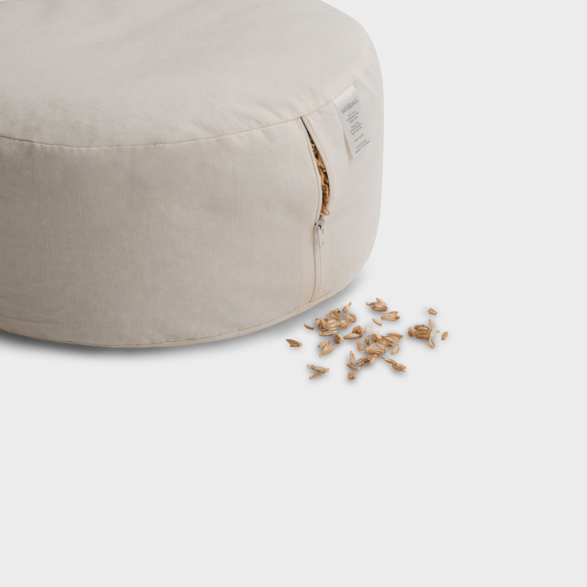 Das Meditationskissen besteht aus Inlet und Bezug. Am Boden des Bezugs befindet sich ein dezenter Reissverschluss, über den das Kissen geöffnet werden kann. Das Inlet kann über einen Reissverschluss geöffnet werden, damit du Füllmaterial entnehmen, hinzufügen oder austauschen kannst.