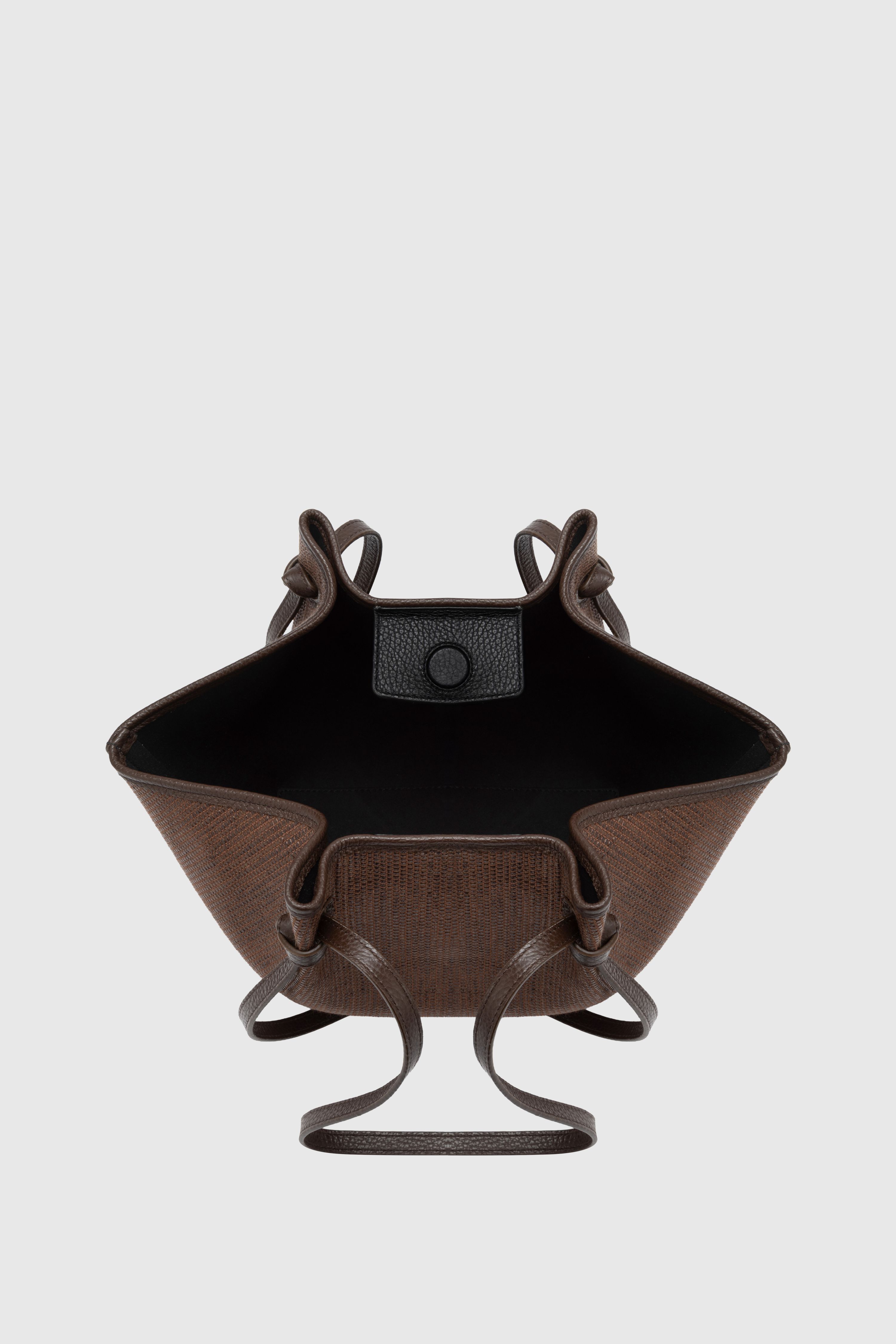 Mochi ist unsere elegante Alltagstasche. Sie besticht durch ihre charakteristischen organischen Kurven, Falten und Knoten und ist aus fein gewebtem Raffia-Material mit schwarzen Lederriemen gefertigt.