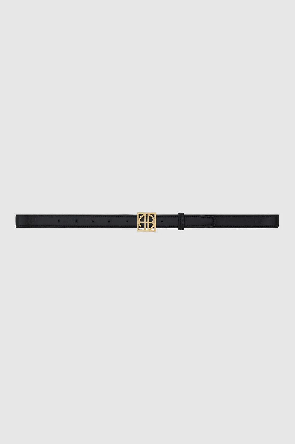 Ein zeitloser Gürtel aus glattem, leicht glänzendem Leder. Dieser moderne Stil wird durch eine quadratische Monogrammschnalle mit goldfarbenen Metallteilen aufgewertet.