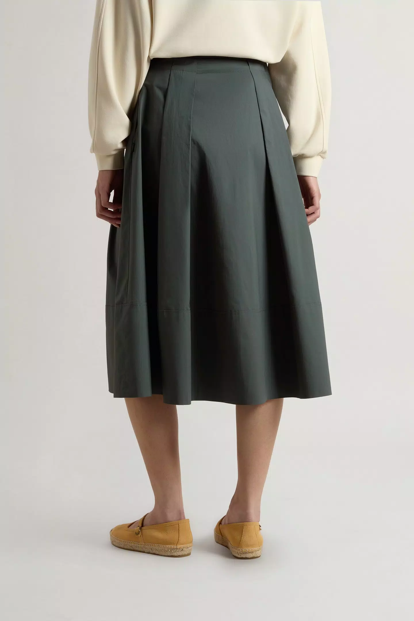 Dieser Rock aus Popeline aus reiner Baumwolle drückt eine sommerliche Leichtigkeit aus, die Ihrer Bewegung kontinuierlich folgt. Der frische und kompakte Stoff behält eine klare Linie bei, die durch die Falten auf der Vorderseite, welche die Silhouette erweitern, definiert wird. Die Gürtelschlaufen ermöglichen es, das Styling mit einem Gürtel zu personalisieren, während die Taschen dem Design, das durch das seitliche Logoetikett ergänzt wird, eine praktische Note verleihen.