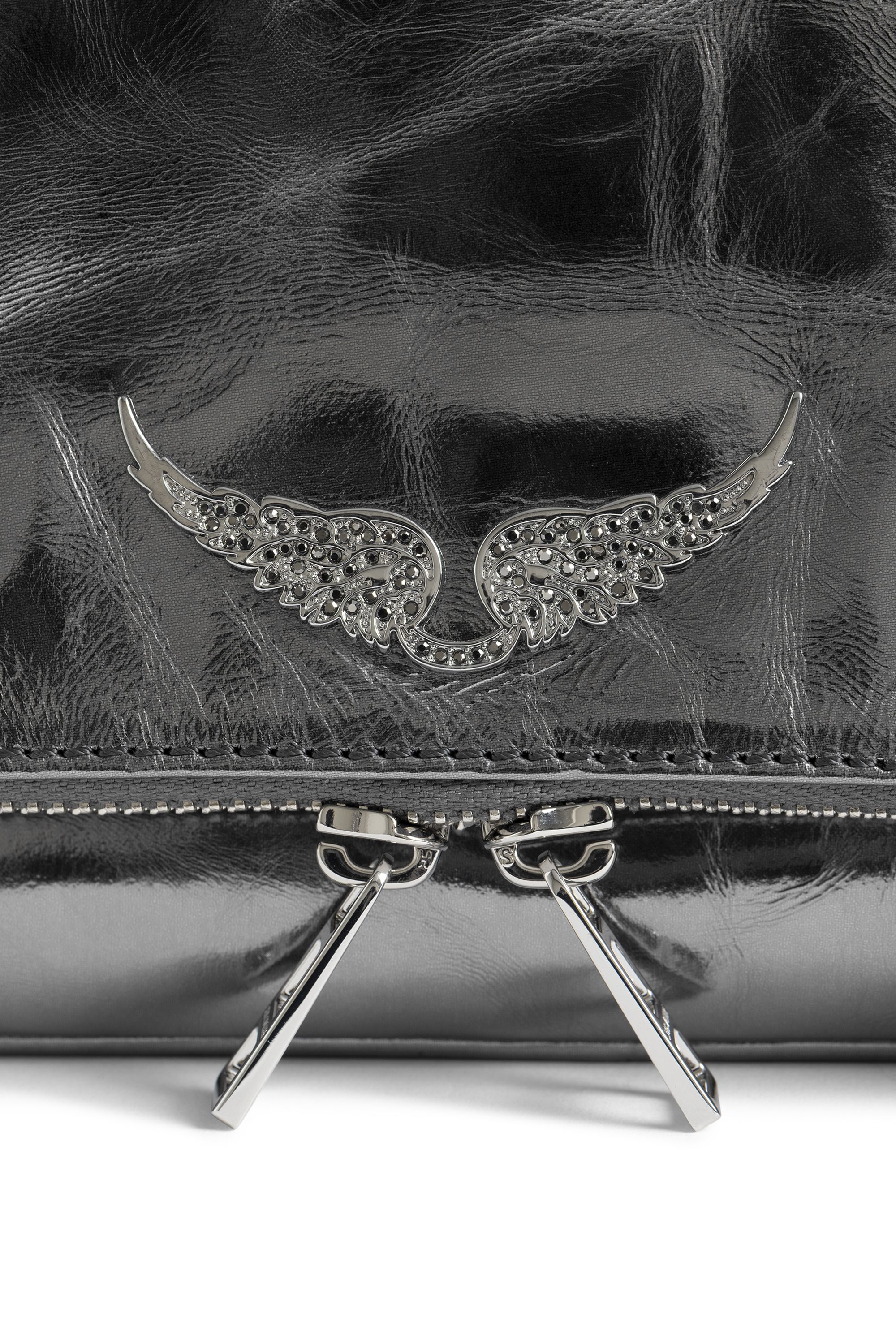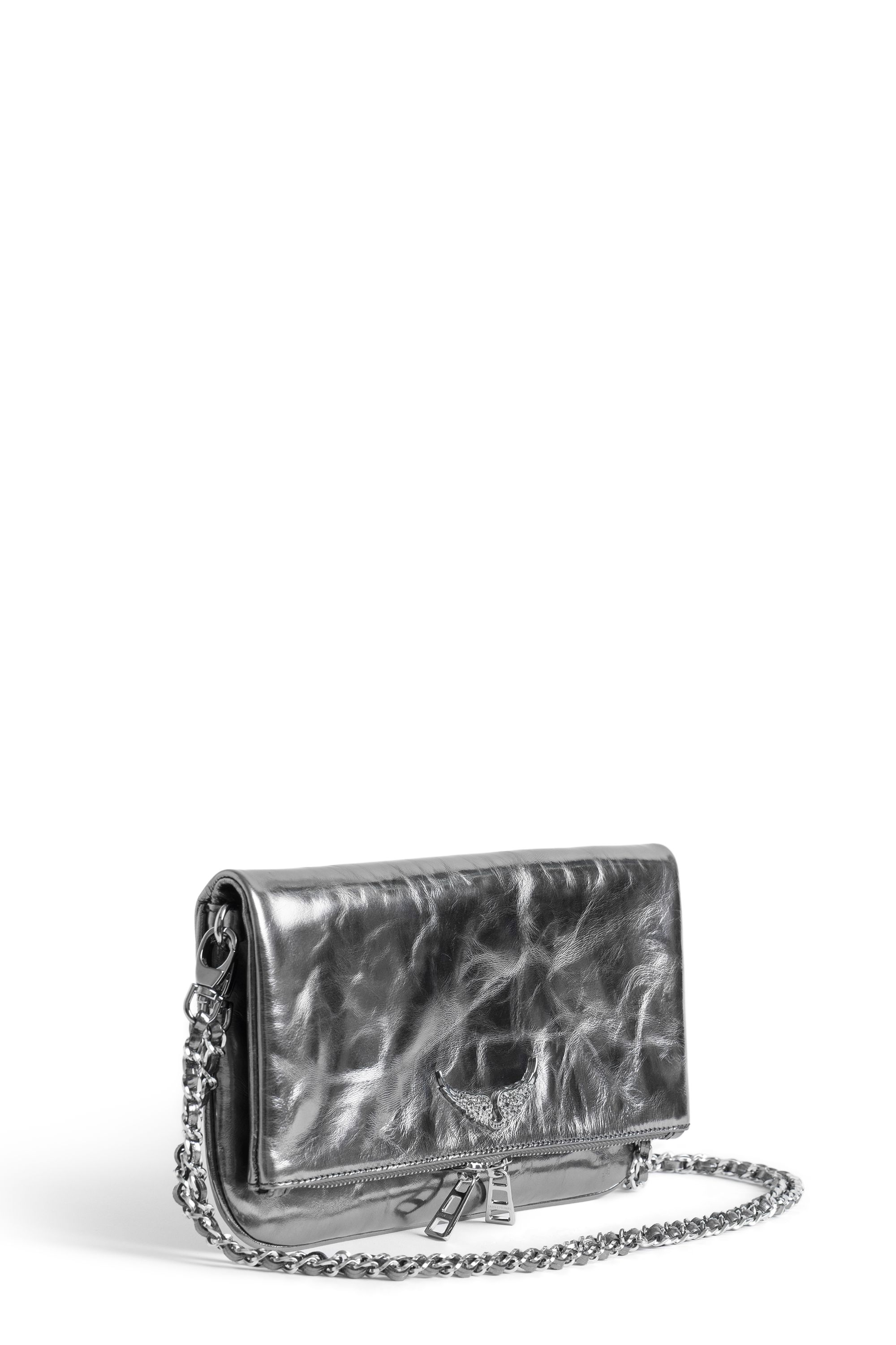 Clutch aus metallisiertem Leder mit doppelten Ketten aus Leder und Metall und mit Strass verzierten Flügeln.