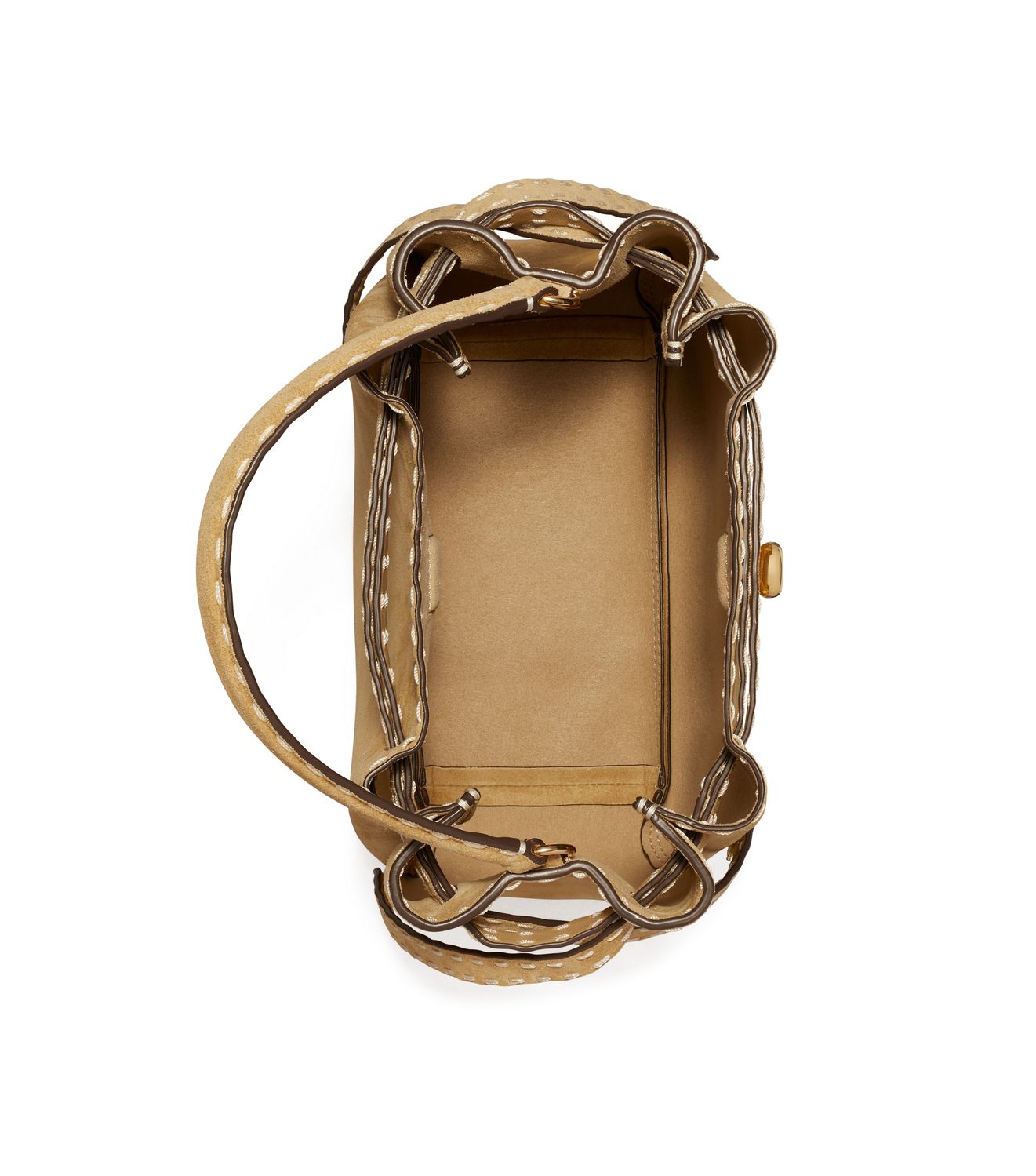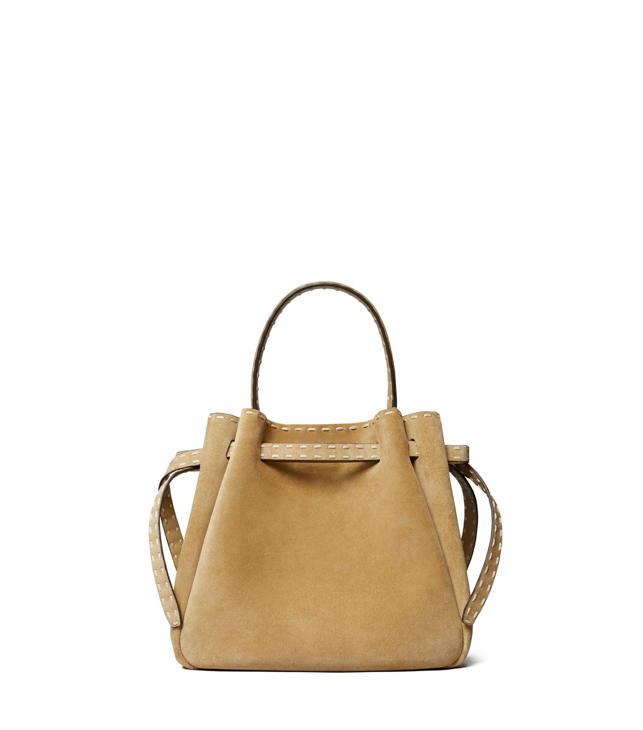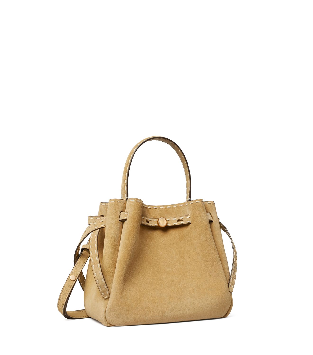 Die ultimative Handtasche für jeden Tag. Die Romy Bucket Bag mit Heftnaht ist aus gebürstetem italienischem Wildleder gefertigt und verfügt über handgenähte Details sowie eine sanft geraffte Silhouette. Die leichte, geräumige Tasche bietet Platz für Smartphone, Geldbörse, Tablet und Schlüssel. Hinzu kommen ein schmaler Riemen und unser neues Knopflogo. Sie kann entweder am Tragegriff oben oder als Crossbody Bag getragen werden.